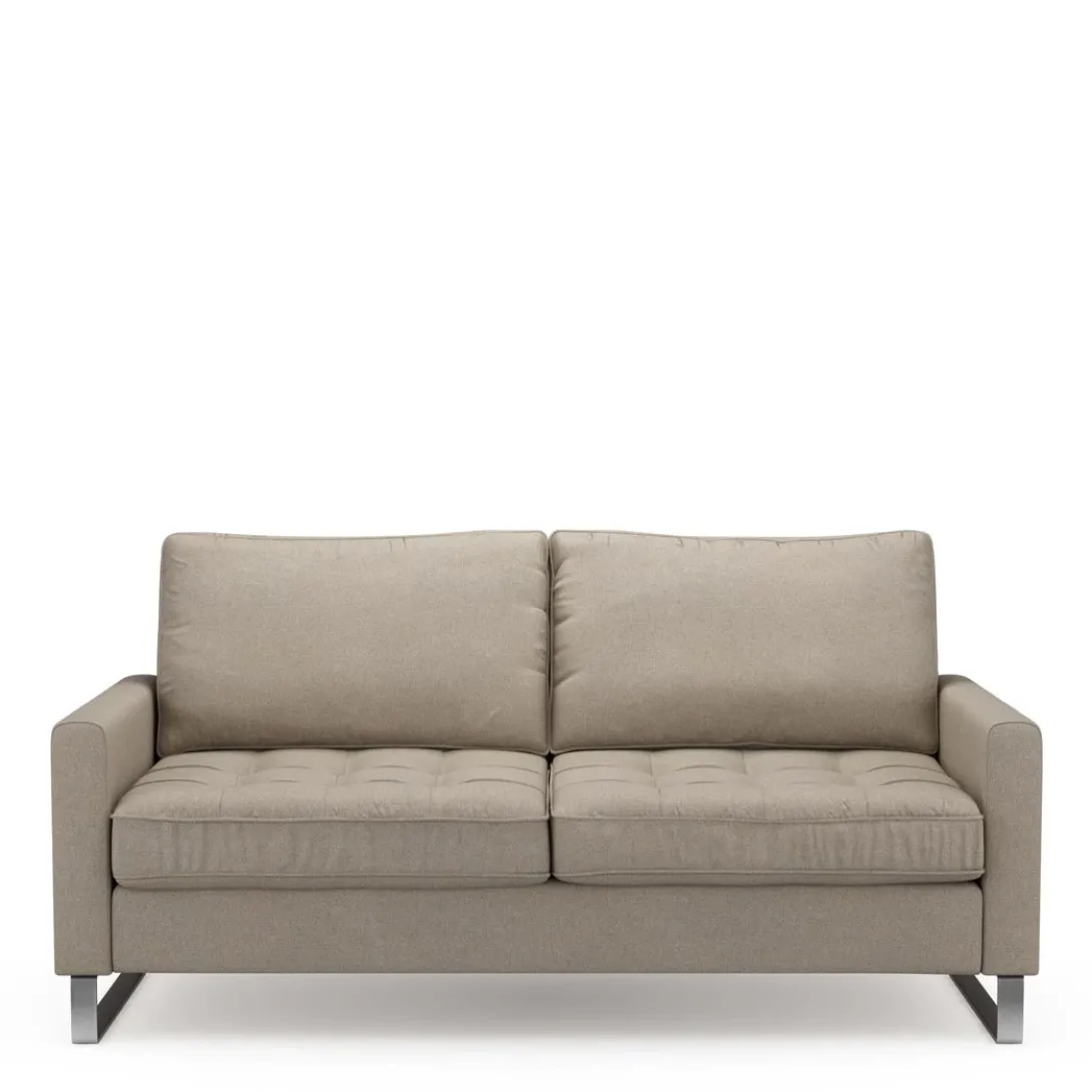 Een stoere bank op ijzeren poten, een 2,5-zitter, maar plaats voor 3 als de zitvlakken niet te breed zijn. Hij is stoer, hij is stevig en hij zit heel lekker. Gemaakt van beukenhout, polyester en ijzer. Vlekken kunnen voorzichtig met de hand worden weggehaald. Er zijn verschillende kleuren en materialen voor de bekleding beschikbaar. De maat: 170 x 90 x 85 cm.