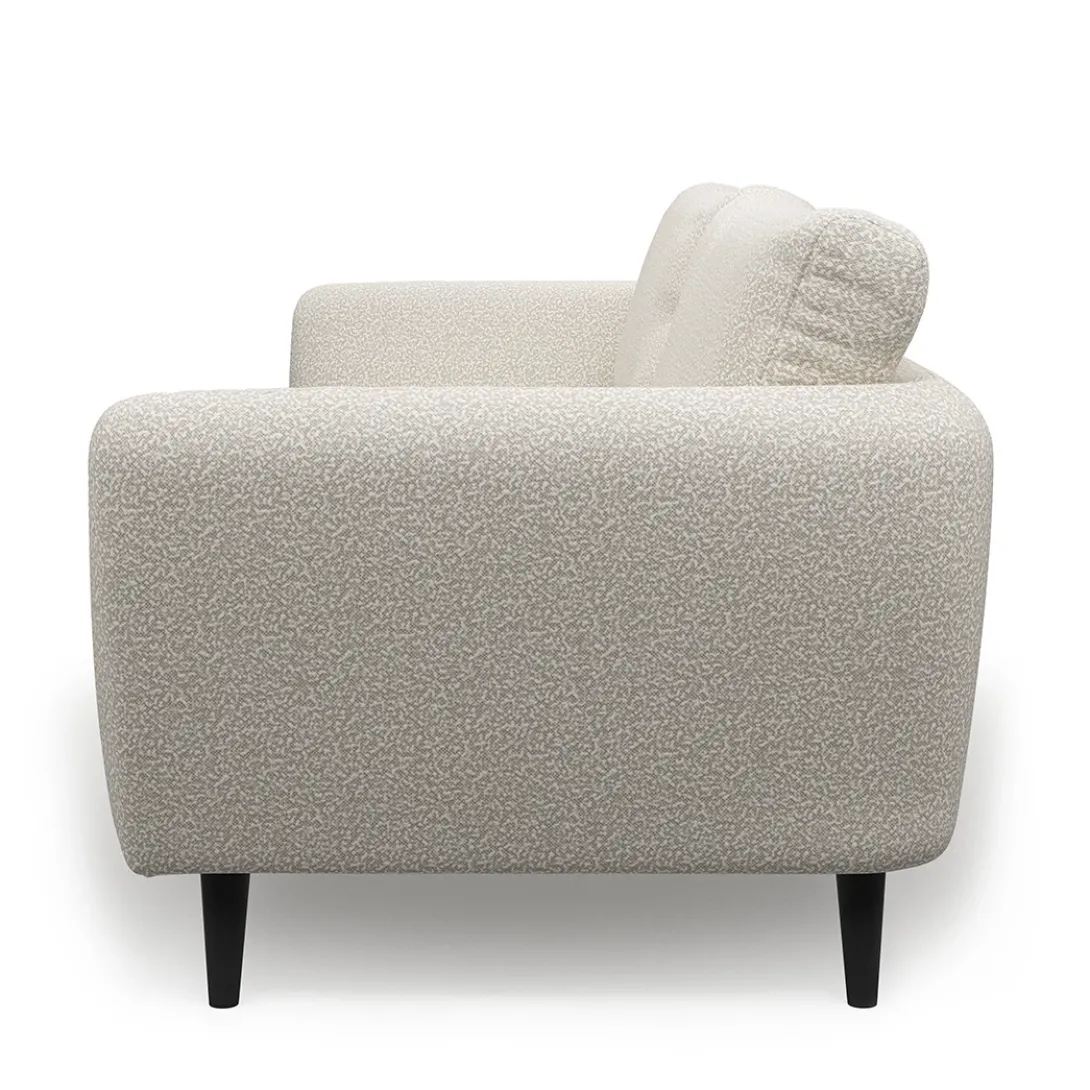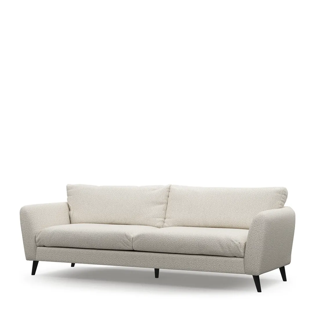 Voor een strak interieur is deze Sophia 3,5-zits bank een prachtig ontwerp. De armleuningen zijn licht naar buiten gebogen, waardoor er meer comfort is. De twee grote zitkussens zijn van hoge kwaliteit. De bekleding is van bouclé in de kleur simply white. Het frame van de bank is van beukenhout.