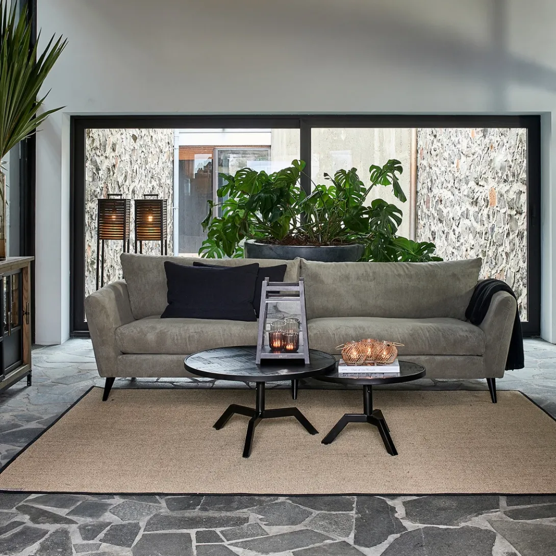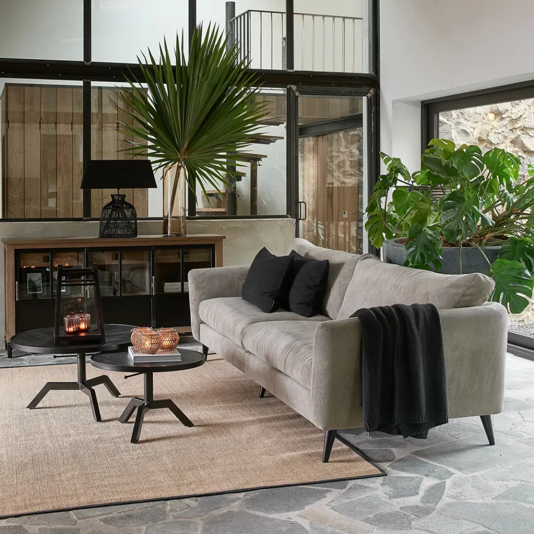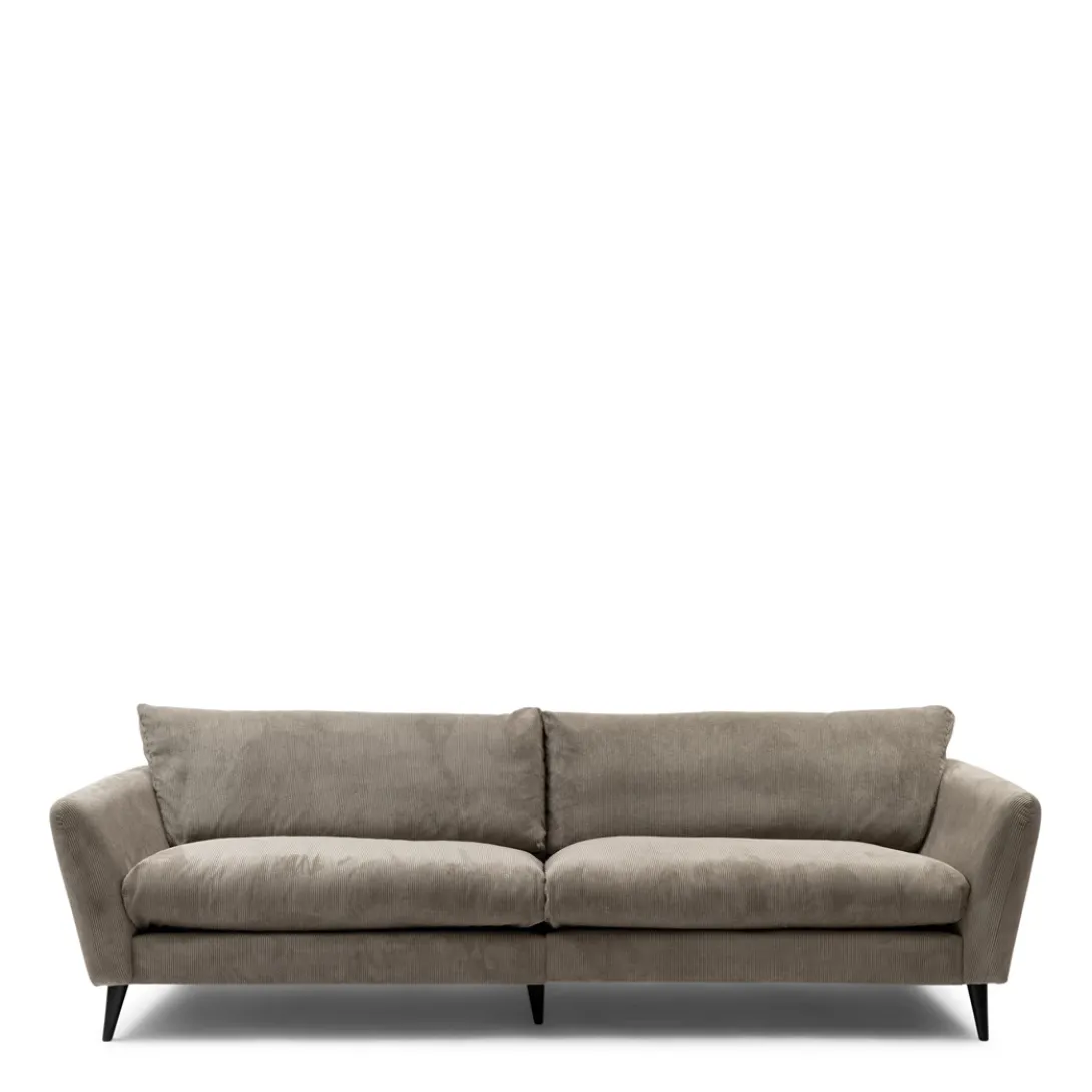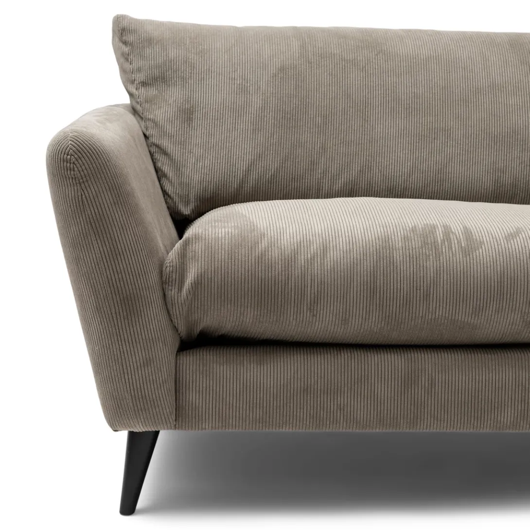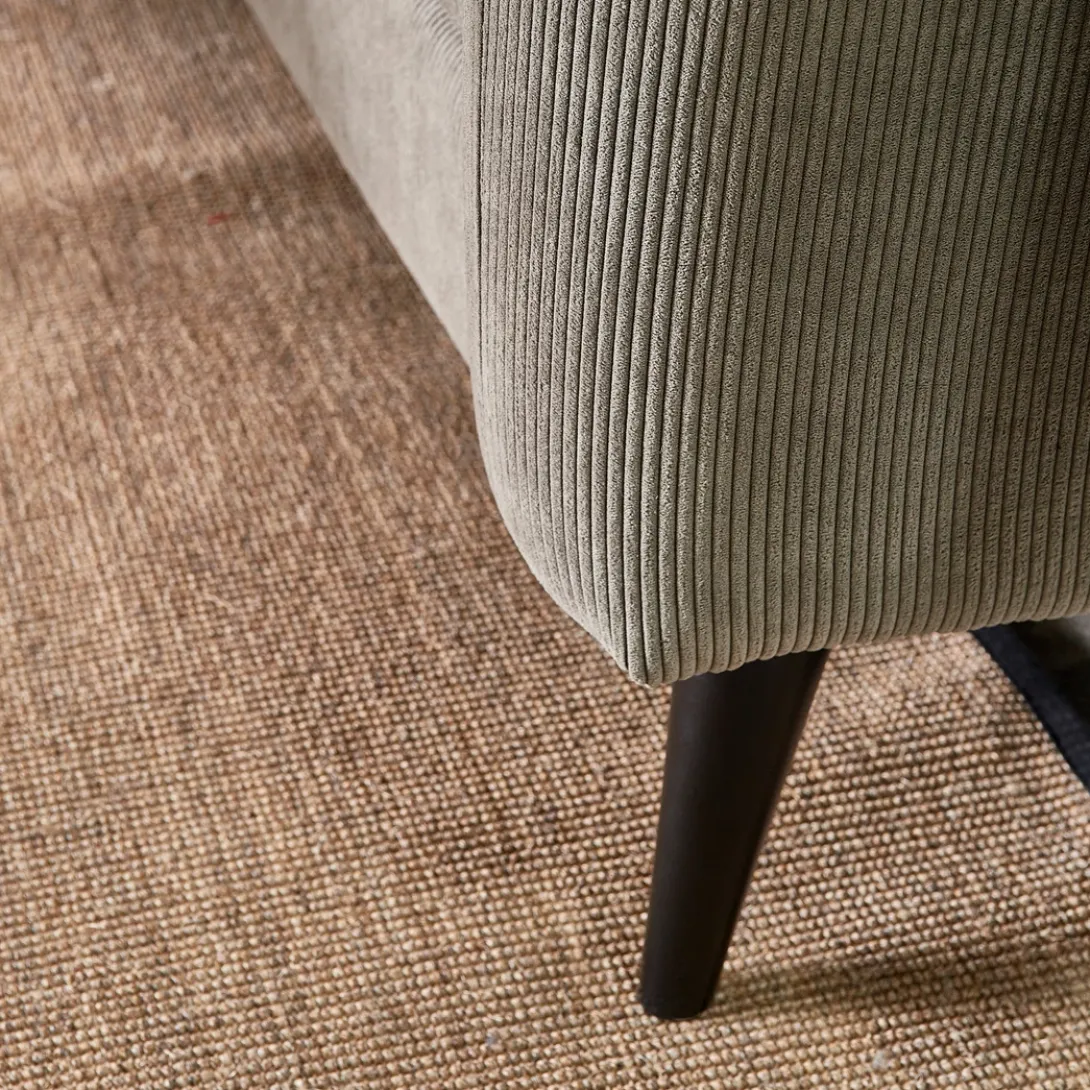 Voor een strak interieur is deze Sophia 3,5-zits bank een prachtig ontwerp. De armleuningen zijn licht naar buiten gebogen, waardoor er meer comfort is. De twee grote zitkussens zijn van hoge kwaliteit. De bekleding is van english rib in de kleur thyme. Het frame van de bank is van beukenhout.