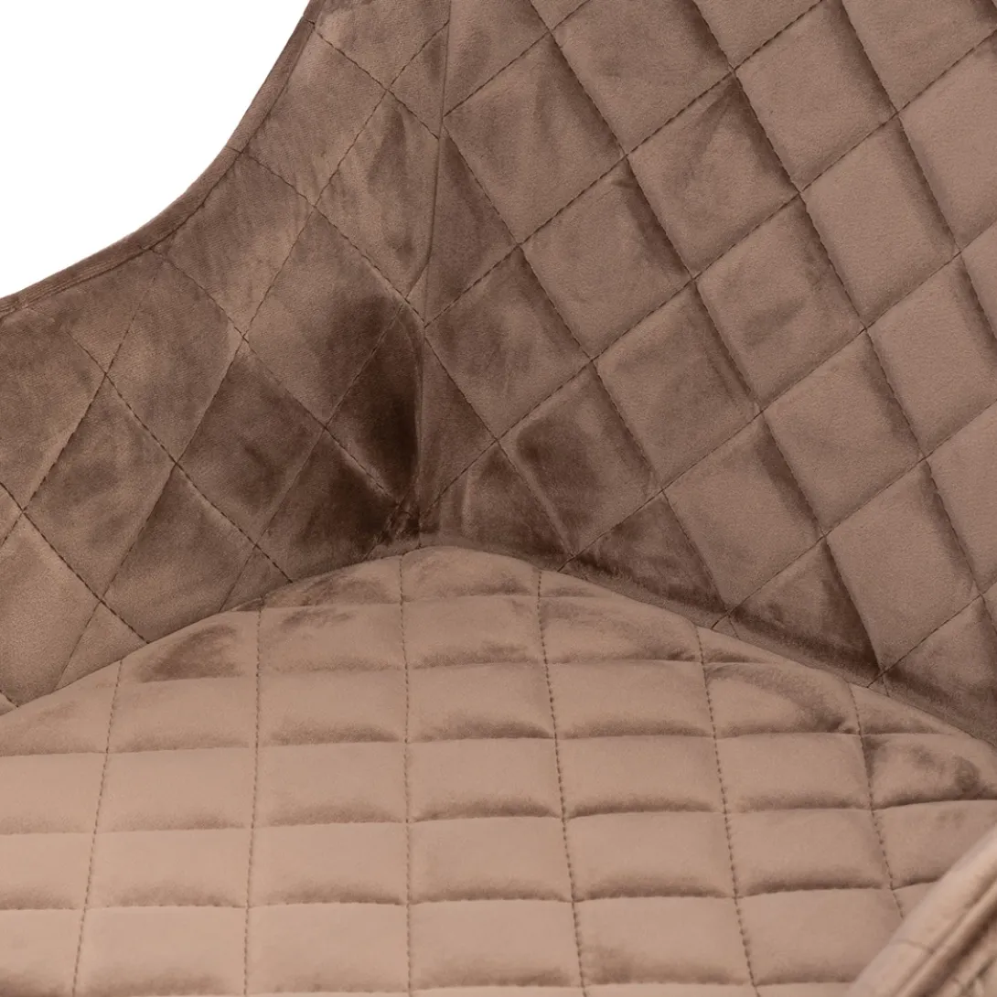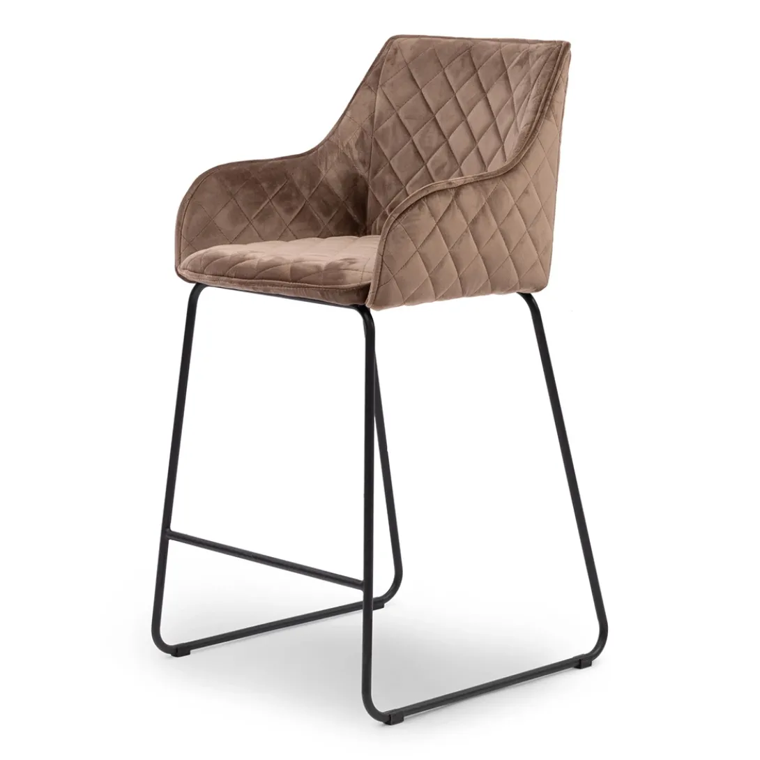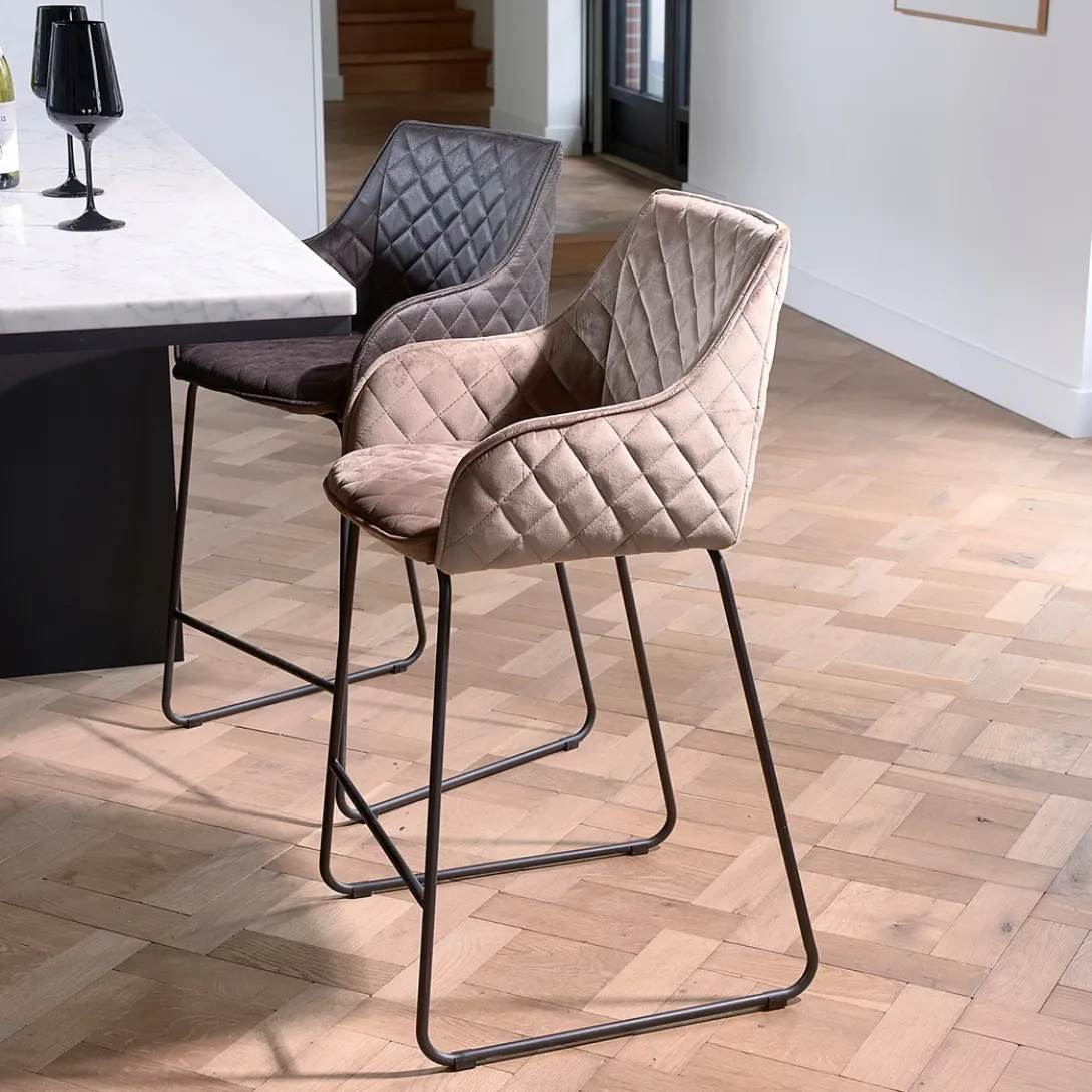 De Frisco Drive Counter Stool is een barkruk uitgevoerd in stevig velvet en verkrijgbaar in verschillende kleuren. De bekleding van de velvet barstoel heeft een doorgestikt ruitpatroon. De stoel heeft een verfijnd, donker ijzeren onderstel. Ook verkrijgbaar in andere materialen.