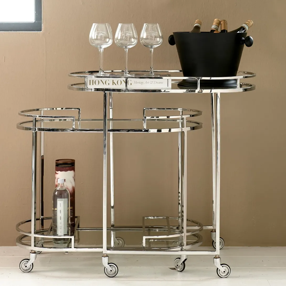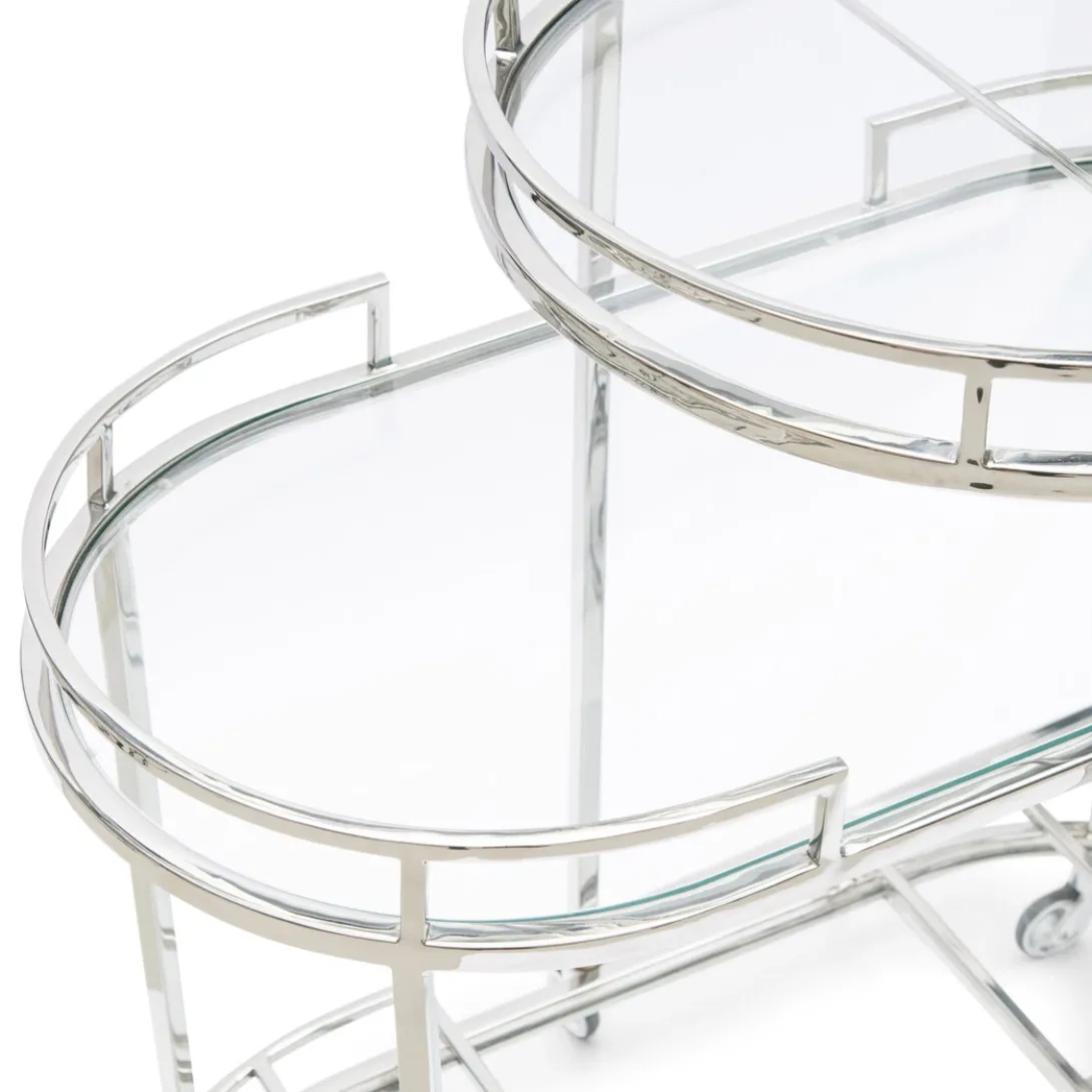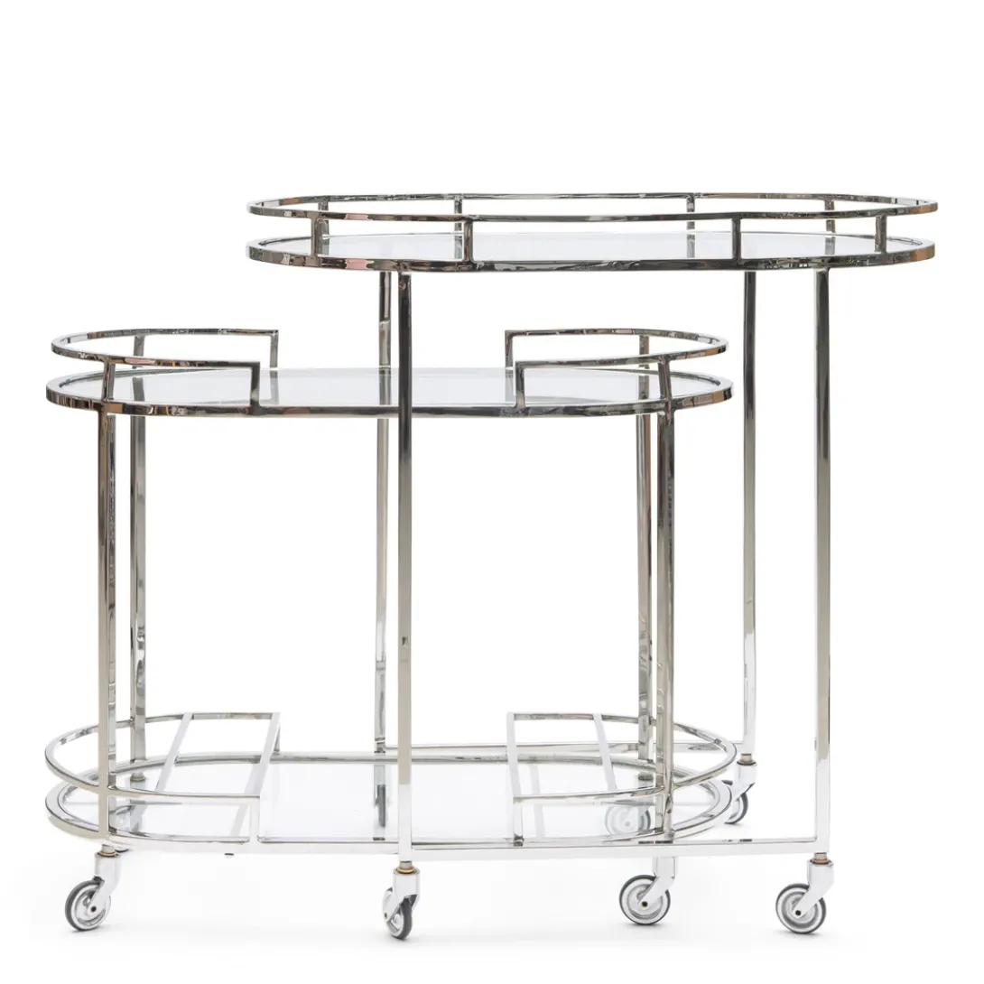 De Crosby Street Bar Cart is een luxe set van twee bijzettafels die niet misstaan in een glamoureuze loft. Presenteer je mooiste glazen, karaffen en beste drankjes op deze tafeltjes met ovale glazen bladen en opstaande rand. Beide delen hebben wieltjes, waardoor je ze opgeruimd boven elkaar zet of juist eenvoudig met iets lekkers erop richting je familie of gasten rijdt. Het frame van de bijzettafels is gemaakt van roestvrij staal.