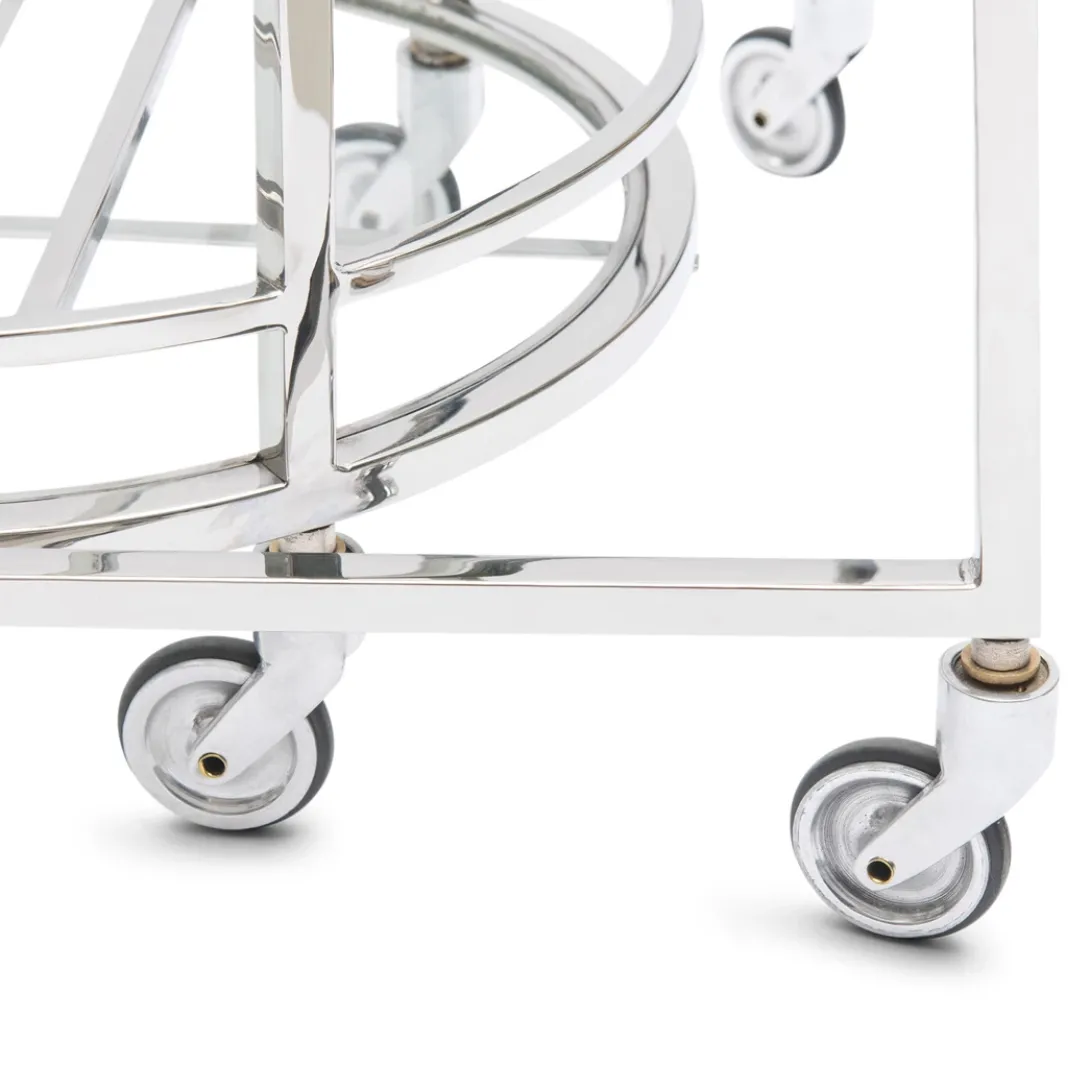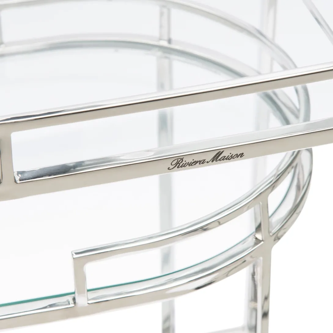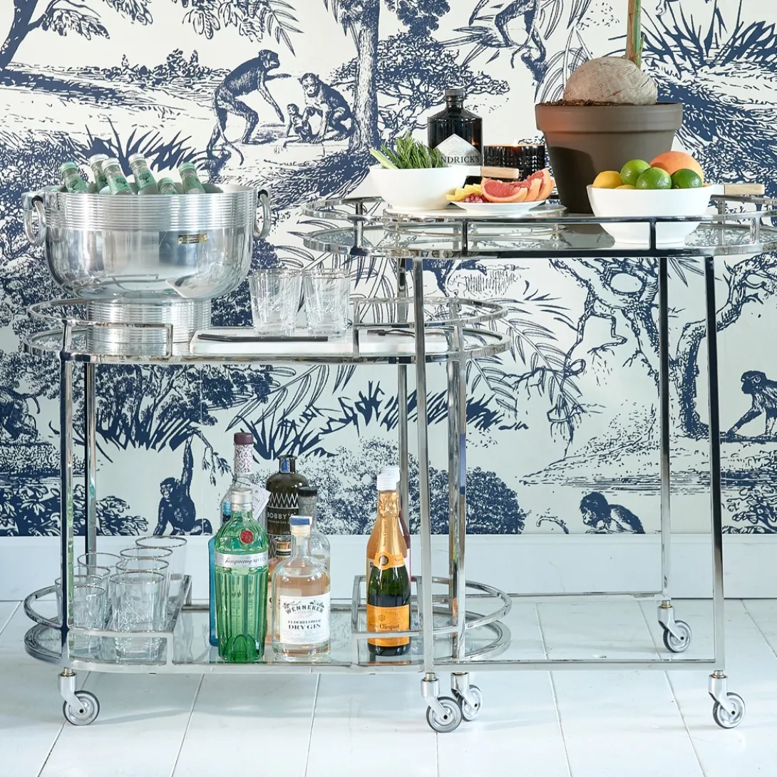 De Crosby Street Bar Cart is een luxe set van twee bijzettafels die niet misstaan in een glamoureuze loft. Presenteer je mooiste glazen, karaffen en beste drankjes op deze tafeltjes met ovale glazen bladen en opstaande rand. Beide delen hebben wieltjes, waardoor je ze opgeruimd boven elkaar zet of juist eenvoudig met iets lekkers erop richting je familie of gasten rijdt. Het frame van de bijzettafels is gemaakt van roestvrij staal.