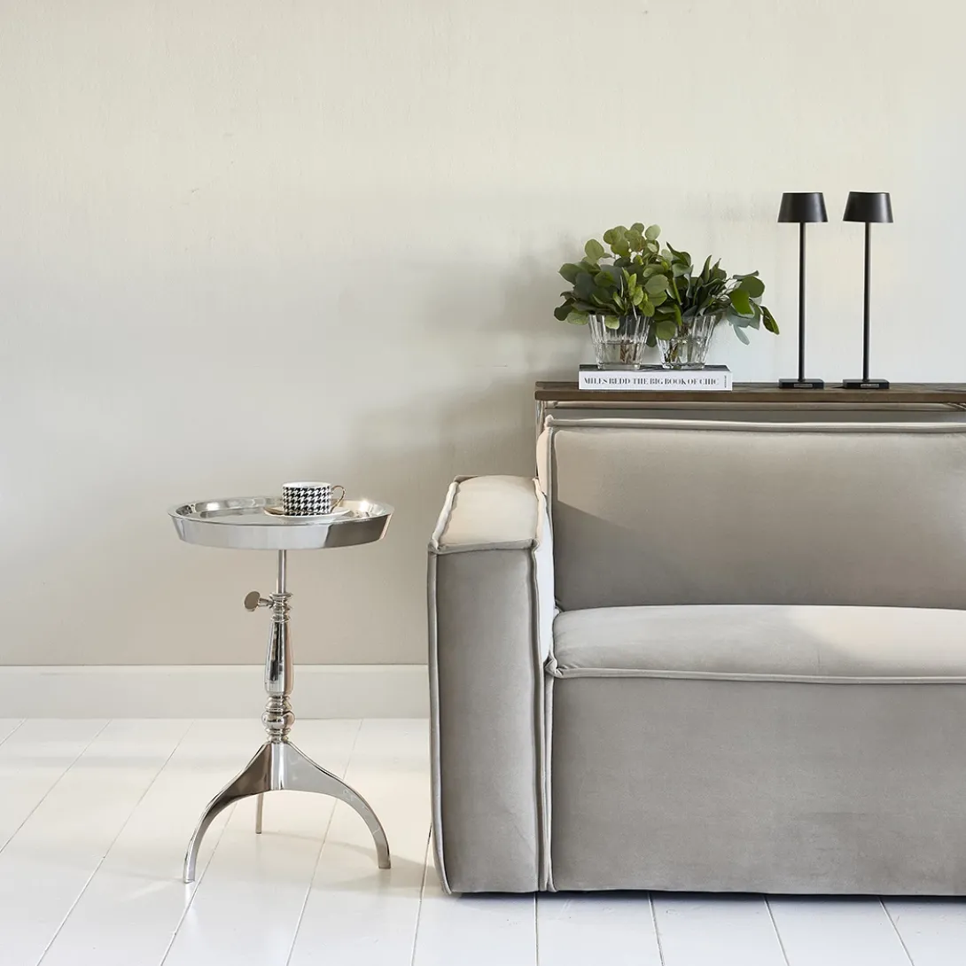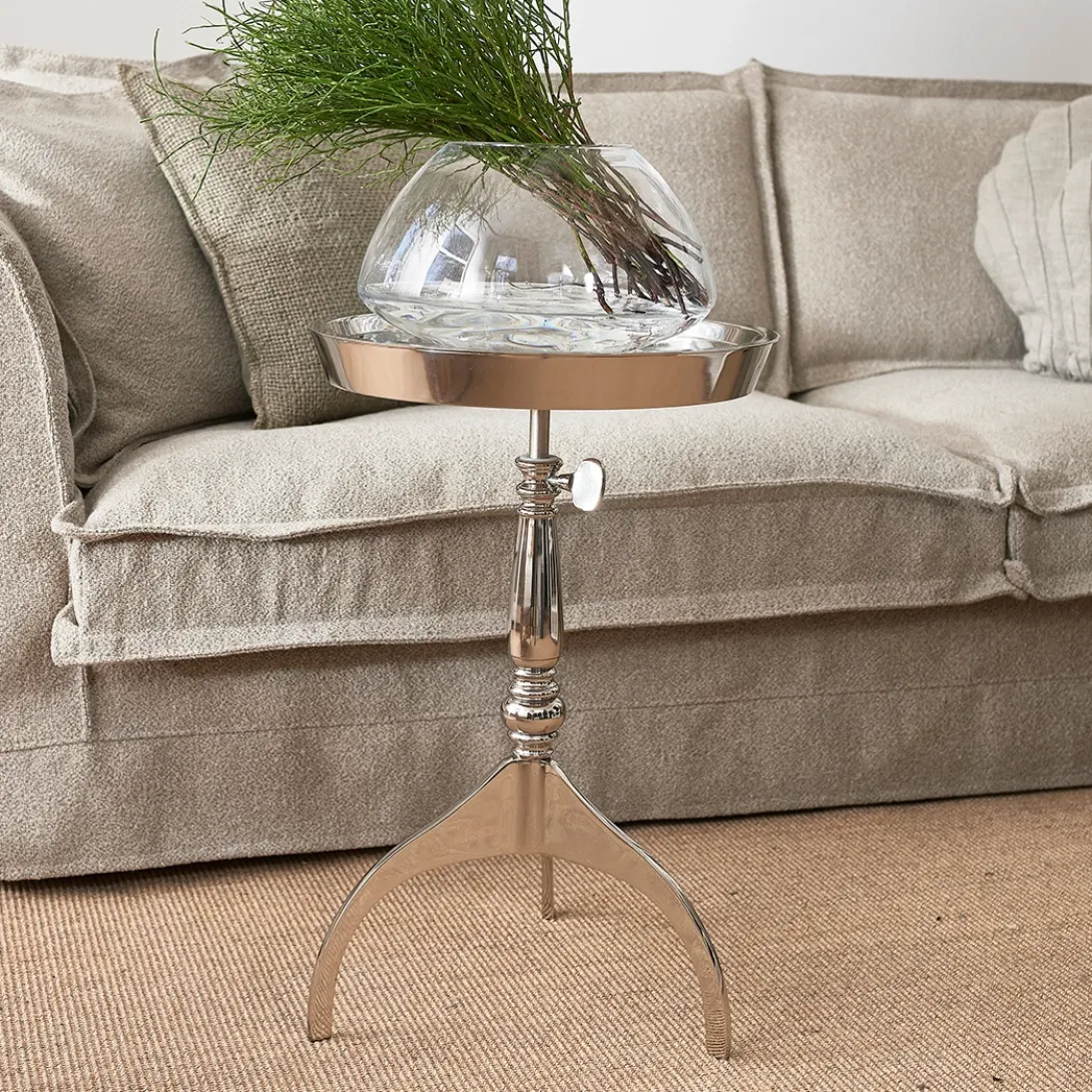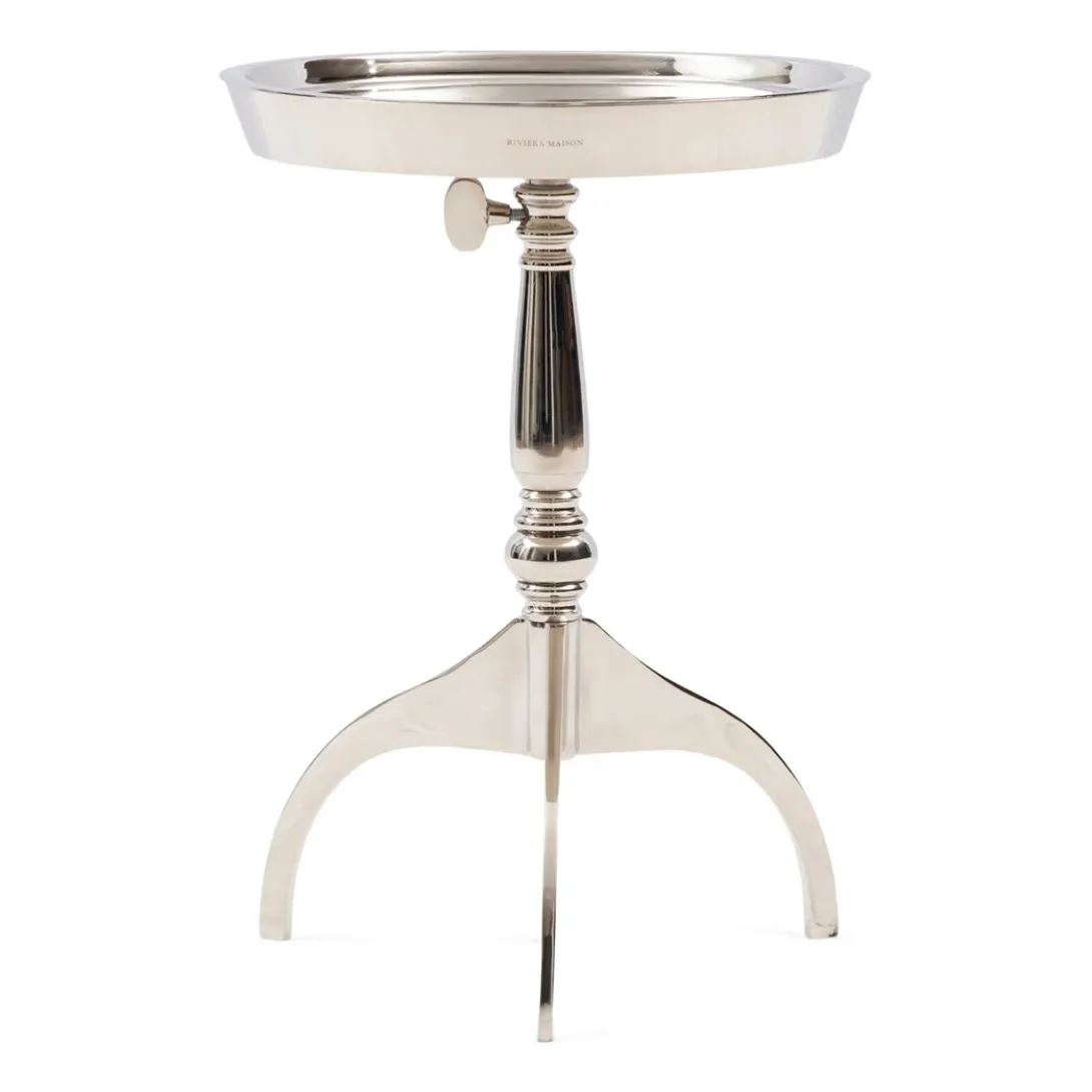Dit bijzettafeltje van aluminium kan in hoogte worden versteld. Het tafeltje heeft een bewerkte poot met drie voetjes. Leuk detail: je kunt het bovenste blad eruit halen. Dan blijft er een tafeltje met wat diepte over. Daar kun je iets leuks op zetten.
