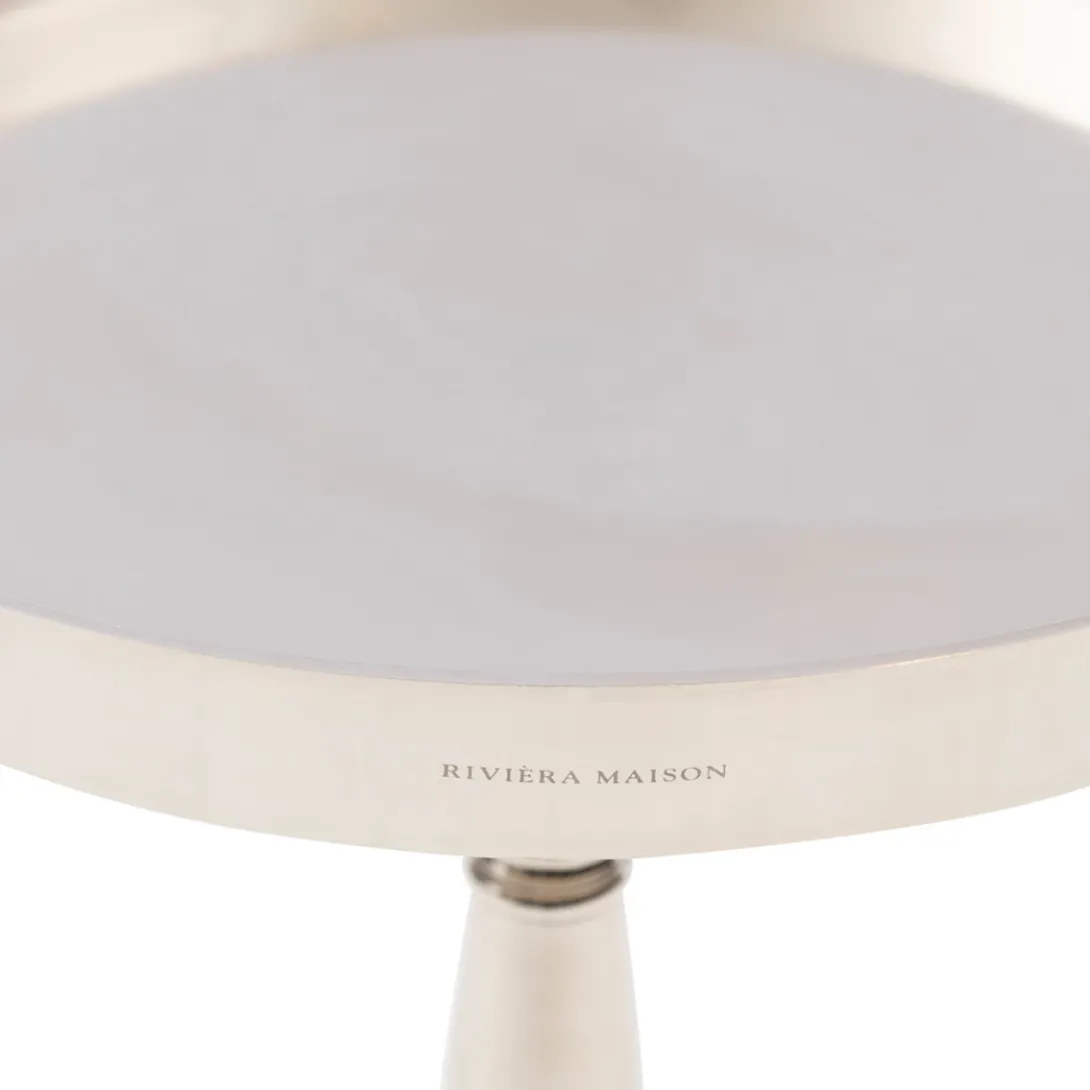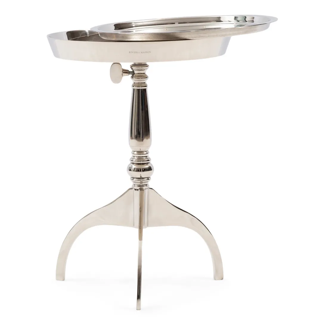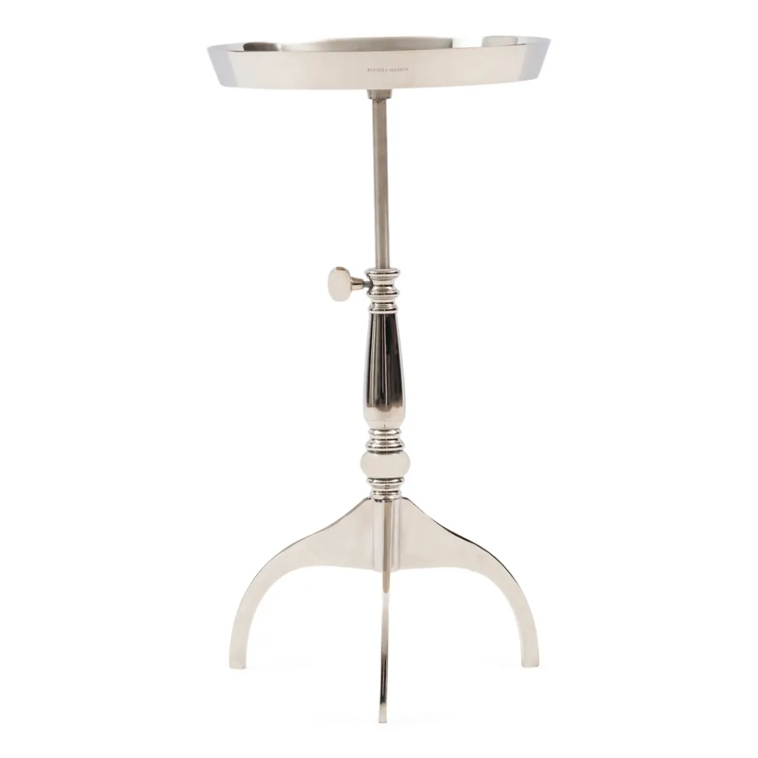 Dit bijzettafeltje van aluminium kan in hoogte worden versteld. Het tafeltje heeft een bewerkte poot met drie voetjes. Leuk detail: je kunt het bovenste blad eruit halen. Dan blijft er een tafeltje met wat diepte over. Daar kun je iets leuks op zetten.