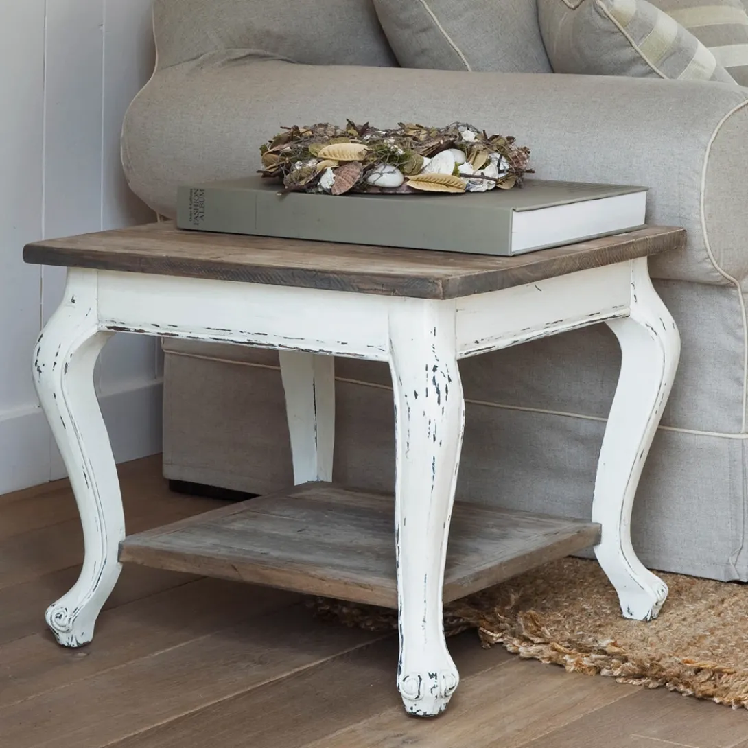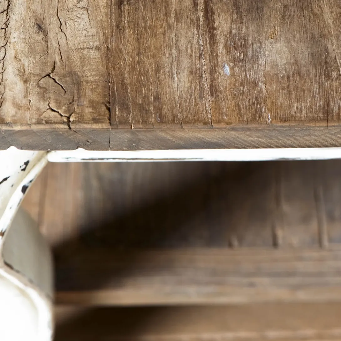De tafelbladen van de Driftwood Collection zijn gemaakt van oude houten deuren; zelfs de afdrukken van de scharnieren en deurklinken zijn nog zichtbaar. Deze bijzettafel is ideaal naast de bank. Plaats er een mooie lamp op, boek erbij, drankje bij de hand en geniet.