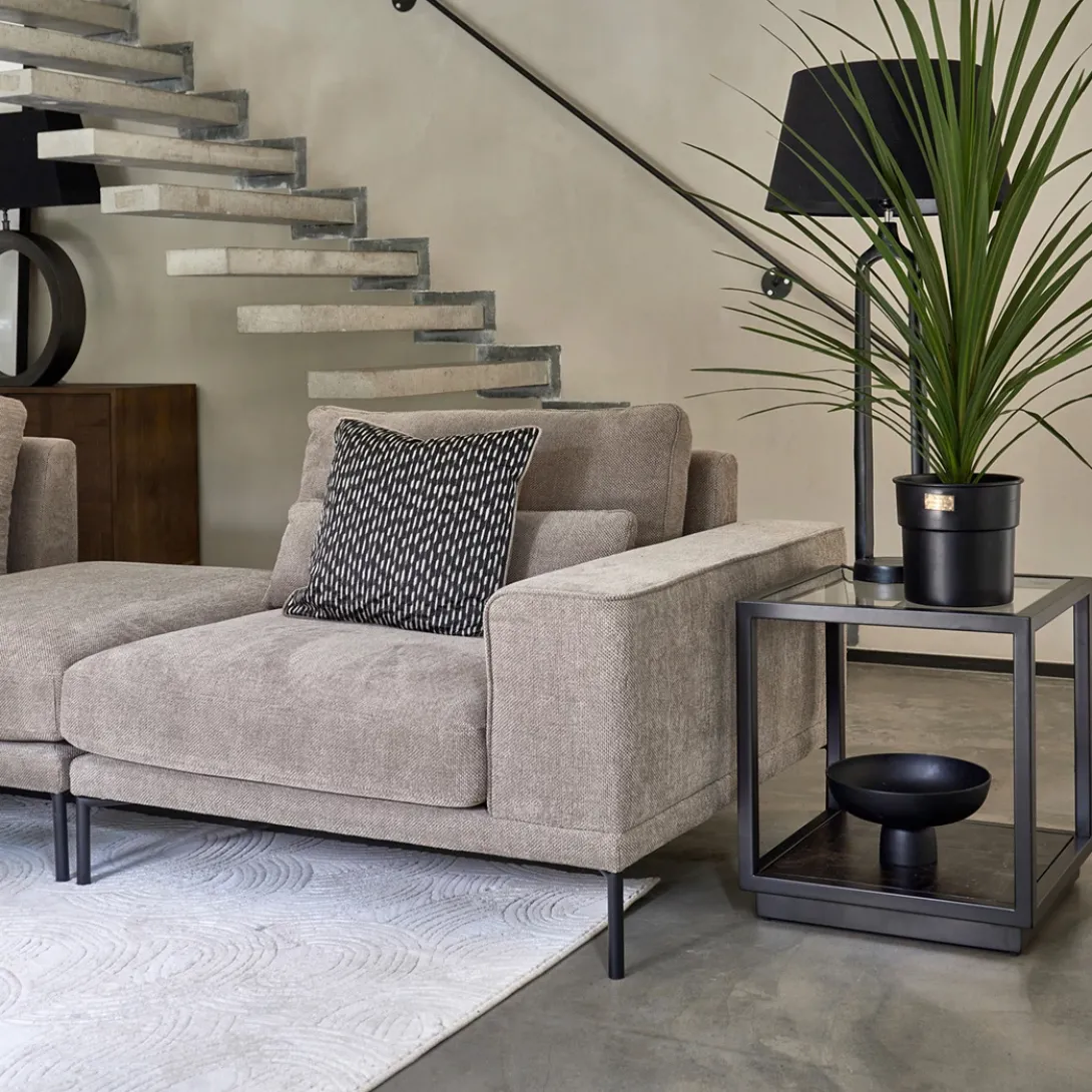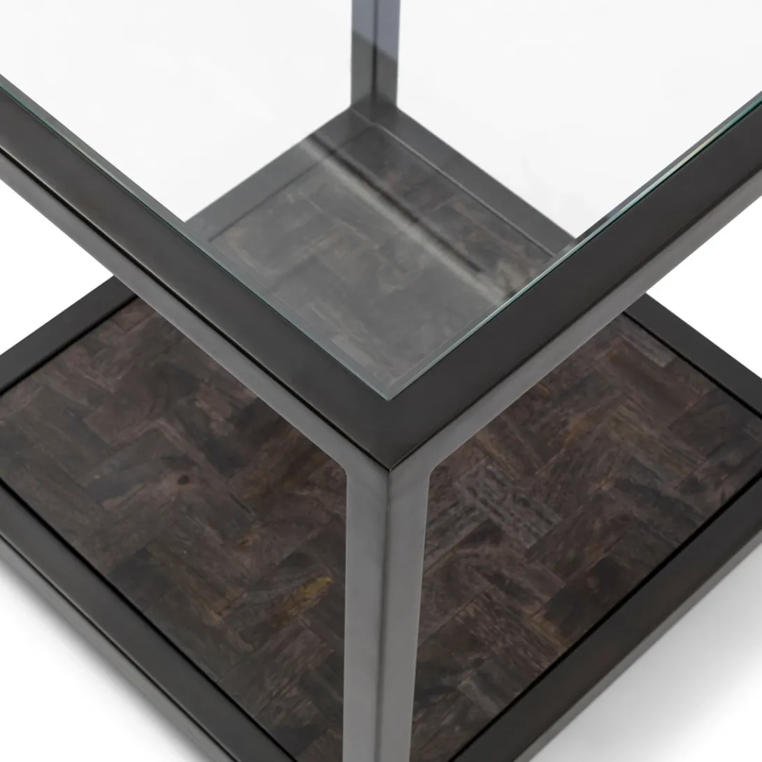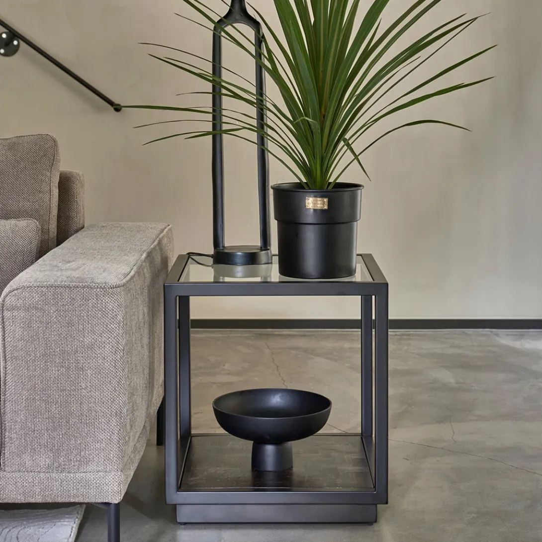 Strak, maar toch ook luchtig, dat is bijzettafel Roger. Deze bijzettafel is wat royaler van formaat en heeft twee bladen. Het bovenste is van stevig veiligheidsglas en het onderste is een inleg van warm grijs mangohout. Beide bladen vallen in een zwart metalen frame.