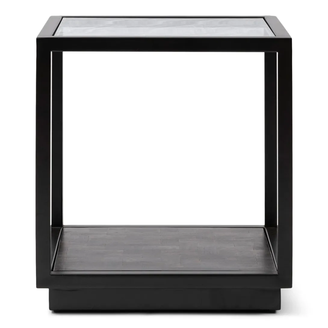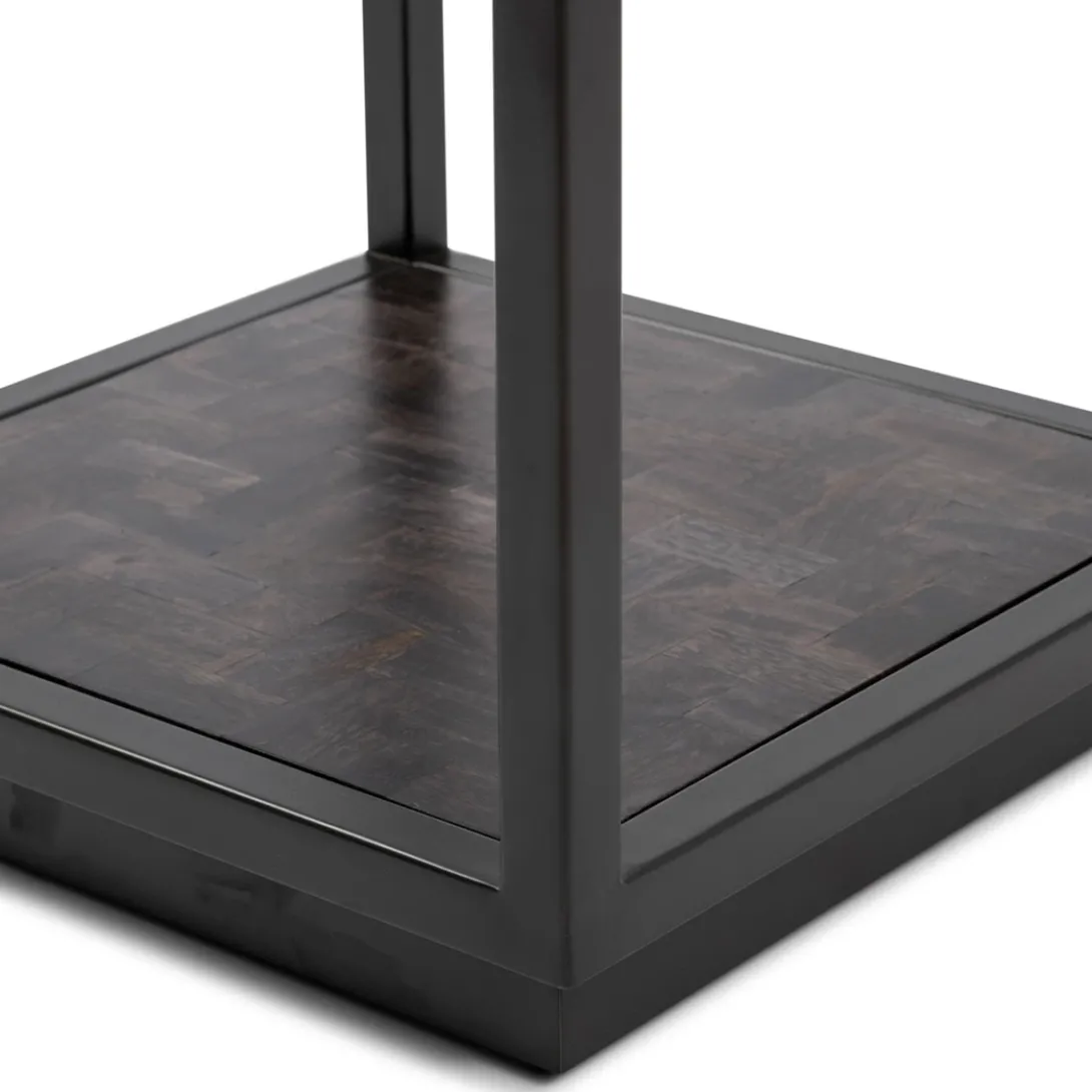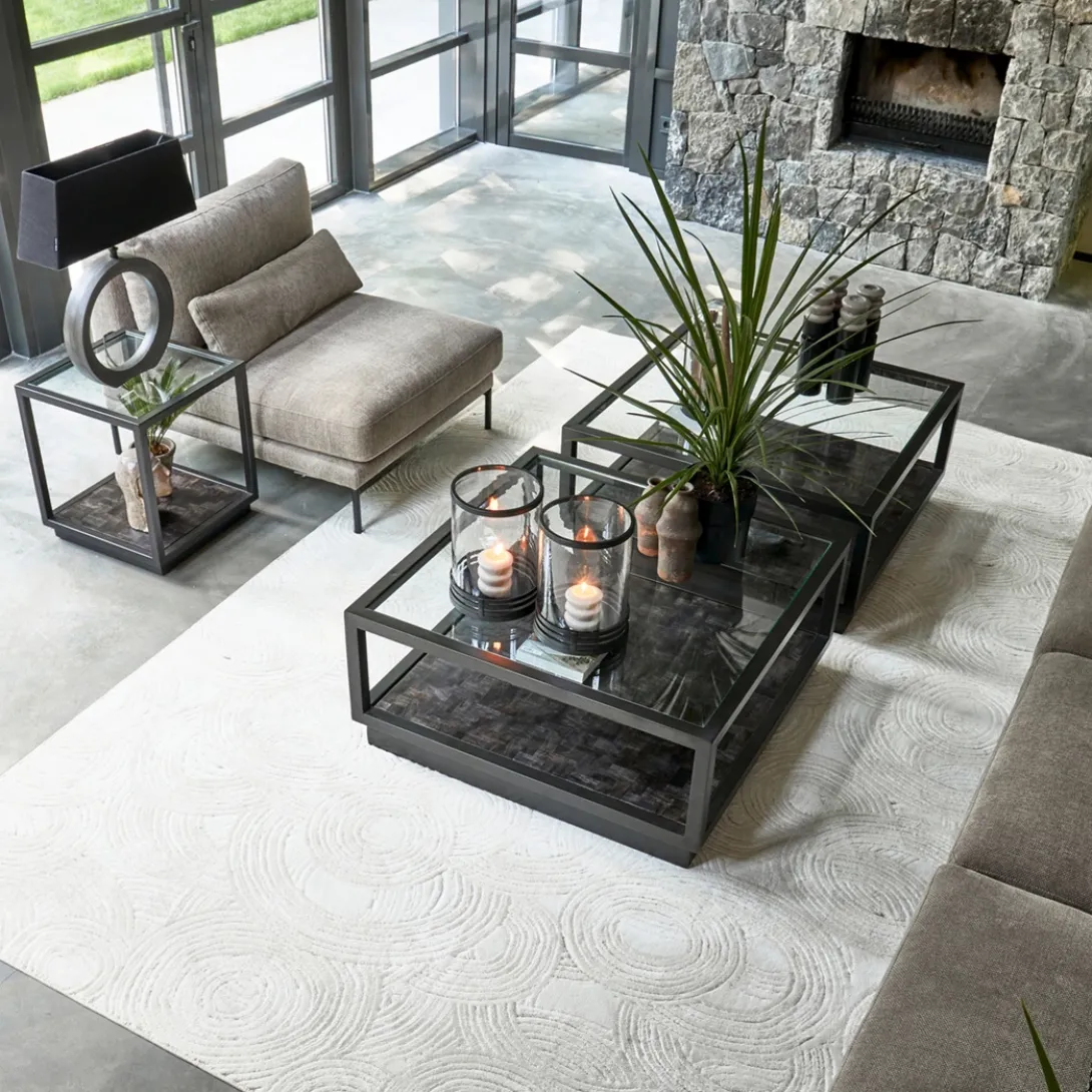 Strak, maar toch ook luchtig, dat is bijzettafel Roger. Deze bijzettafel is wat royaler van formaat en heeft twee bladen. Het bovenste is van stevig veiligheidsglas en het onderste is een inleg van warm grijs mangohout. Beide bladen vallen in een zwart metalen frame.