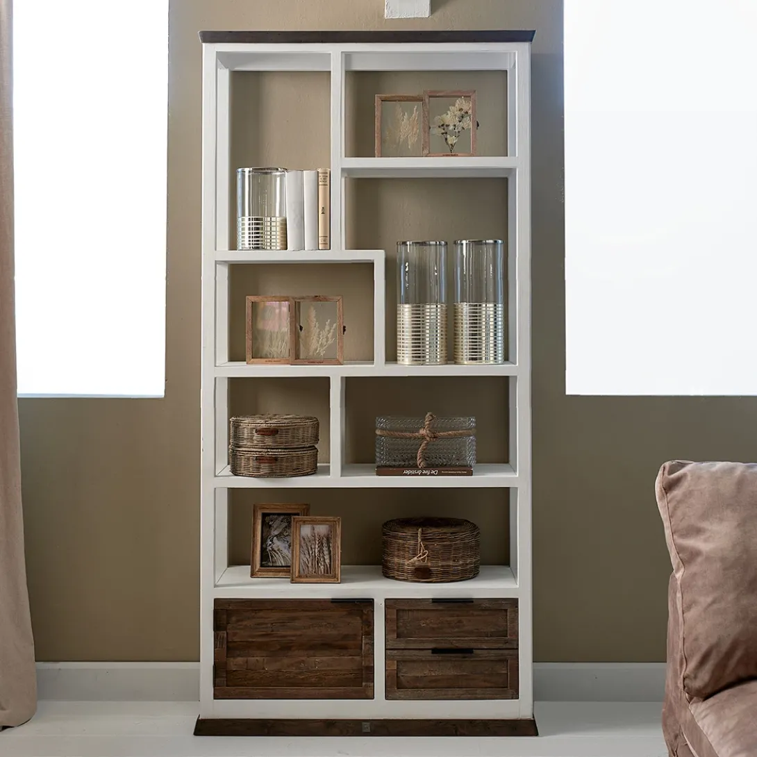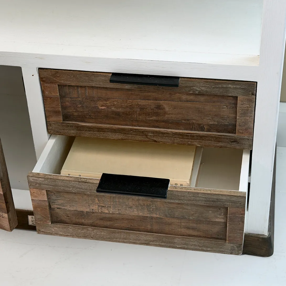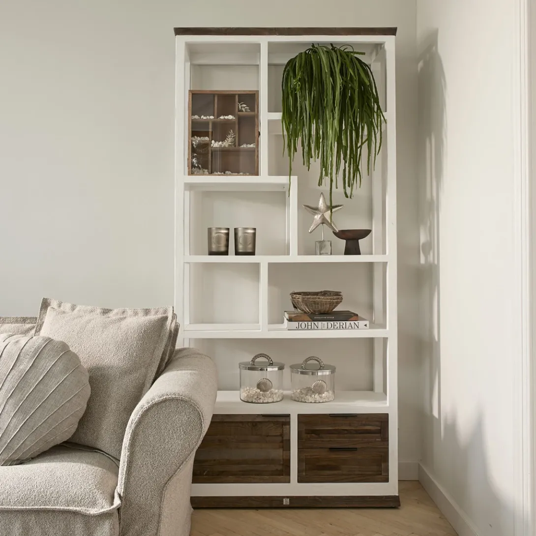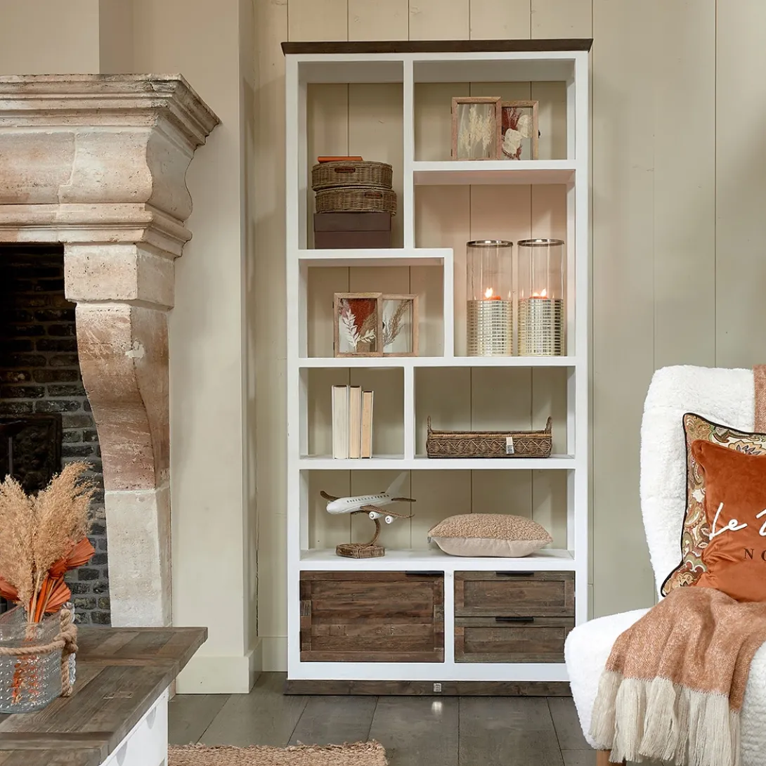De Metropolitan hoge kast heeft de kenmerkende Rivièra Maison-uitstraling, door het gebruik van ongeverfd, gerecycled iepenhout in combinatie met wit populierenhout. De opengewerkte vormgeving, samen met de donkere handgrepen geven deze kast zijn moderne jasje. Onderin zitten twee lades en een deurtje, om ook wat spullen uit het zicht te kunnen opbergen.