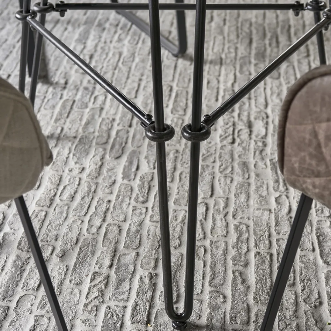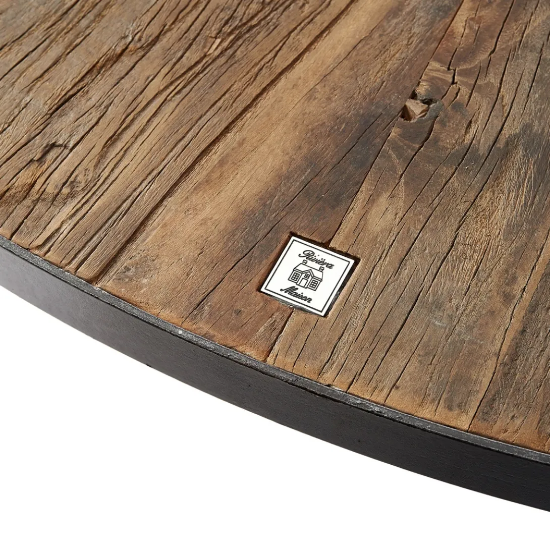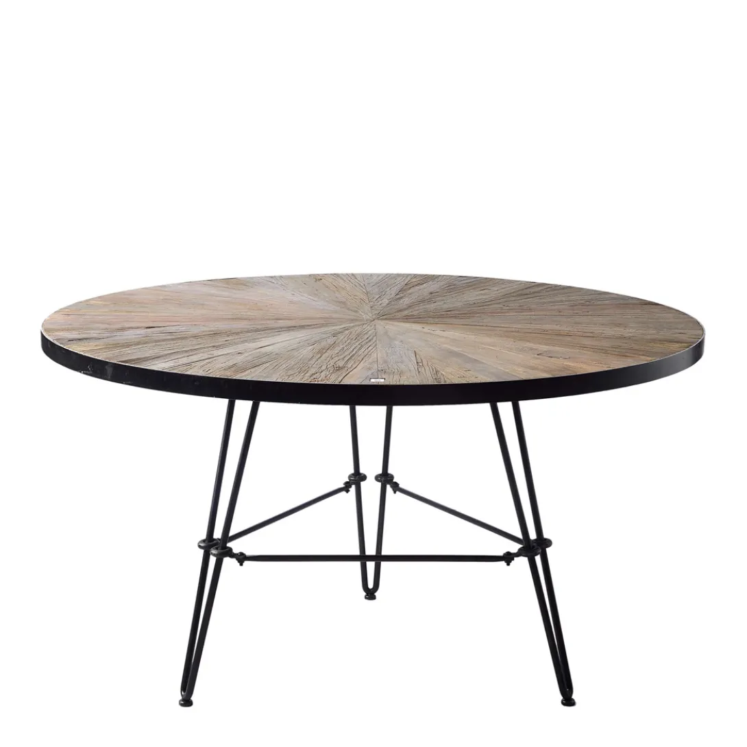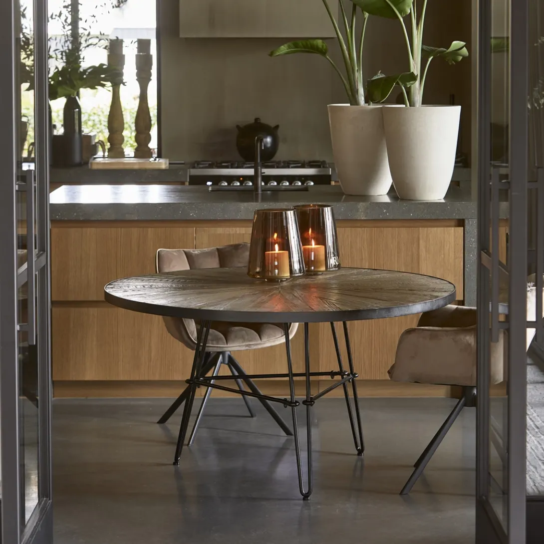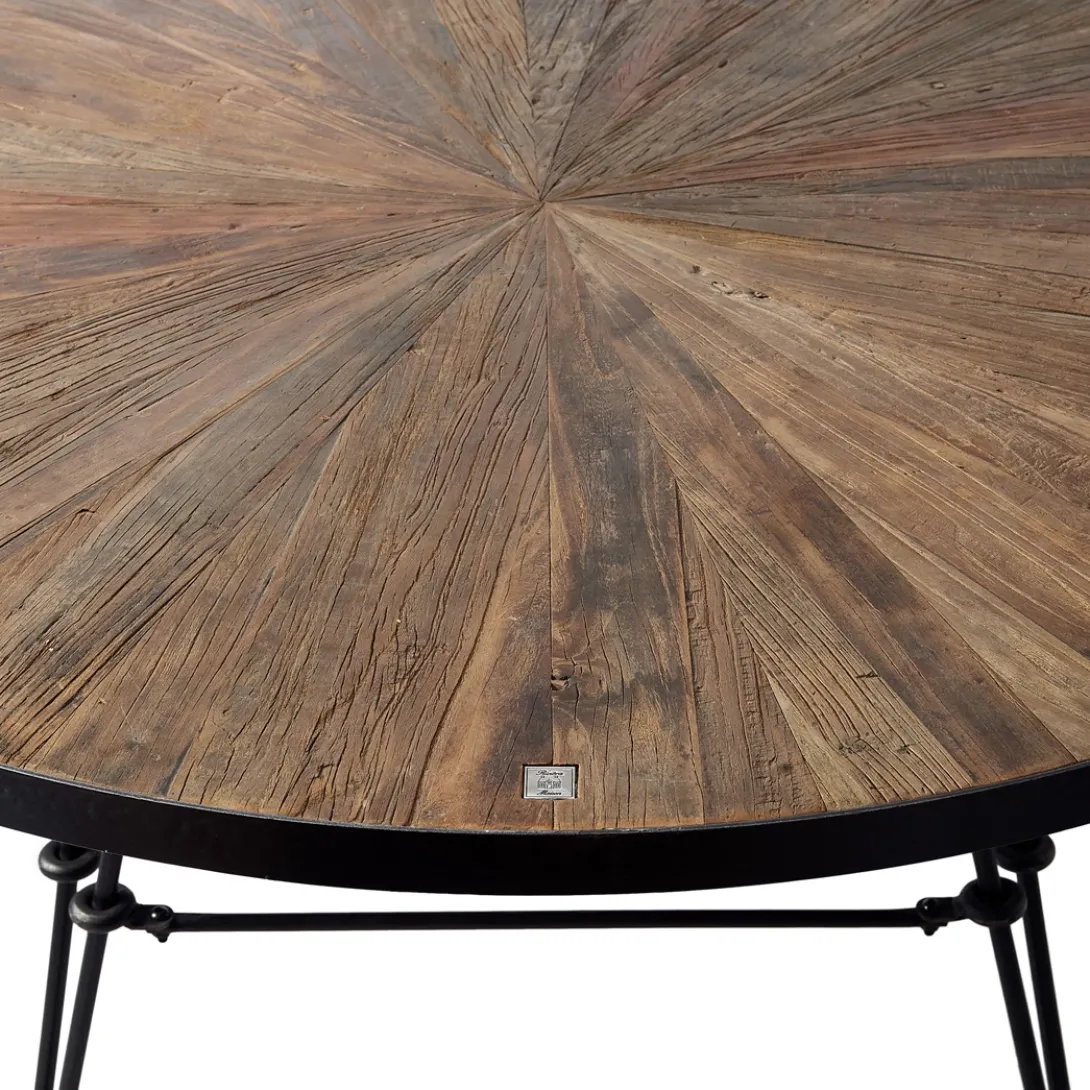 Deze prachtige, ronde dinertafel is een echte eyecatcher in uw eetkamer. De tafel heeft een industriële doch warme uitstraling door de combinatie van metaal en gerecycled iepenhout. Het hout is per puntje met de hand ingelegd als een mozaïek, pure ambacht! Plaats verschillende stoelen om de tafel en laat het samen een mooi geheel vormen.