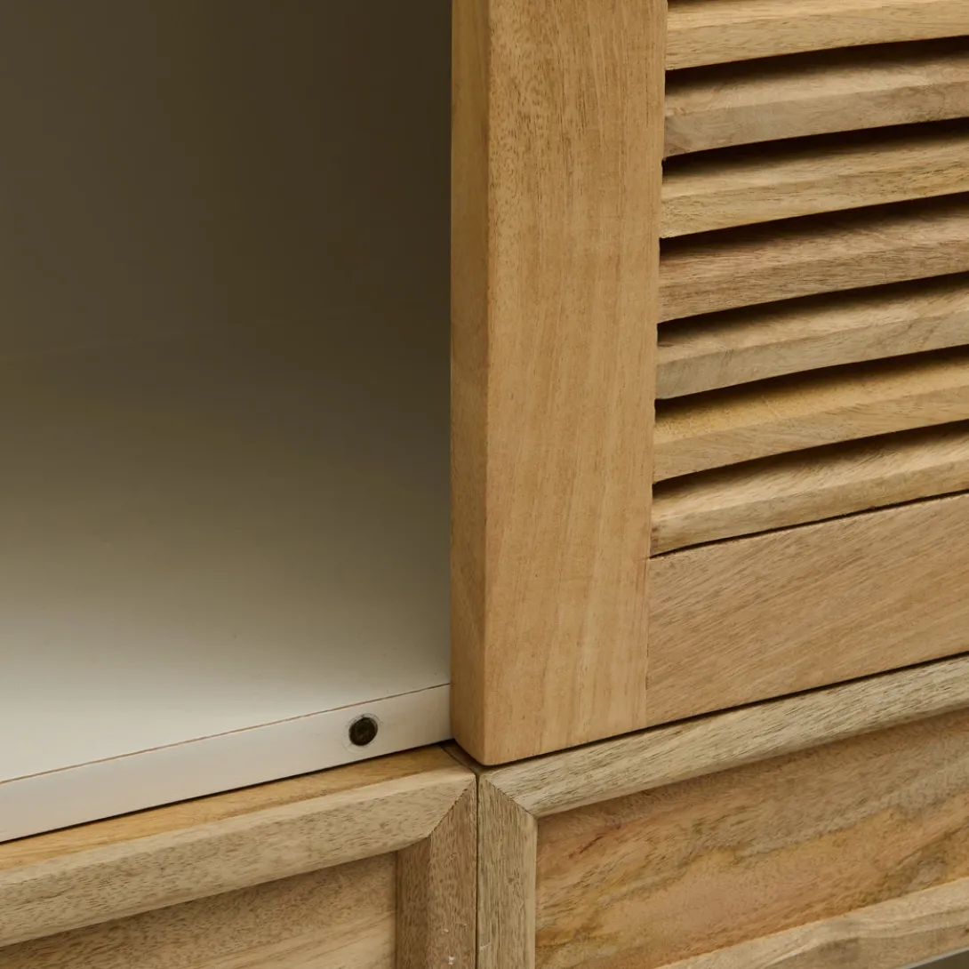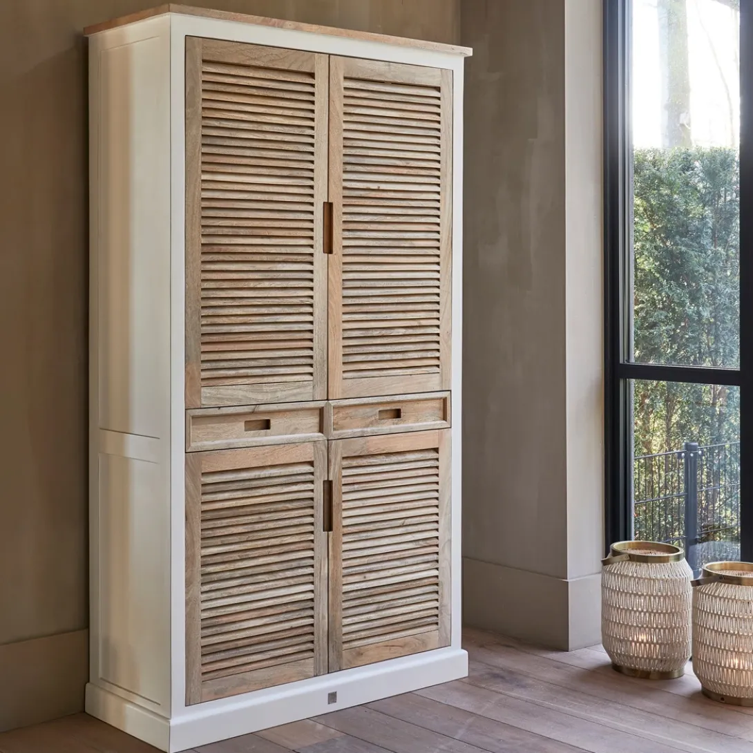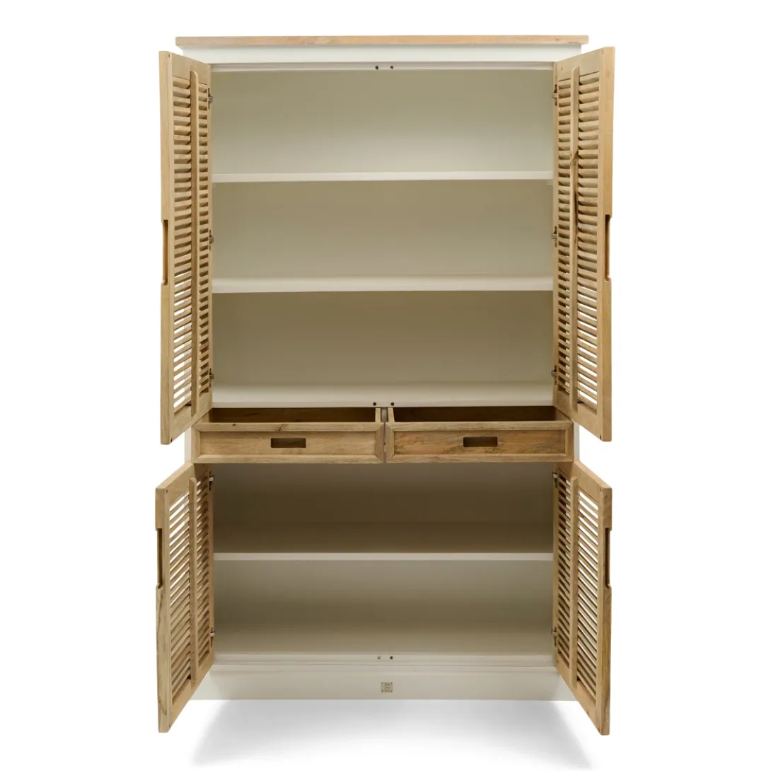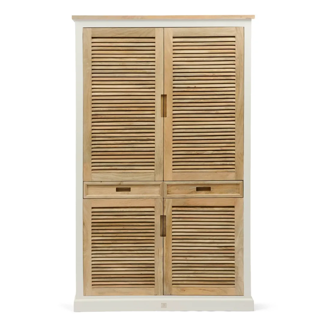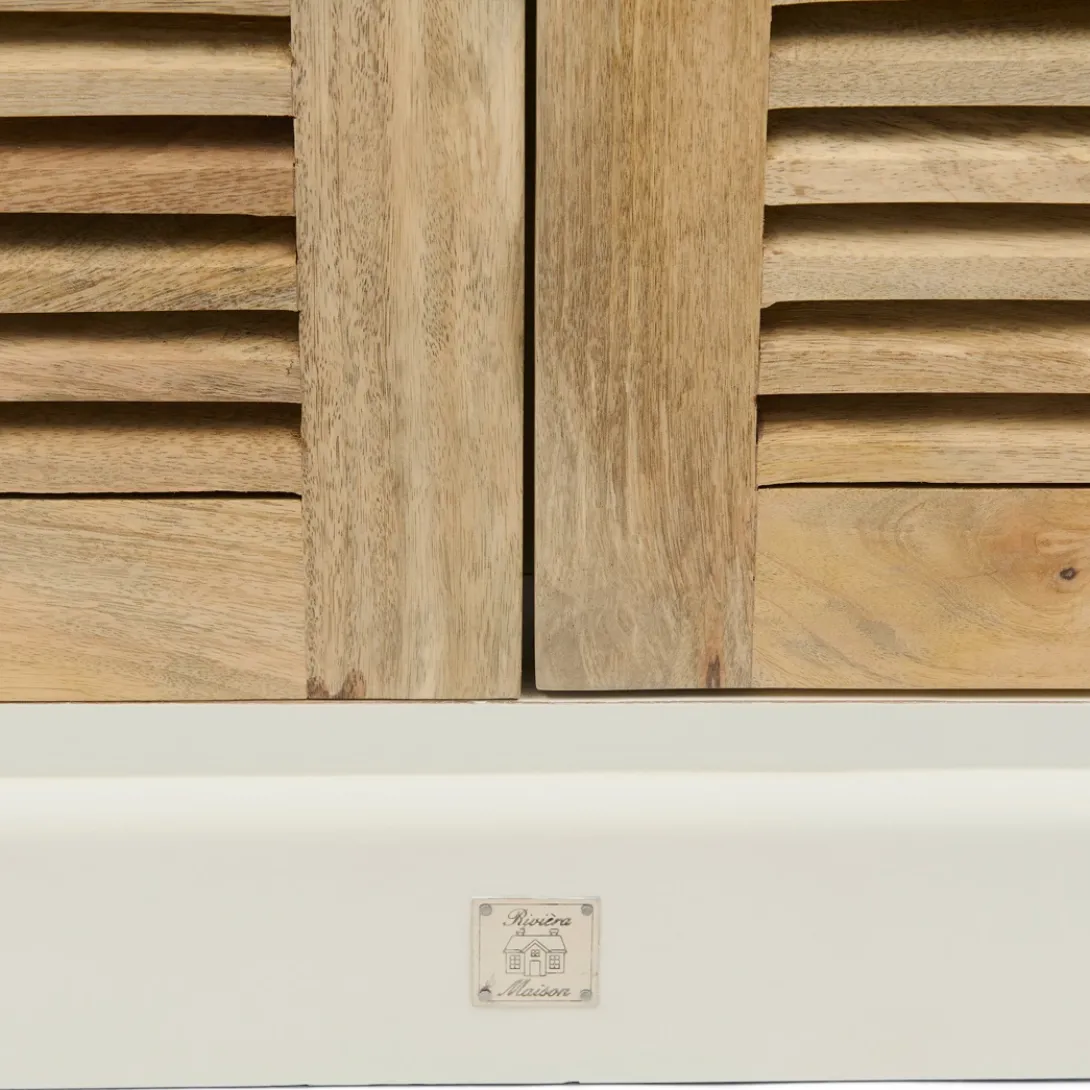 Breng rustieke charme in je interieur met de Baton Rouge buffetkast. Deze prachtige kast, uitgevoerd in een combinatie van wit en lichte houttinten, straalt landelijke elegantie uit. De shutterdeuren geven het ontwerp een verfijnde en tijdloze uitstraling, terwijl de ruime opbergruimte perfect is voor servies, glaswerk of andere essentials. Met zijn royale afmetingen is deze kast een praktische én stijlvolle toevoeging aan je eetkamer, keuken of woonkamer. Eenvoudig te onderhouden met een zachte doek. Laat jouw huis stralen met deze sfeervolle buffetkast.