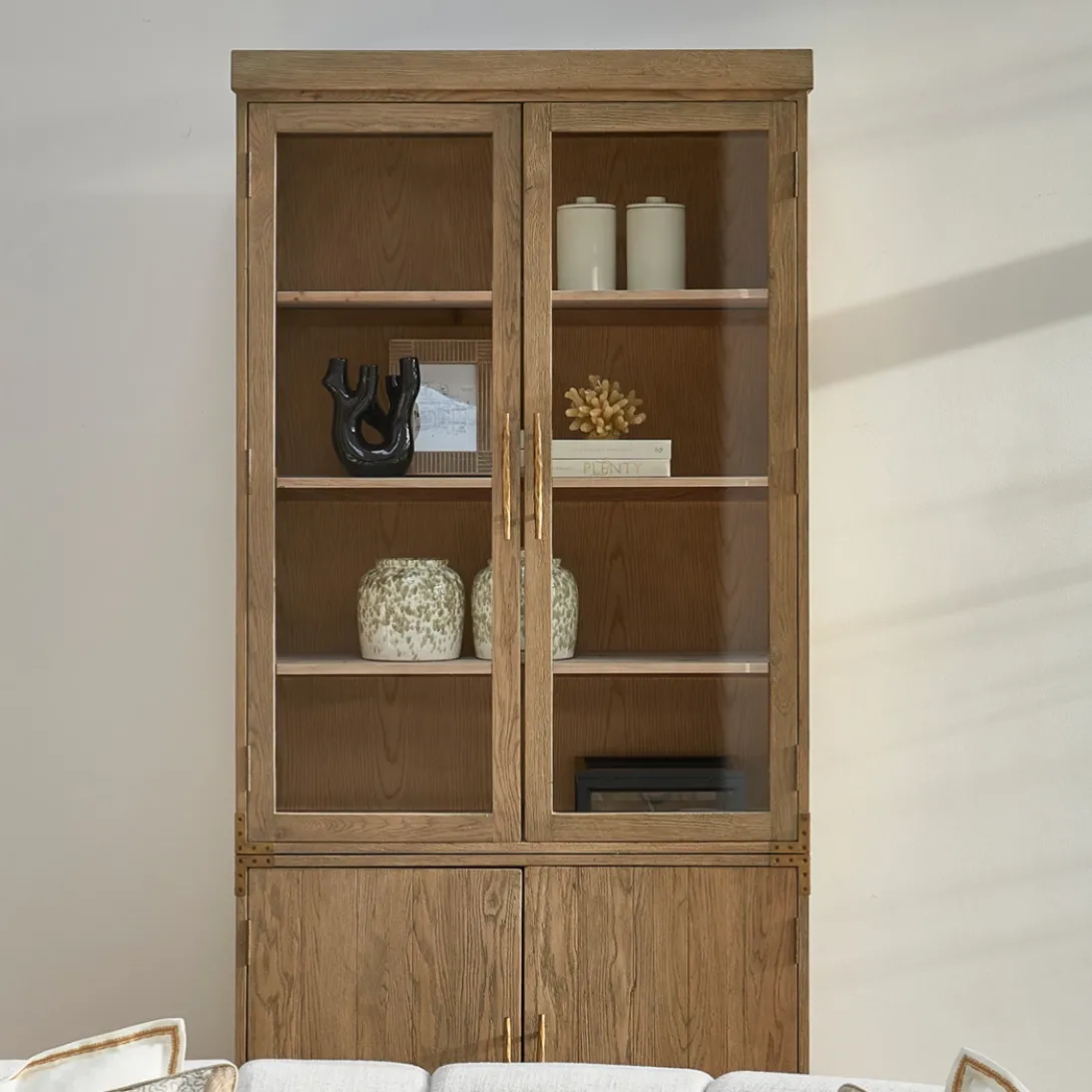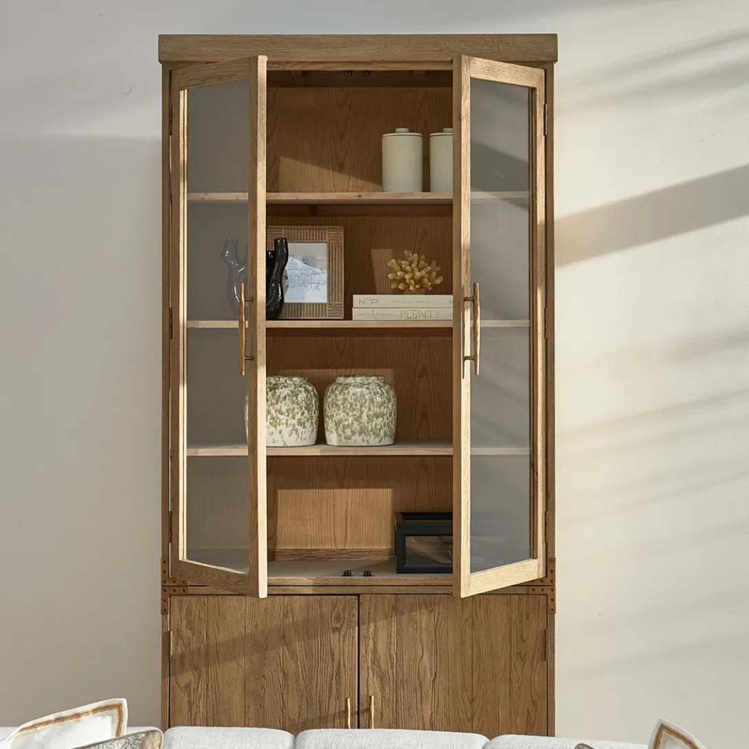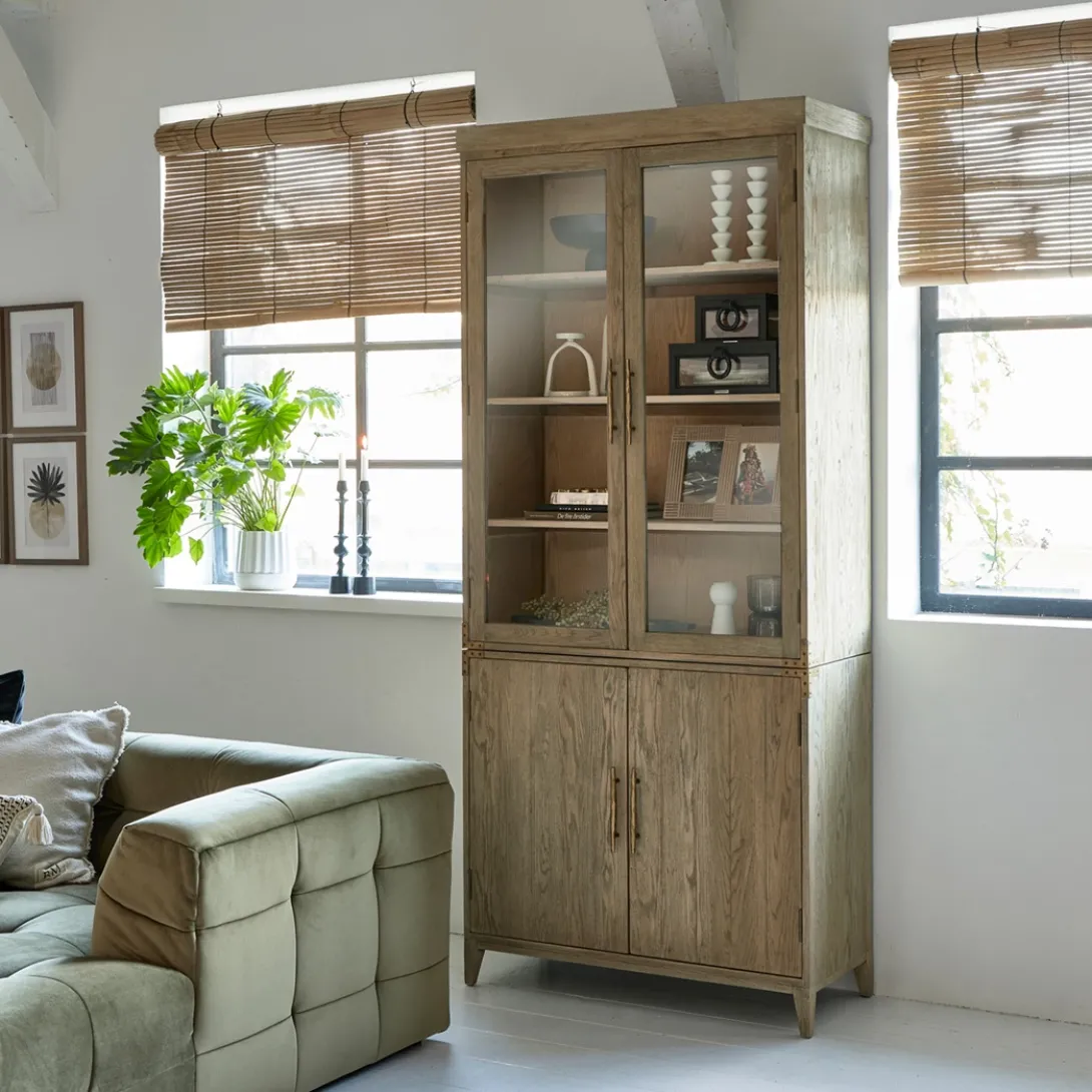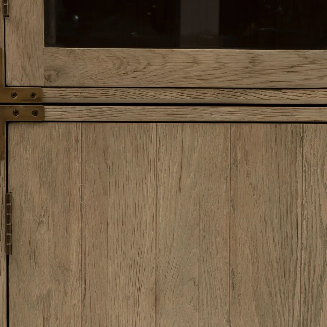 Deze prachtige vitrinekast is de Brescia, een grote kast volledig gemaakt van hergebruikt eikenhout met een lichte finish. De kast bestaat uit twee delen, een onderdeel met twee dichte deurtjes en een bovendeel met deuren van veiligheidsglas. De afwerking is met gouden betimmering op de hoeken en opvallende handgrepen.