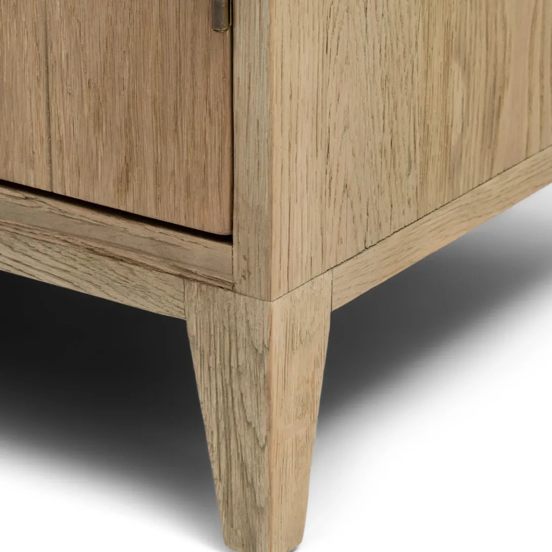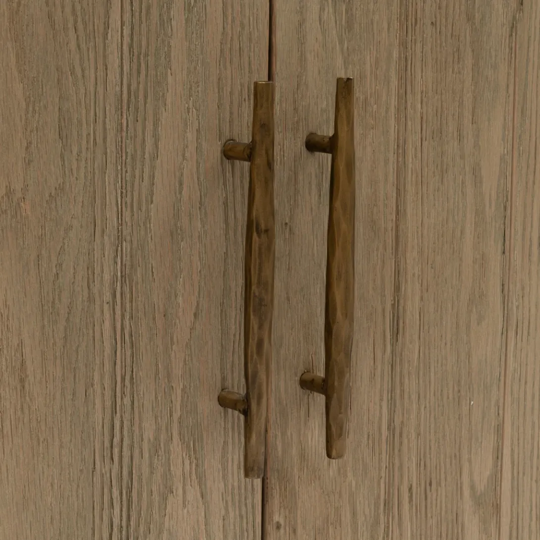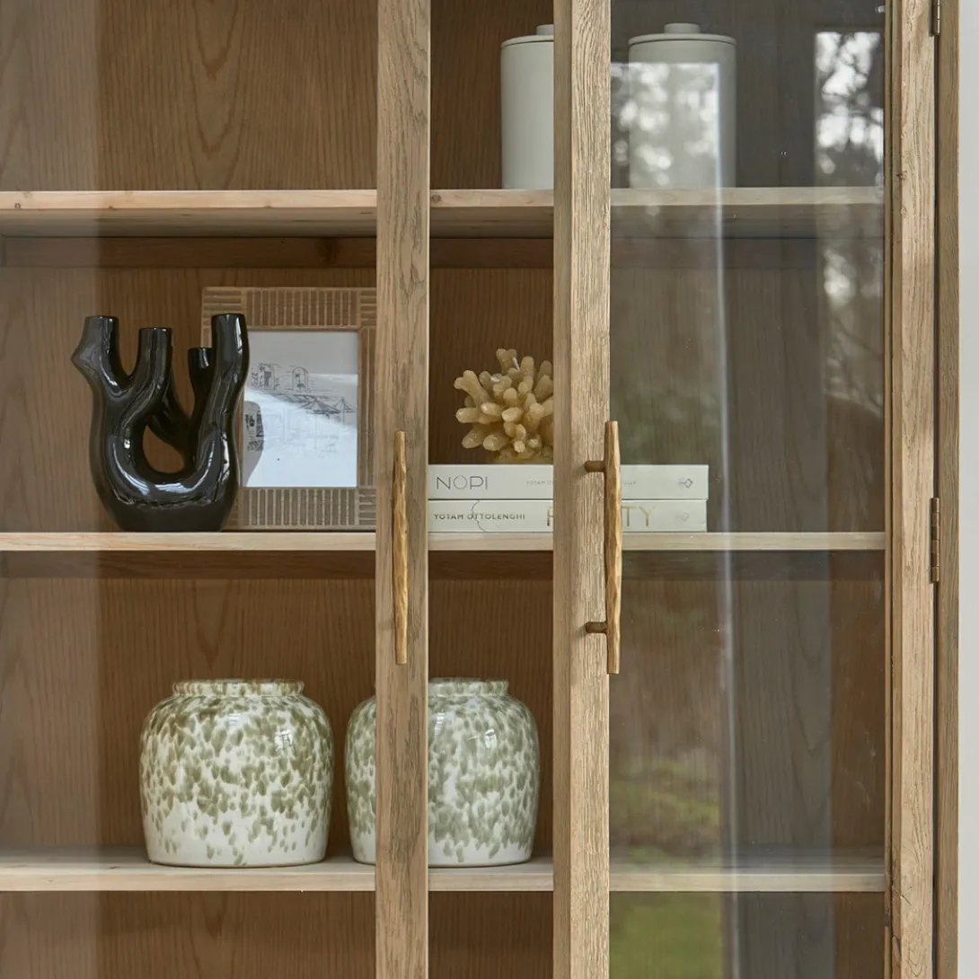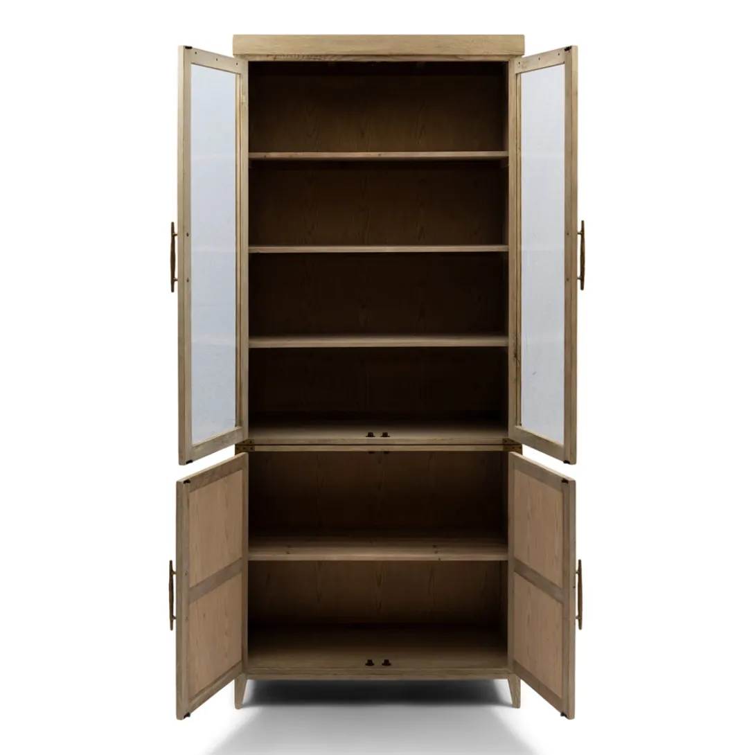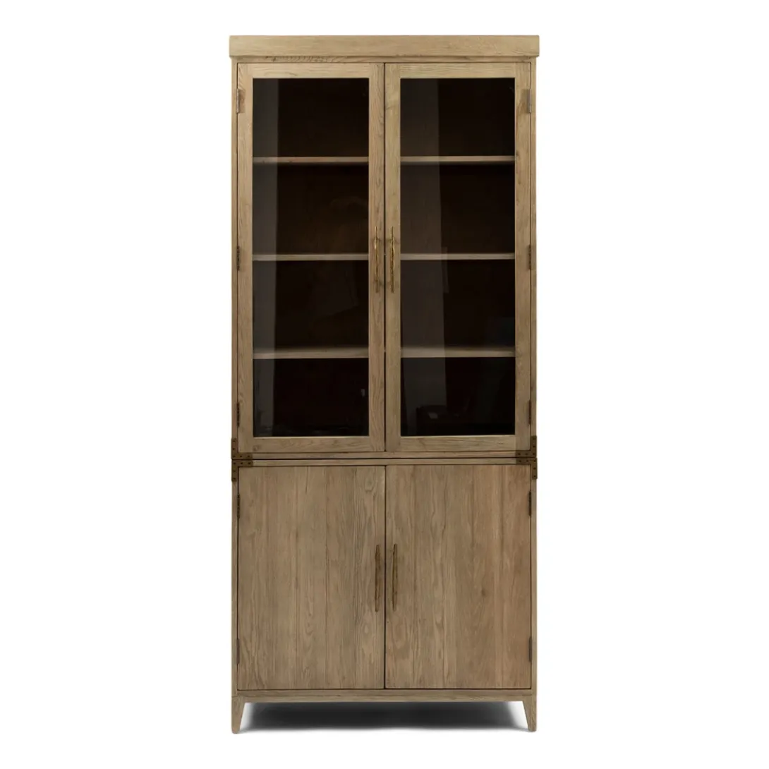 Deze prachtige vitrinekast is de Brescia, een grote kast volledig gemaakt van hergebruikt eikenhout met een lichte finish. De kast bestaat uit twee delen, een onderdeel met twee dichte deurtjes en een bovendeel met deuren van veiligheidsglas. De afwerking is met gouden betimmering op de hoeken en opvallende handgrepen.
