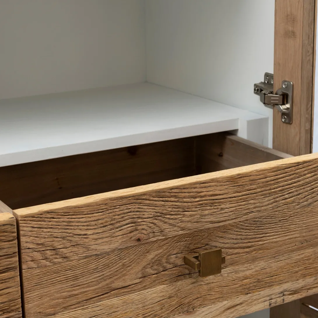 - De Lake buffetkast is een elegante aanvulling op je interieur, met houten deuren die een warme touch toevoegen. De deuren zijn voorzien van louvre en glas, wat een verfijnde en luchtige uitstraling creëert. De gouden handgrepen voegen een stoer accent toe, terwijl de magneetsluiting zorgt voor een naadloze en praktische afwerking. Met twee lades biedt deze kast ook handige opbergruimte, waardoor de kast zowel functioneel als stijlvol is. Elk kast is uniek door het gebruik van teruggewonnen eikenhout.