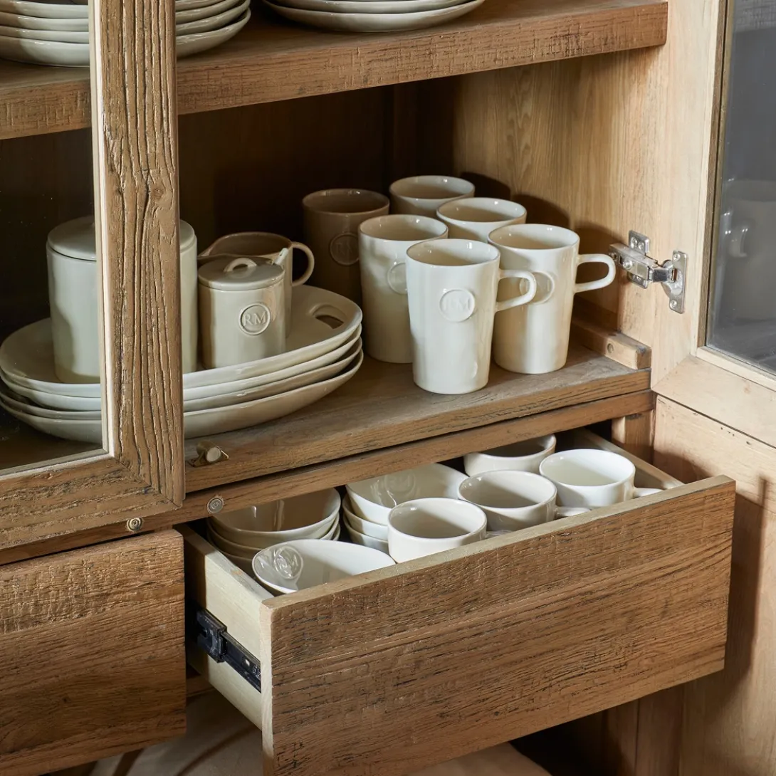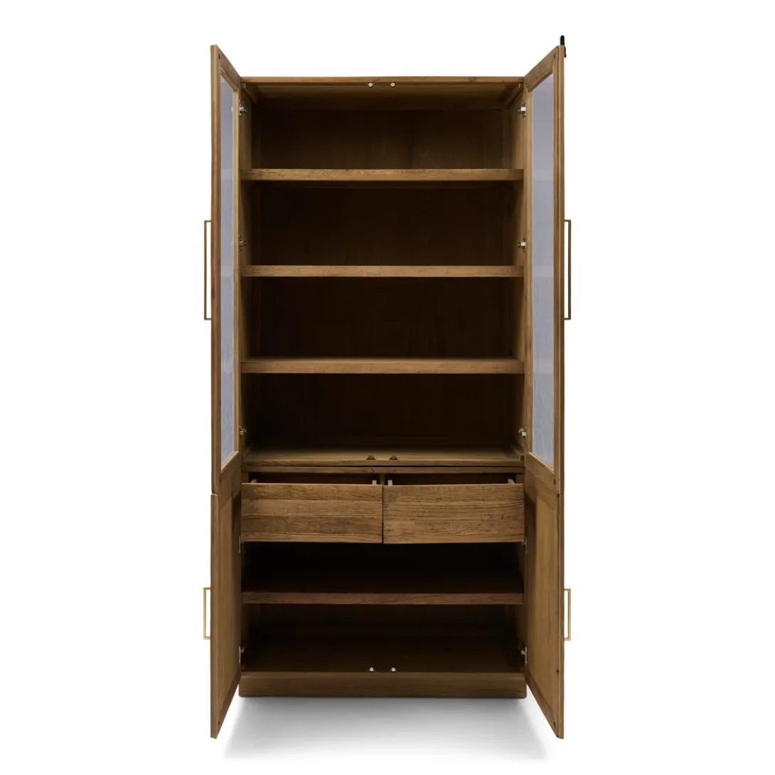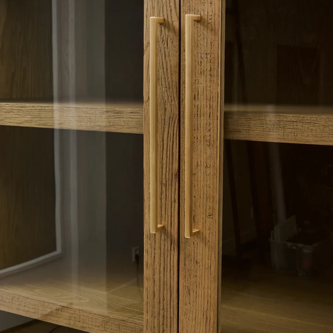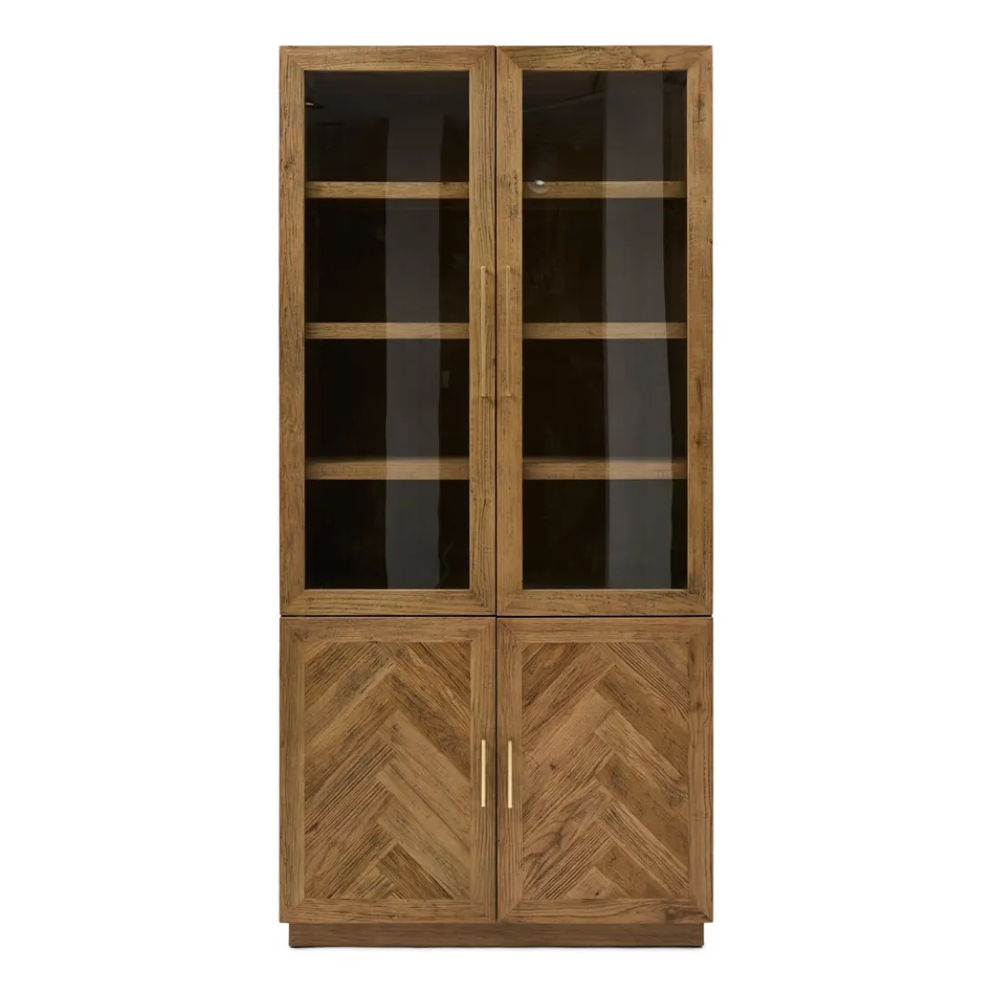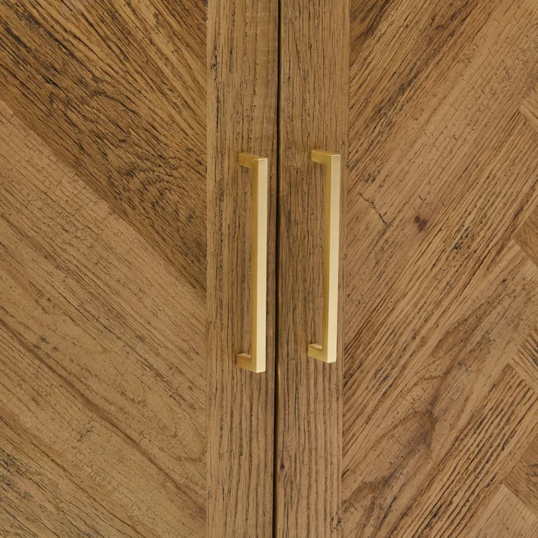 De Riverside buffetkast tilt jouw interieur naar een hoger niveau met zijn verfijnde design en hoogwaardige afwerking. Gouden handgrepen, twee glazen deuren en een prachtig vissengraatpatroon op de dichte deuren maken van deze kast een stijlvol statement. Met ruime planken en praktische lades biedt de kast volop opbergruimte zonder in te leveren op elegantie. Perfect om jouw favoriete accessoires of servies te tonen achter glas, terwijl je andere spullen netjes opbergt. Een tijdloos meubelstuk dat luxe en functionaliteit samenbrengt.