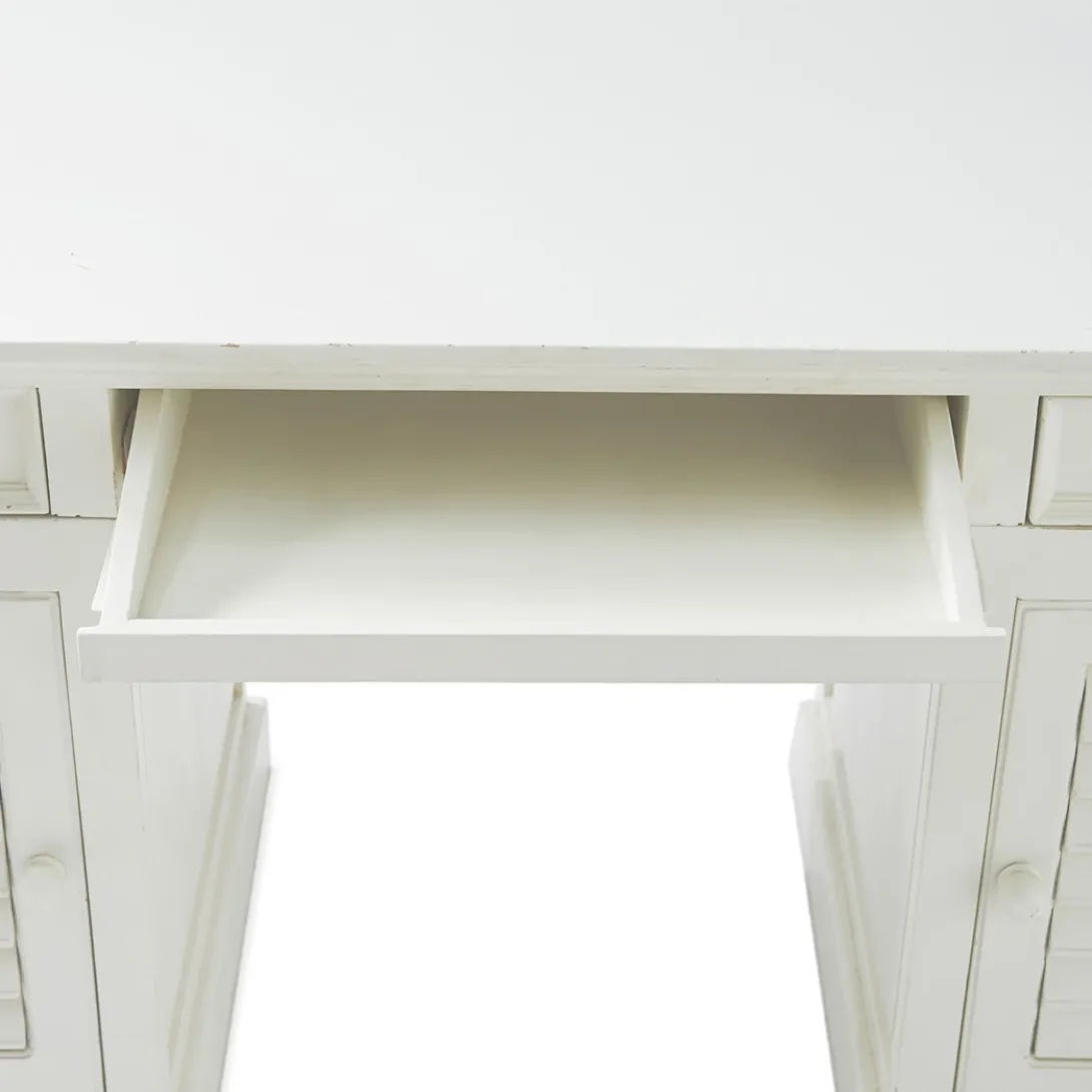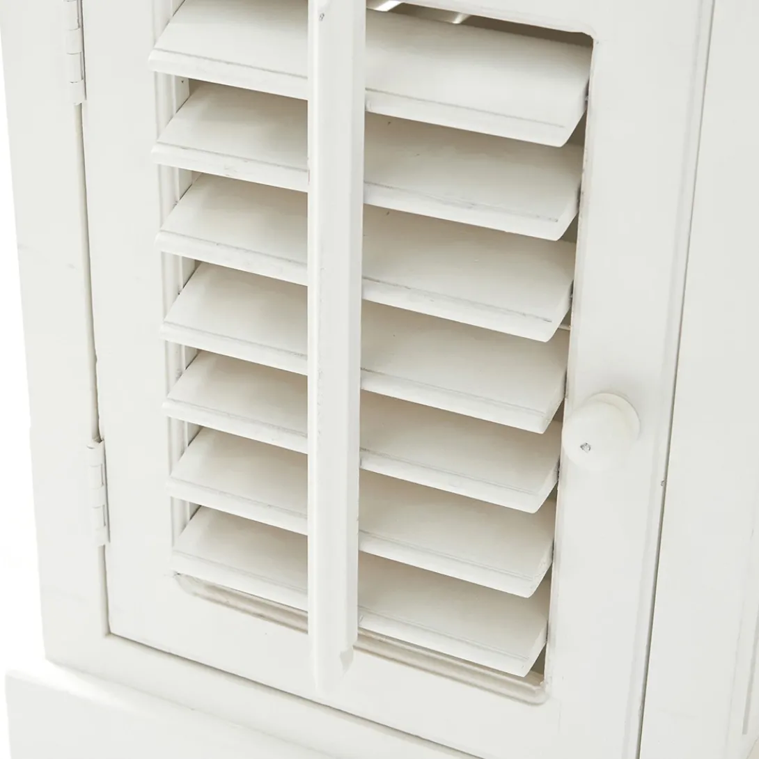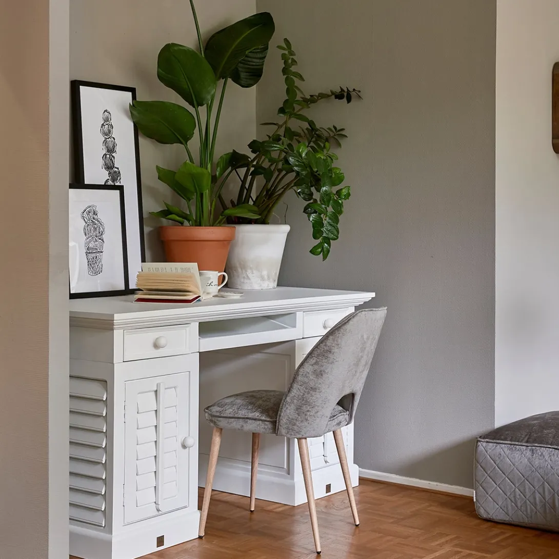 De New Orleans desk is een fris wit bureau gemaakt van acaciahout. Het bureau heeft twee lades aan beide kanten, een uitschuifbaar gedeelte in het midden en opbergruimte aan beide kanten. Achter het deurtje met shutters zit aan beide kant één plank. Leuk detail: de shutters zijn beweegbaar.