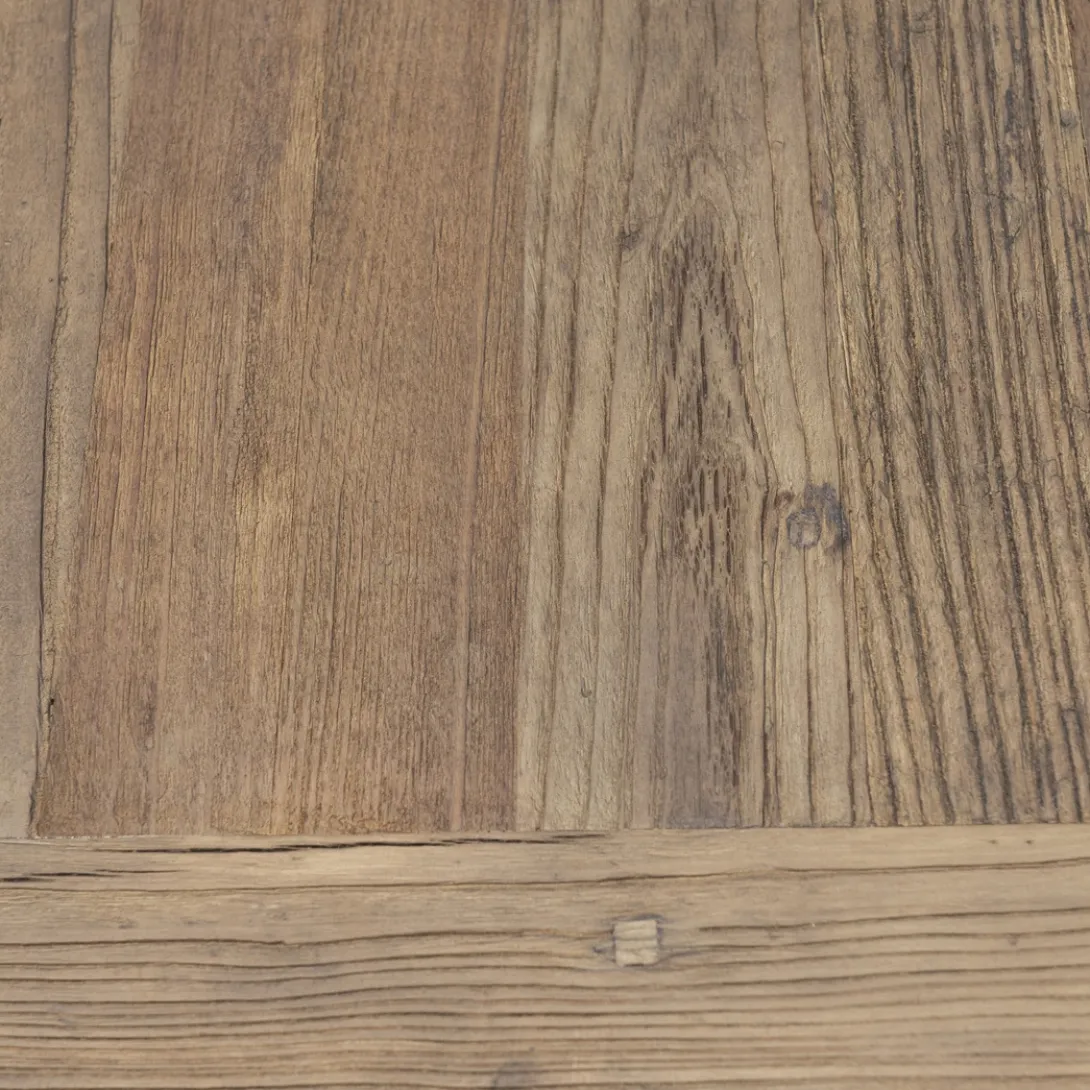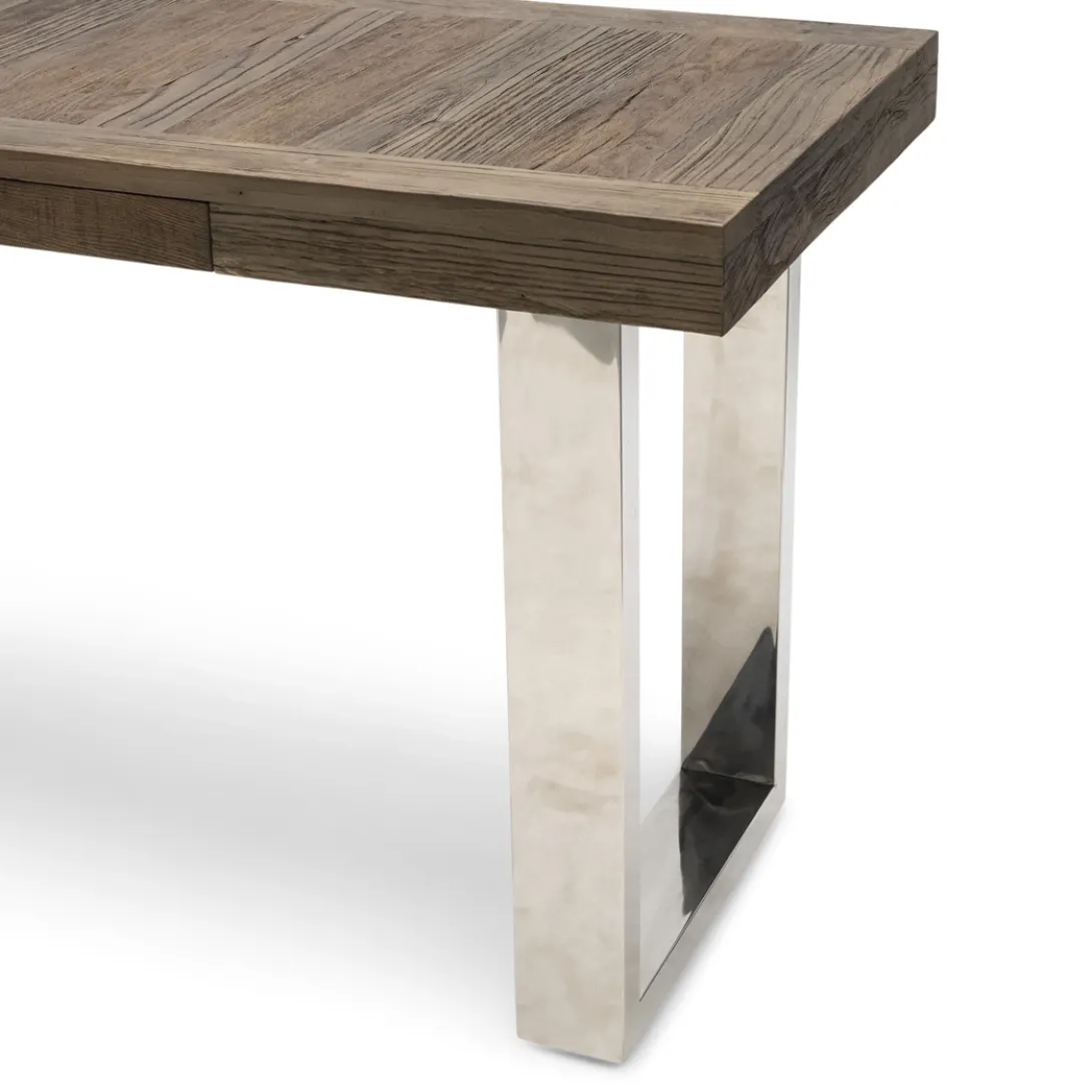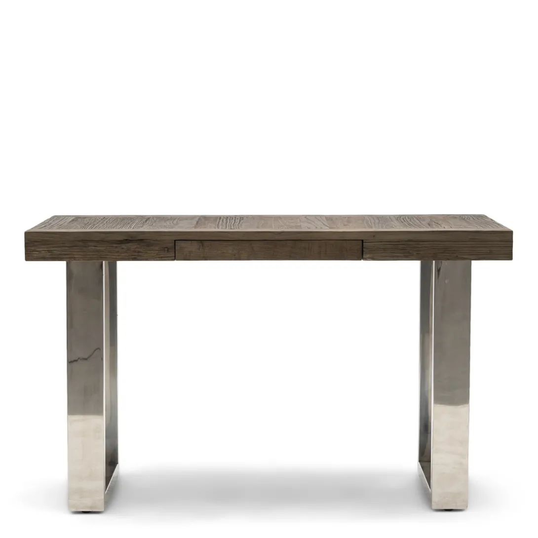 Dit bureau van onze Washington lijn is een solide tafel. Het blad is gemaakt van oud iepenhout, verkregen van oude Chinese deuren. Hierdoor is iedere tafel uniek. Het strakke onderstel is gemaakt van roestvrij staal. Ook verkrijgbaar in andere meubel varianten, zoals de bijpassende salontafel of eettafel.