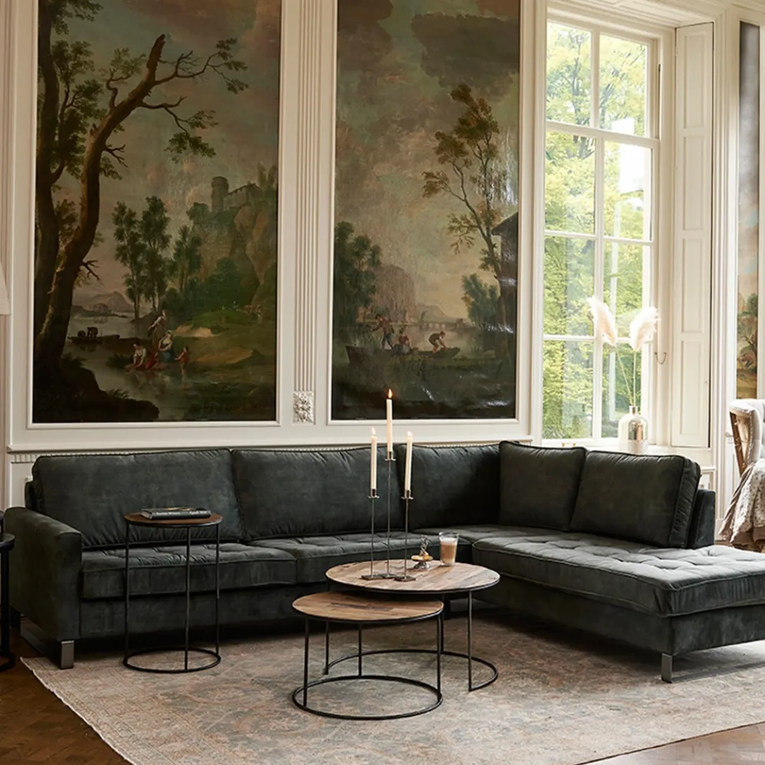 Deze bank met rechts een chaise longue wordt de favoriet in huis. Lekker een beetje suf op de bank liggen na een sportwedstrijd of een lange dag. Gestrekt op het zachte fluweel van de bekleding komt een mens dan weer helemaal bij. De bank is gemaakt van beukenhout, ijzer en polyester. Hij heeft een robuust uiterlijk, zit heerlijk en is er in verschillende materialen en kleuren. 295 x 220 x 85 cm groot.