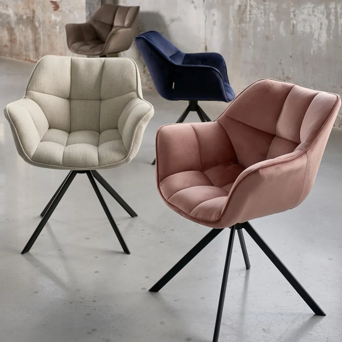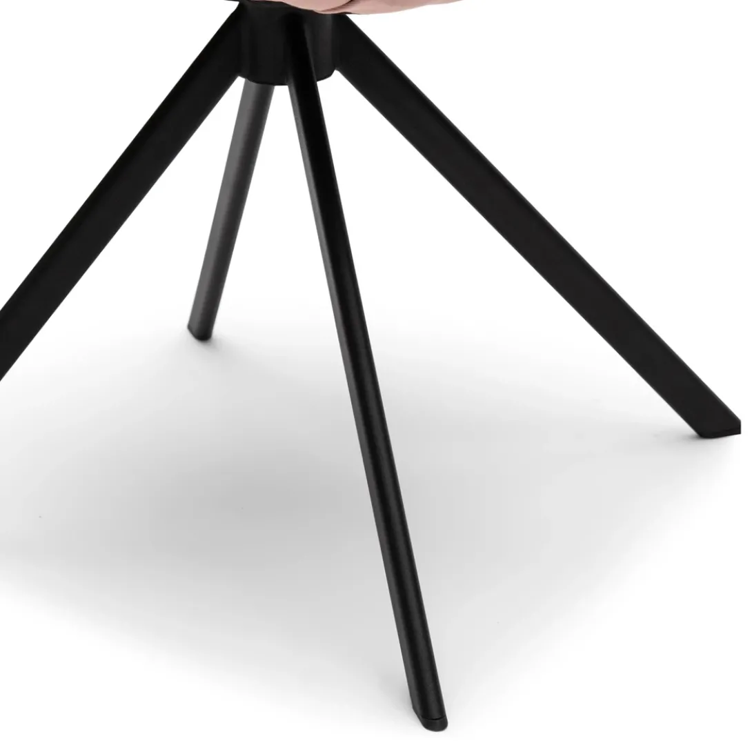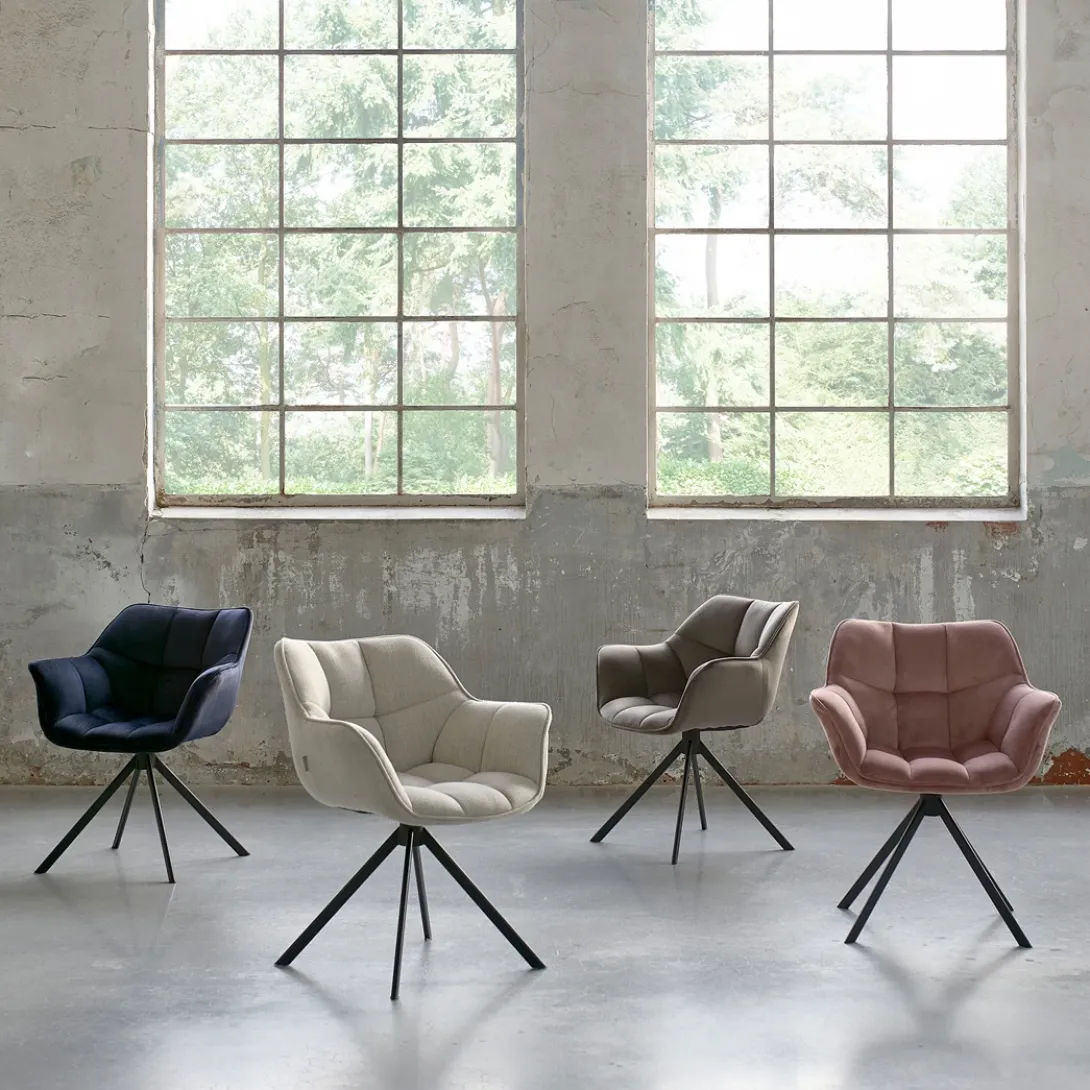 De Carnaby-eetkamerstoel heeft een doorgestikte zitting, waardoor de stof opbolt en je er na een lange dag comfortabel in kunt uitrusten. De poot van zwart gekleurd ijzer waaiert als een piramide onder de zitting uiteen. De Carnaby-eetkamerstoel is verkrijgbaar in verschillende kleuren en stofferingen.