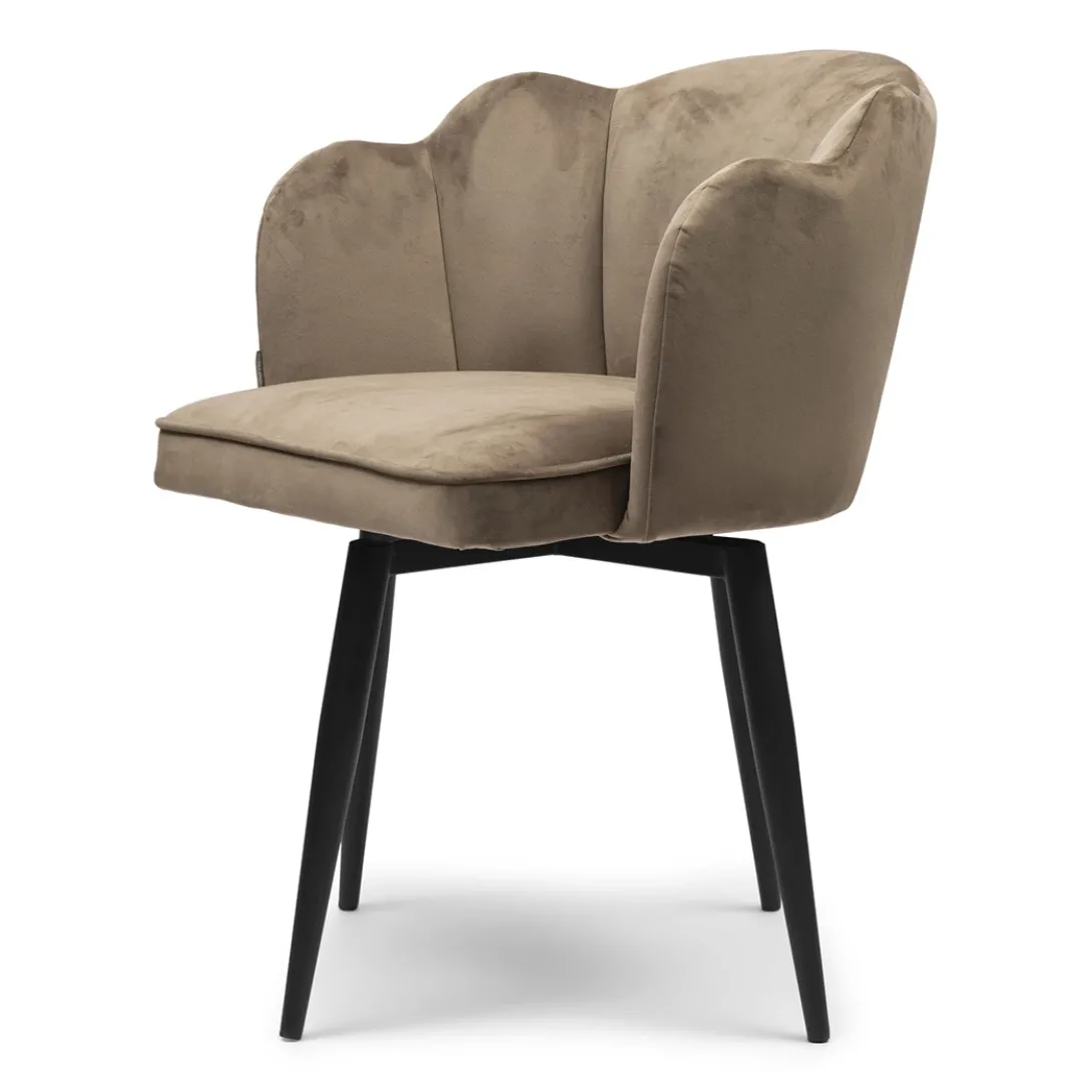 Let’s bloom, de draaibare eetkamerstoel Dauphine, in Golden Mink, Velvet stof geeft iedere ruimte een rijkere uitstraling! Met zijn draaibare poot en unieke bloemvormige rugleuning is dit echt een eyecatcher. Deze stoel is niet alleen mooi, maar ook praktisch en stevig. Voeg een vleugje moderne luxe toe aan je eetruimte met de Dauphine eetkamerstoel. Met de afmetingen van 66x68x88 cm past deze stoel mooi aan jouw eettafel.