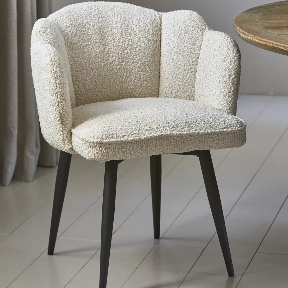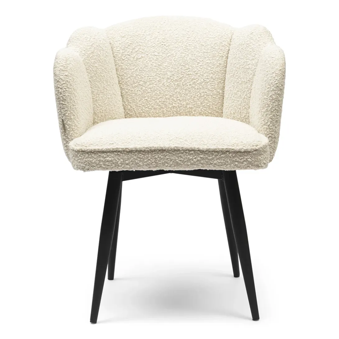 Let’s bloom, de draaibare eetkamerstoel Dauphine, in White Sand, Bouclé stof geeft iedere ruimte een rijkere uitstraling! Met zijn draaibare poot en unieke bloemvormige rugleuning is dit echt een eyecatcher. Deze stoel is niet alleen mooi, maar ook praktisch en stevig. Voeg een vleugje moderne luxe toe aan je eetruimte met de Dauphine eetkamerstoel. Met de afmetingen van 66x68x88 cm past deze stoel mooi aan jouw eettafel.