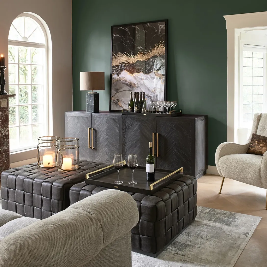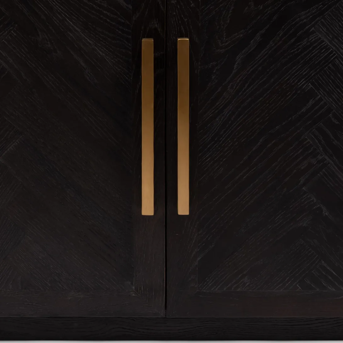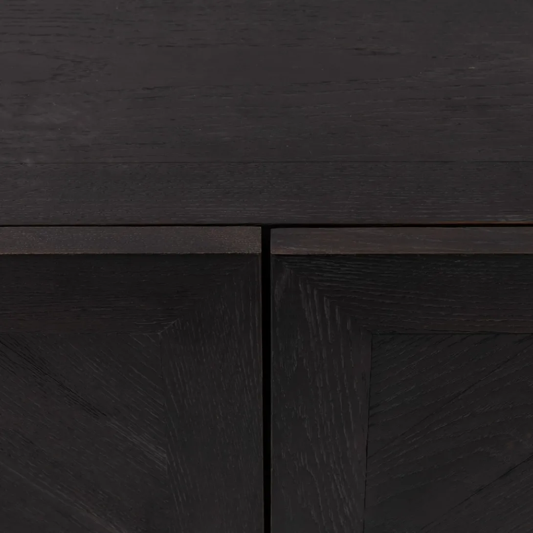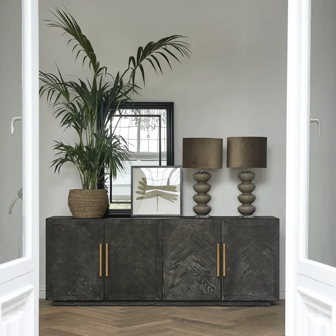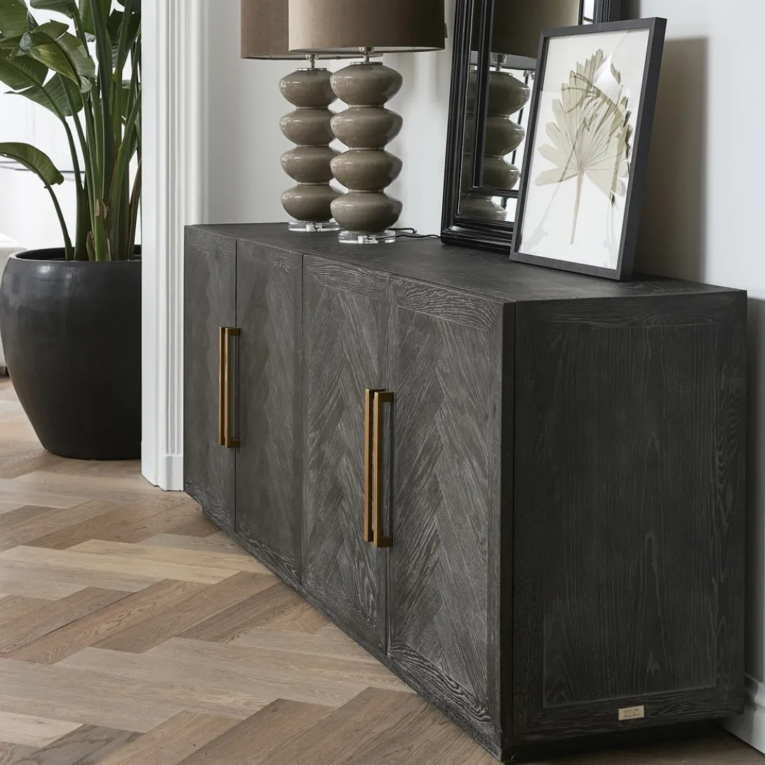 In de 5th Avenue-serie is dit een royaal dressoir van wel 2.30 meter breed. Het hout van deze blikvanger is in een visgraatpatroon gelegd en heeft een donkere coating gekregen, waar de houtnerf doorheen schemert. De vier deuren beschikken over een softclose-mechanisme. Tip: gebruik voor het onderhoud de Premium Wood Care Kit..