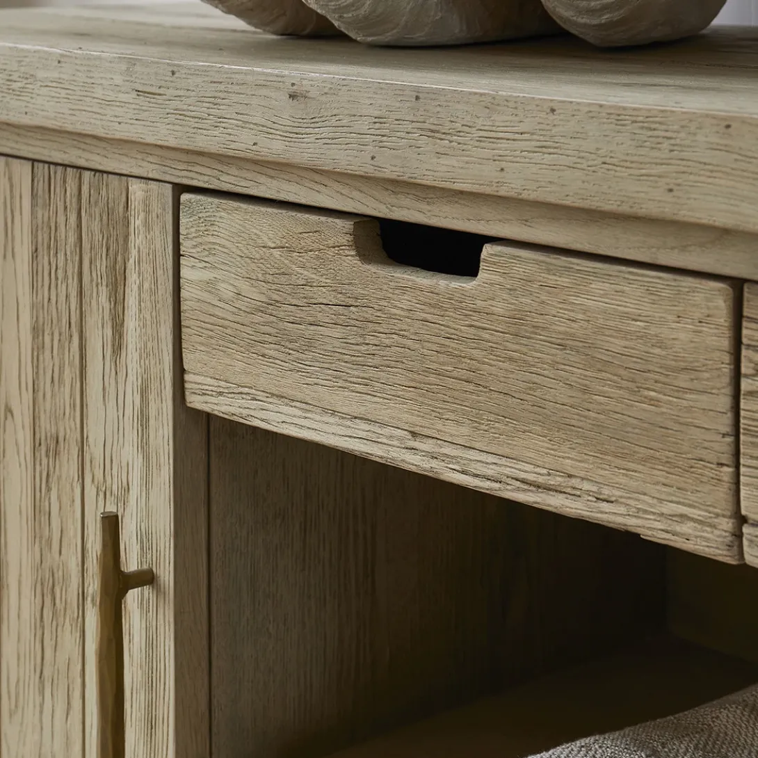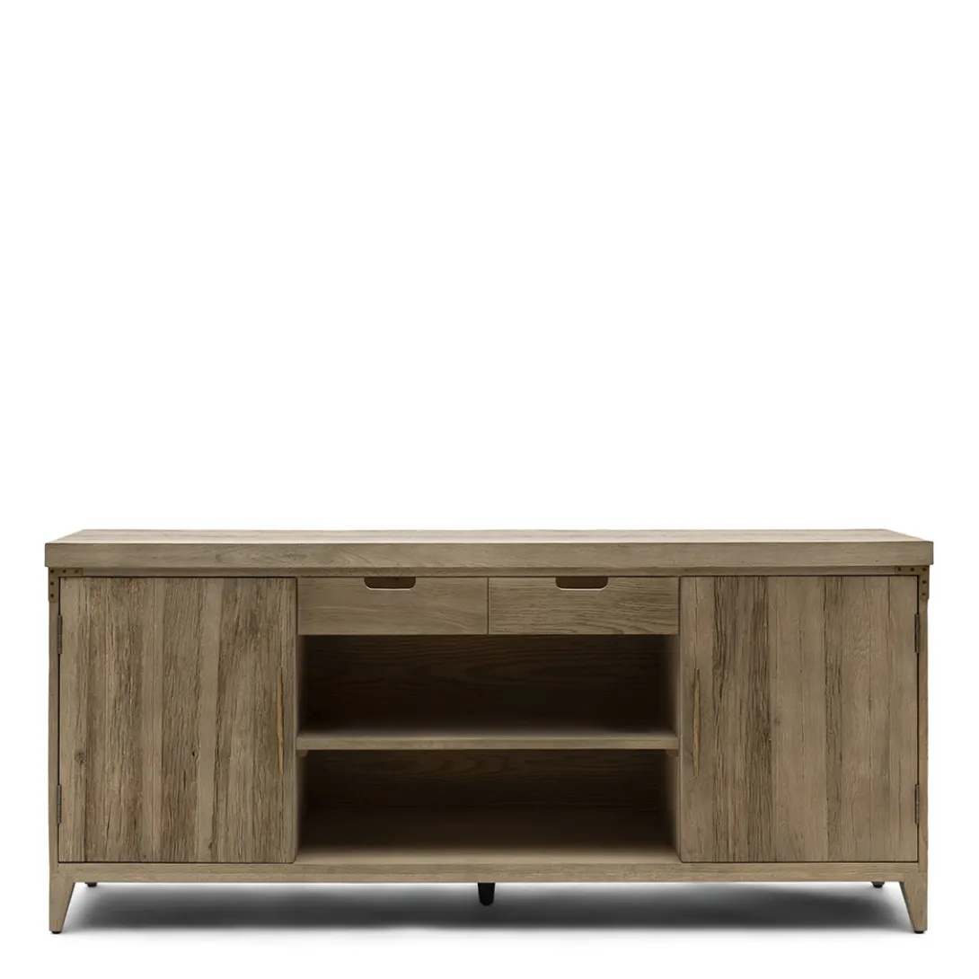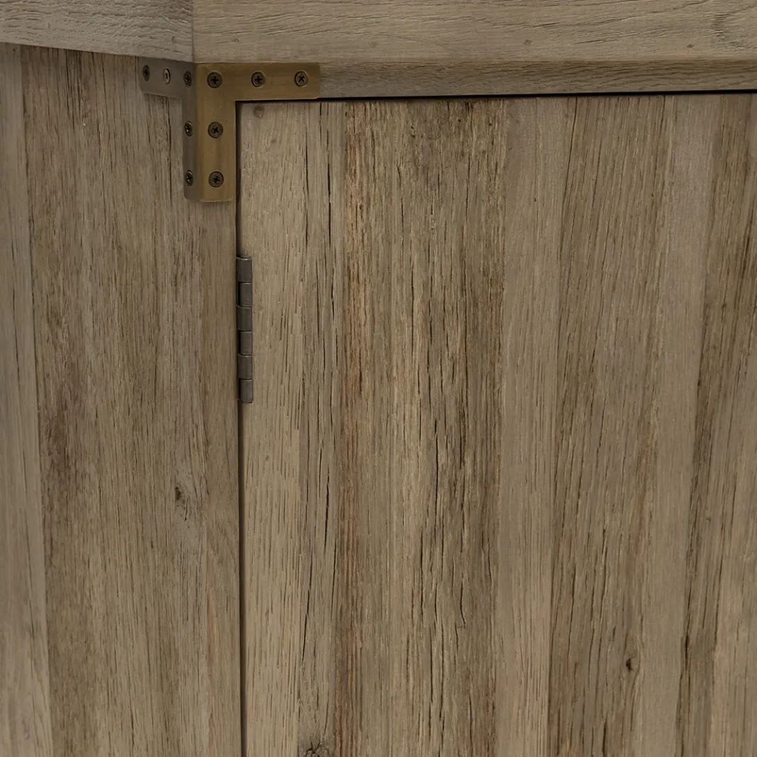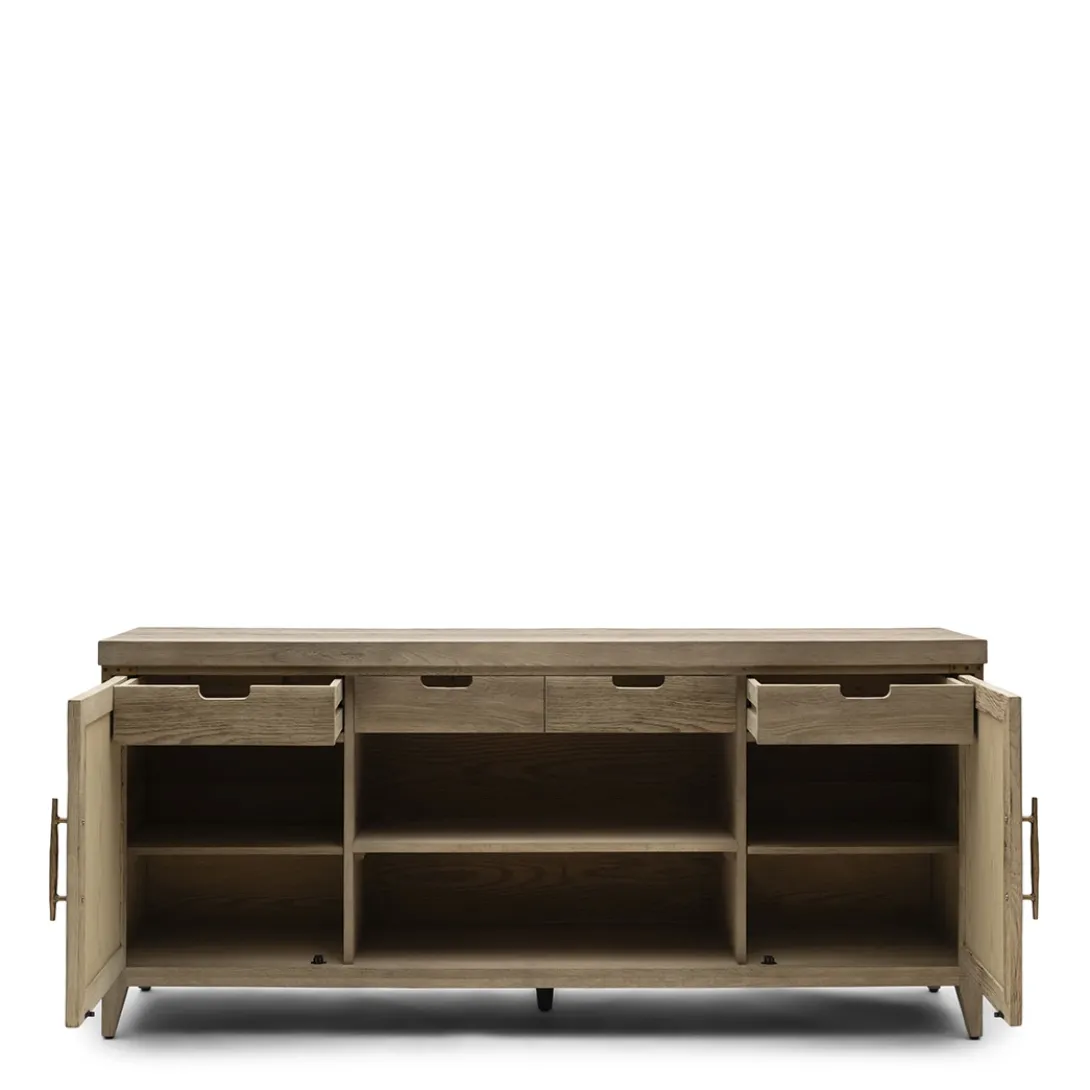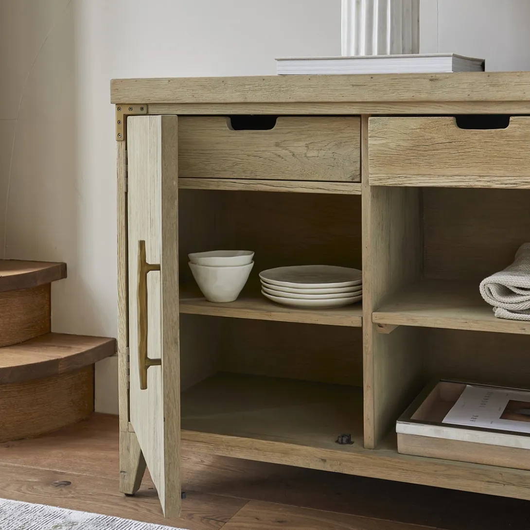 Ontdek de Brescia Dressoir, een prachtige combinatie van stijl en duurzaamheid. Gemaakt van gerecycled eikenhout, essenhout, glas en metaal, biedt deze dresser zowel open displayruimte als gesloten opbergruimte op pootjes, waardoor je je bezittingen op een elegante manier kunt organiseren en presenteren.