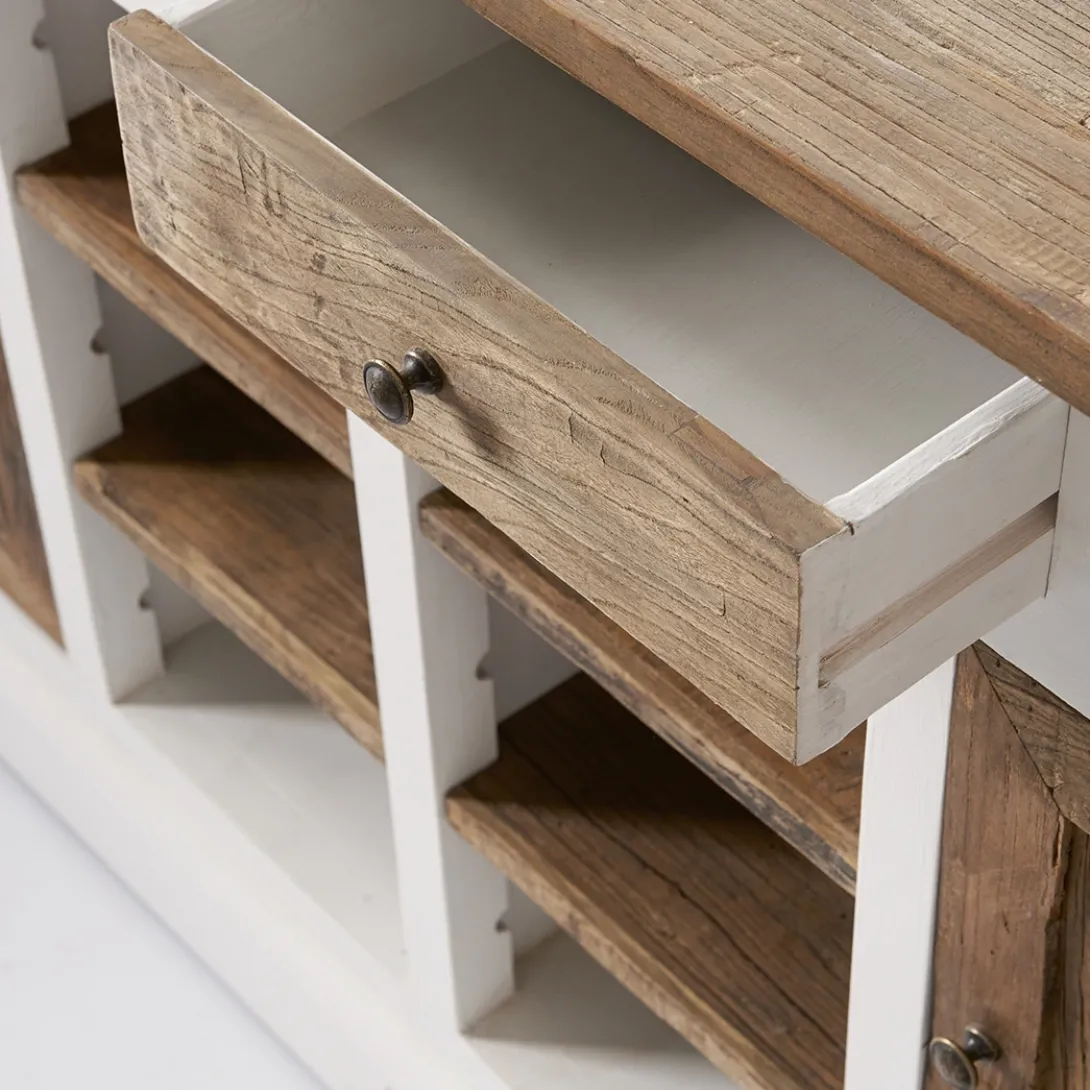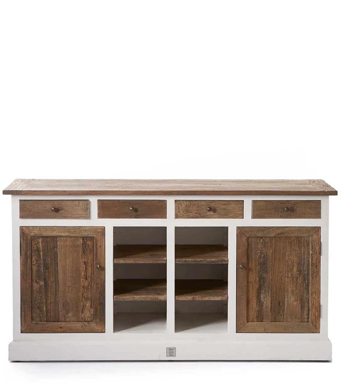 De populaire Driftwood serie is uitgebreid met dit prachtige dressoir. De basis is van populierenhout, de top, deuren en lades van oude houten schuurdeuren. In het midden 2 planken, achter de deuren één plank voor het opbergen van uw spullen