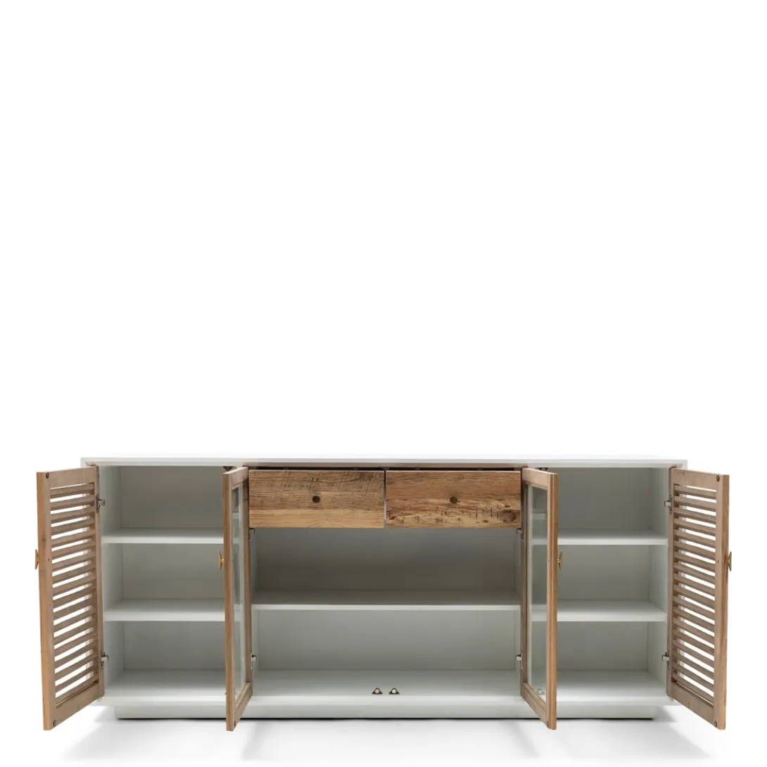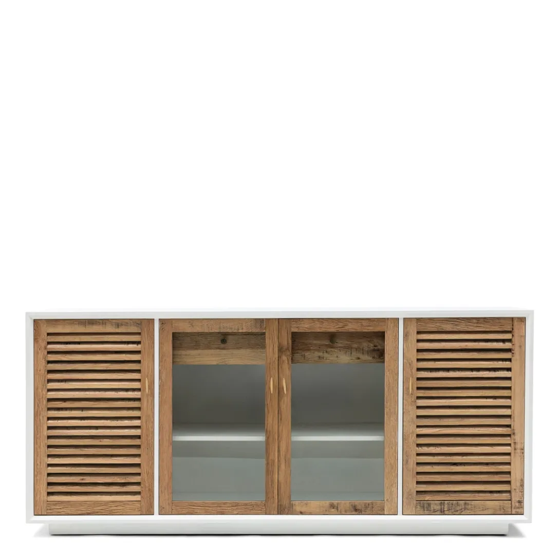 - Het Lake dressoir met houten deuren is een elegante aanvulling op je interieur. De twee buitenste deuren hebben een louvre inzet voor een charmante, klassieke uitstraling, terwijl de twee middelste deuren van glas een moderne touch toevoegen. Het dressoir heeft twee handige lades, die extra opbergruimte bieden voor een praktische en stijlvolle oplossing in je interieur. Elk dressoir is uniek door het gebruik van teruggewonnen eikenhout.