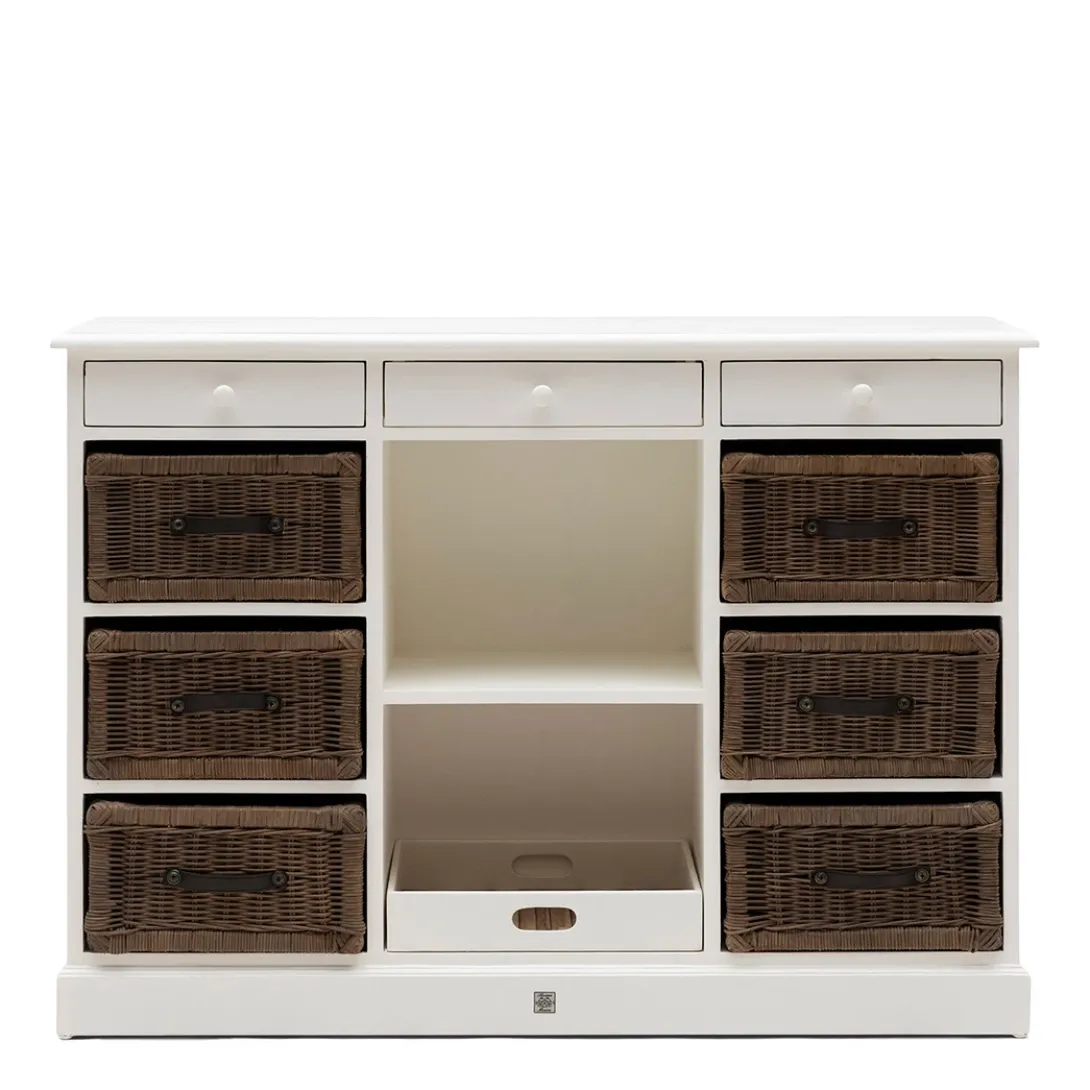 De Rangez en Plus collectie bestaat uit verschillende meubels om je spullen in te bewaren. Deze collectie kenmerkt zich door het gebruik en de combinatie van hard hout en rattan. Dit dressoir bestaat uit drie houten lades, aan weerszijden drie rattan lades en een mooi, houten dienblad.