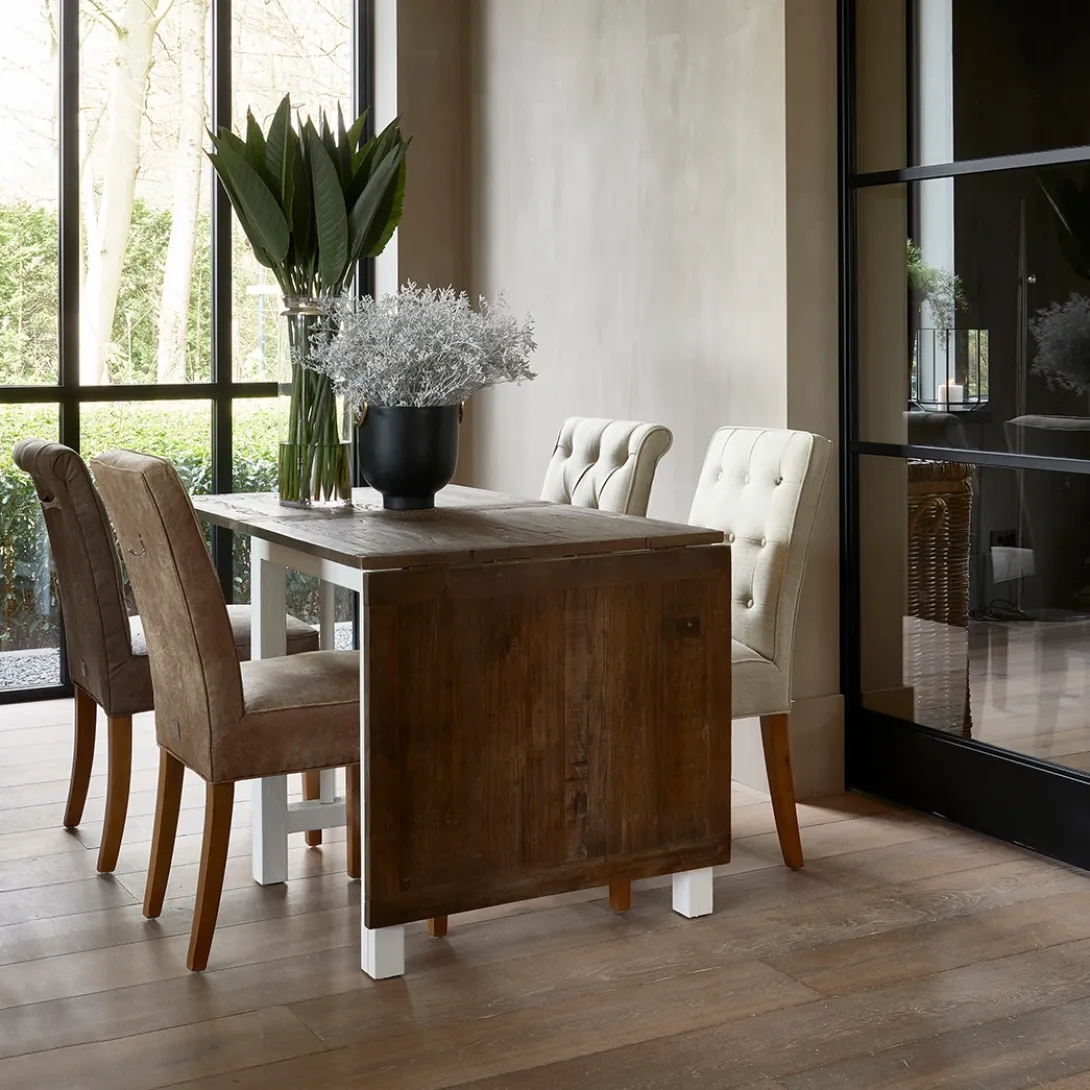 De degelijke eetkamerstoelen uit de Cape Breton-collectie zijn verkrijgbaar in meerdere kleuren. Dit zorgt ervoor dat er voor ieder interieur een stoel te vinden is die passend is. De stoelen zijn bekleed met pellini leer en door een speciale bewerking is het net of deze stoffering geschuurd is. Hierdoor krijgt de eetkamerstoel een vintage uitstraling.
