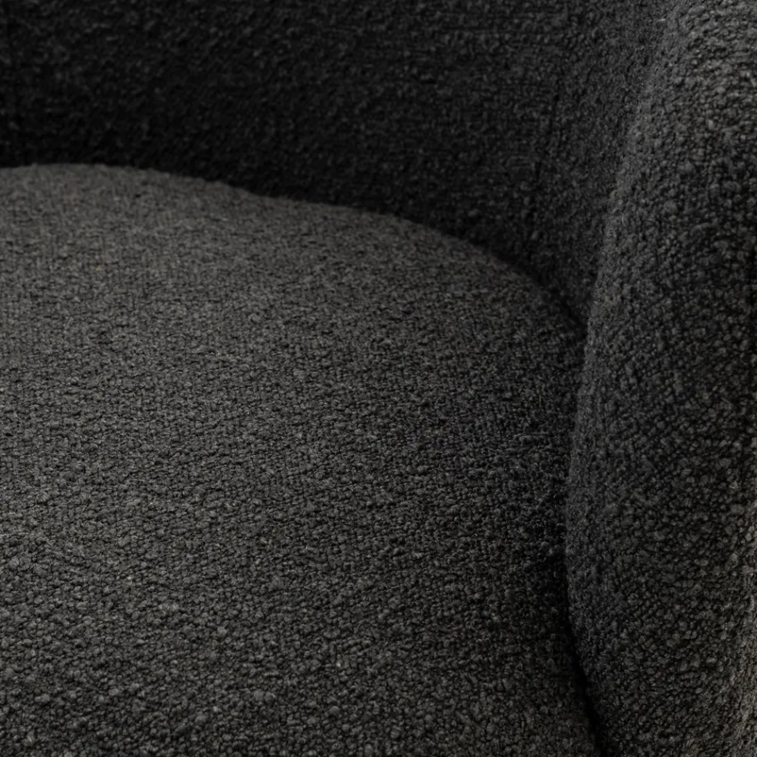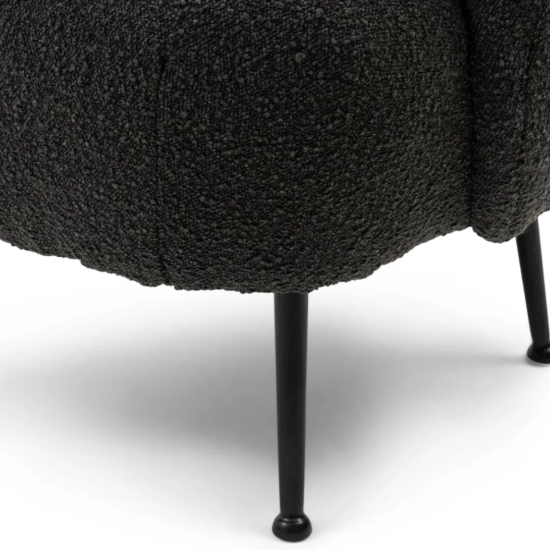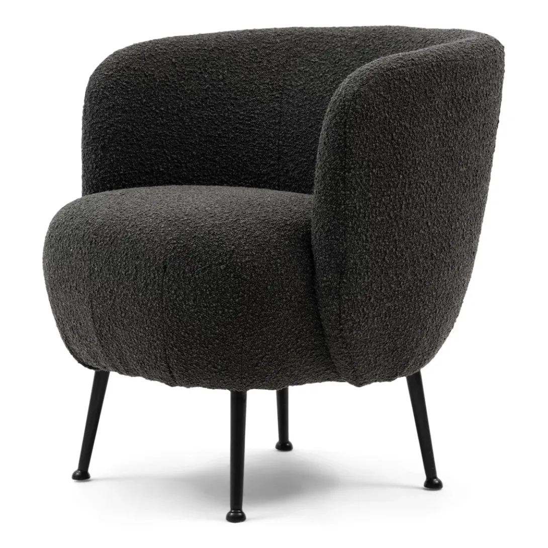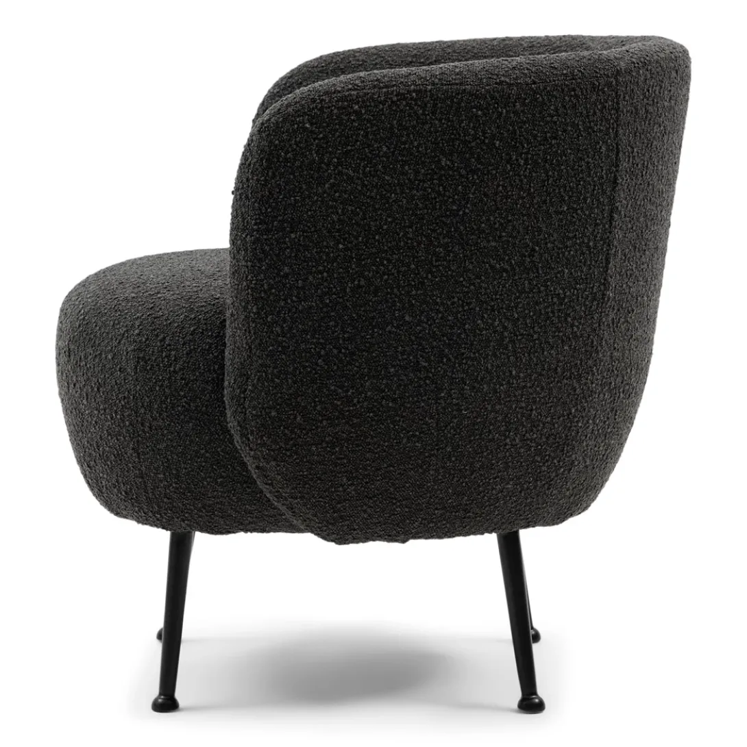 Dankzij de fijne bouclé bekleding in Beluga en de ronde vorm heeft deze eetkamerstoel een retrolook. De metalen, zwarte poten staan strak op de vloer. De stoel past erg goed in het interieur anno nu.