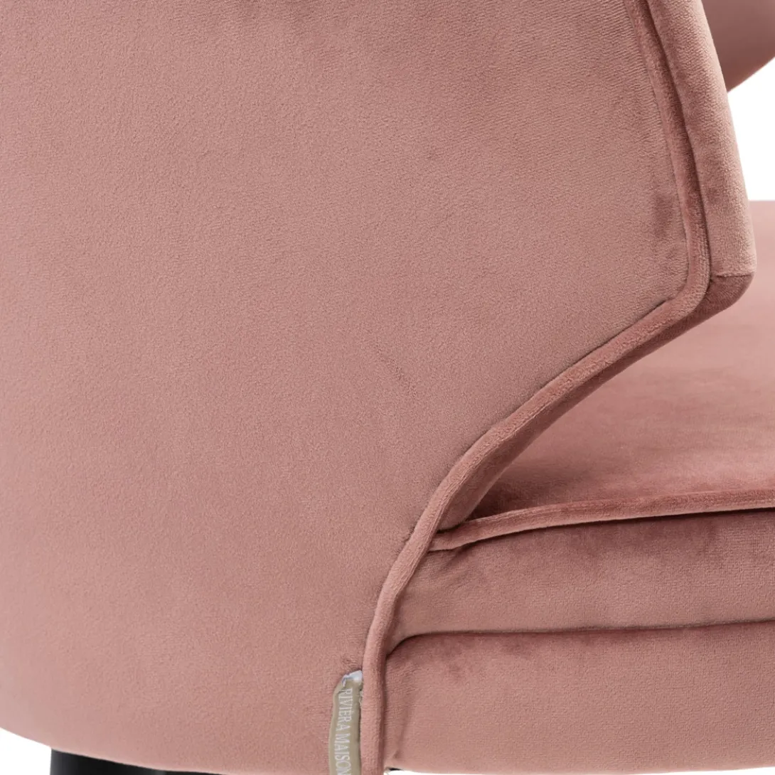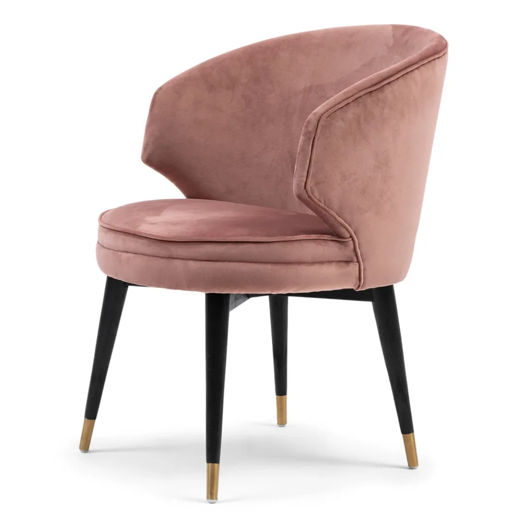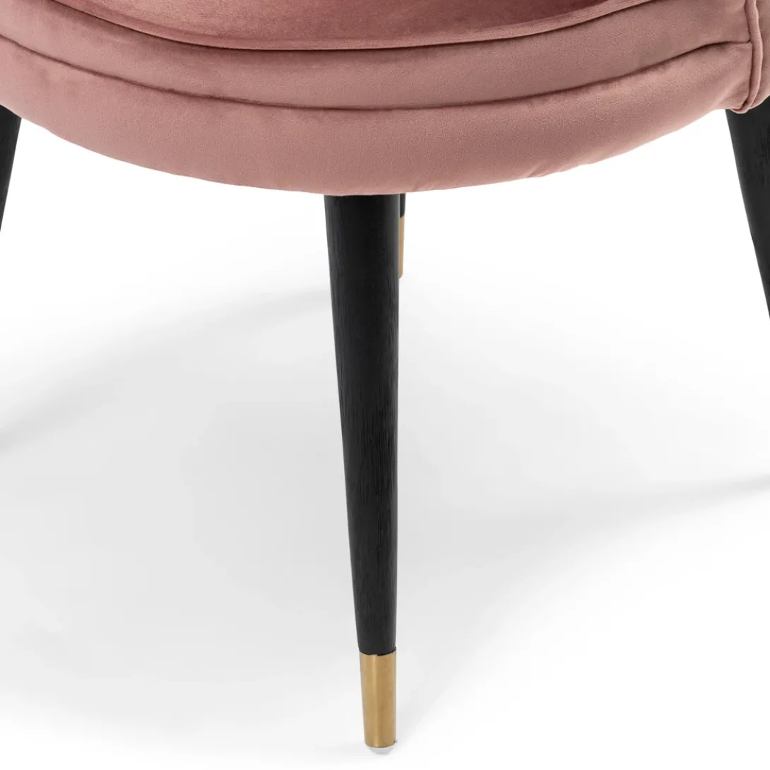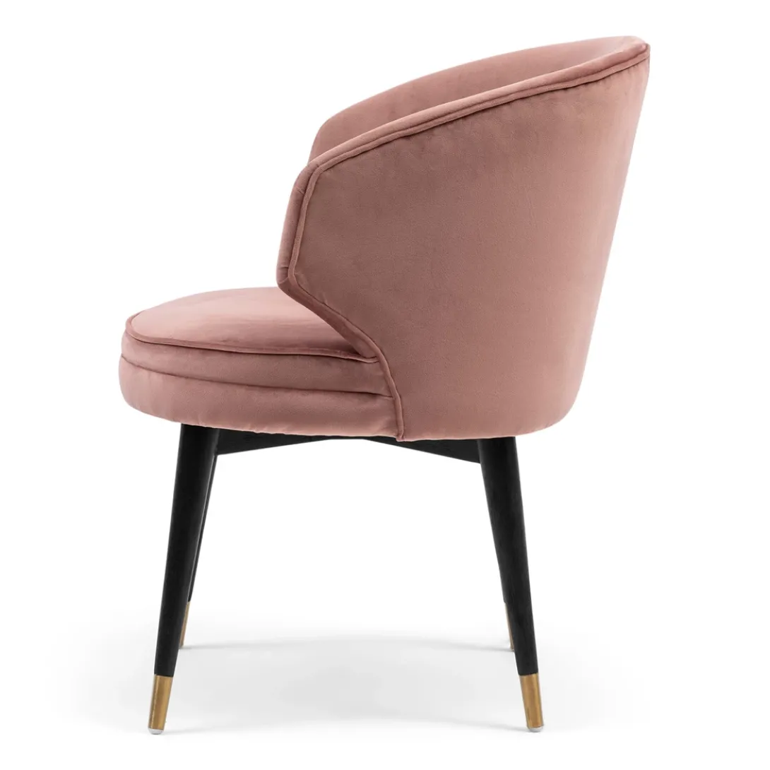 Wie van design houdt, valt voor deze eetkamerstoel. Rond gevormd, de rugleuning loopt door in de armleuning. Bovendien is hij heel comfortabel. De bekleding is van zacht velours, in de kleur Rose Stain. De zwarte poten zijn van rubberhout, aan het uiteinde zijn de poten afgewerkt met een soft gold touch.