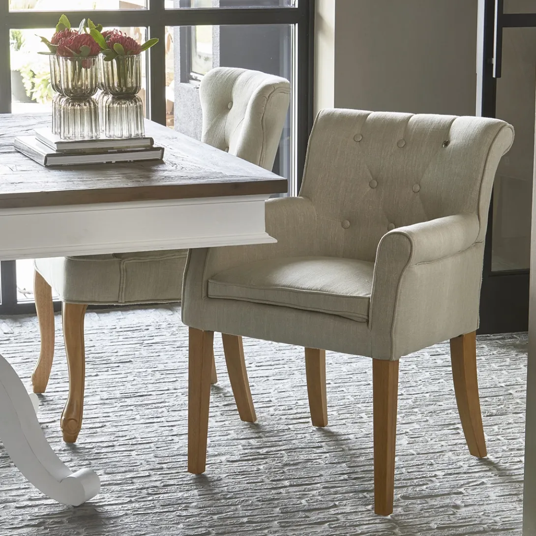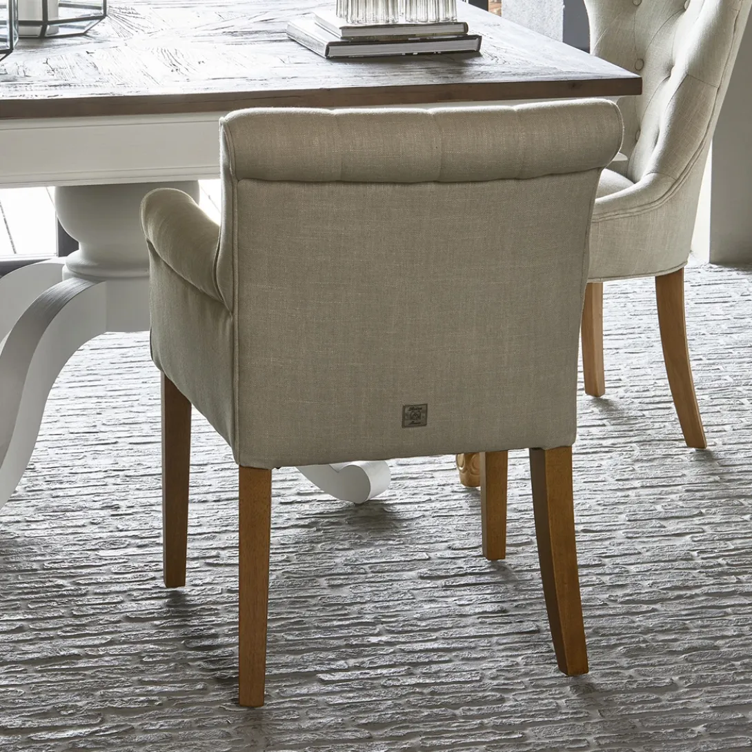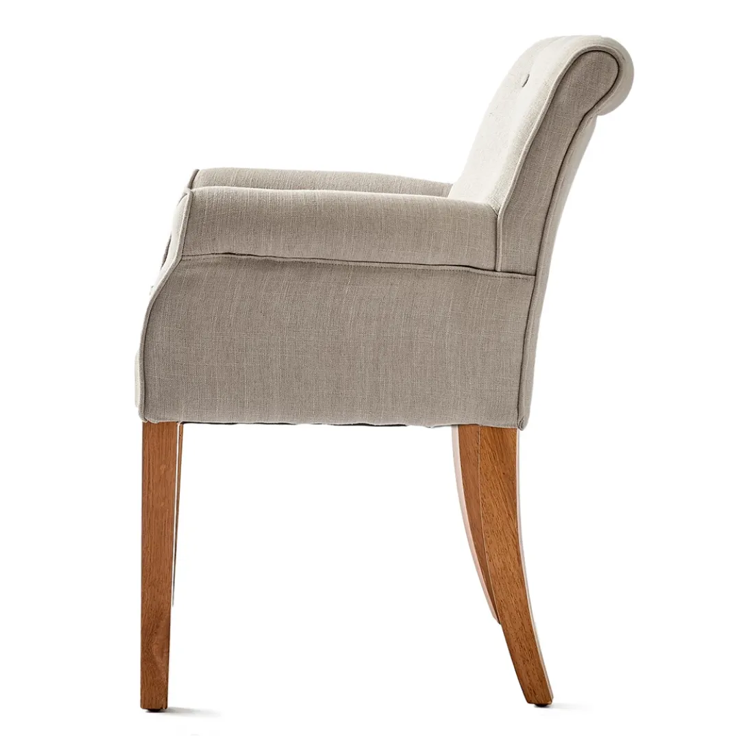 De La Scala Dining Armchair is vernoemd naar een van de mooiste en beroemdste operagebouwen ter wereld: Teatro alla Scala in Milaan. De stoel is klassiek vormgegeven en heeft een gecapitonneerde rugleuning met daarin het Rivièra Maison trademark, de zilveren RM-knoop verwerkt. Verkrijgbaar in linnen en pellini.