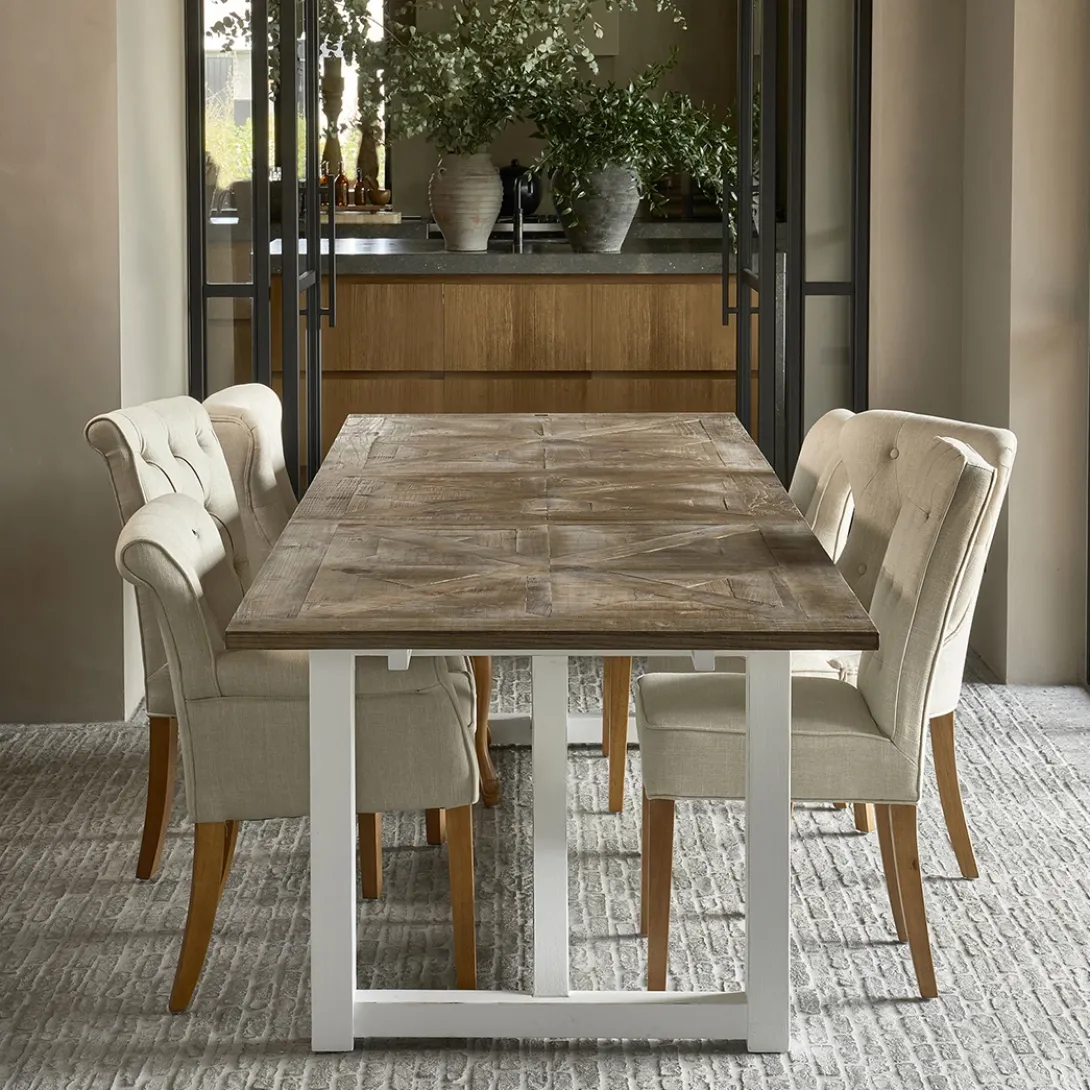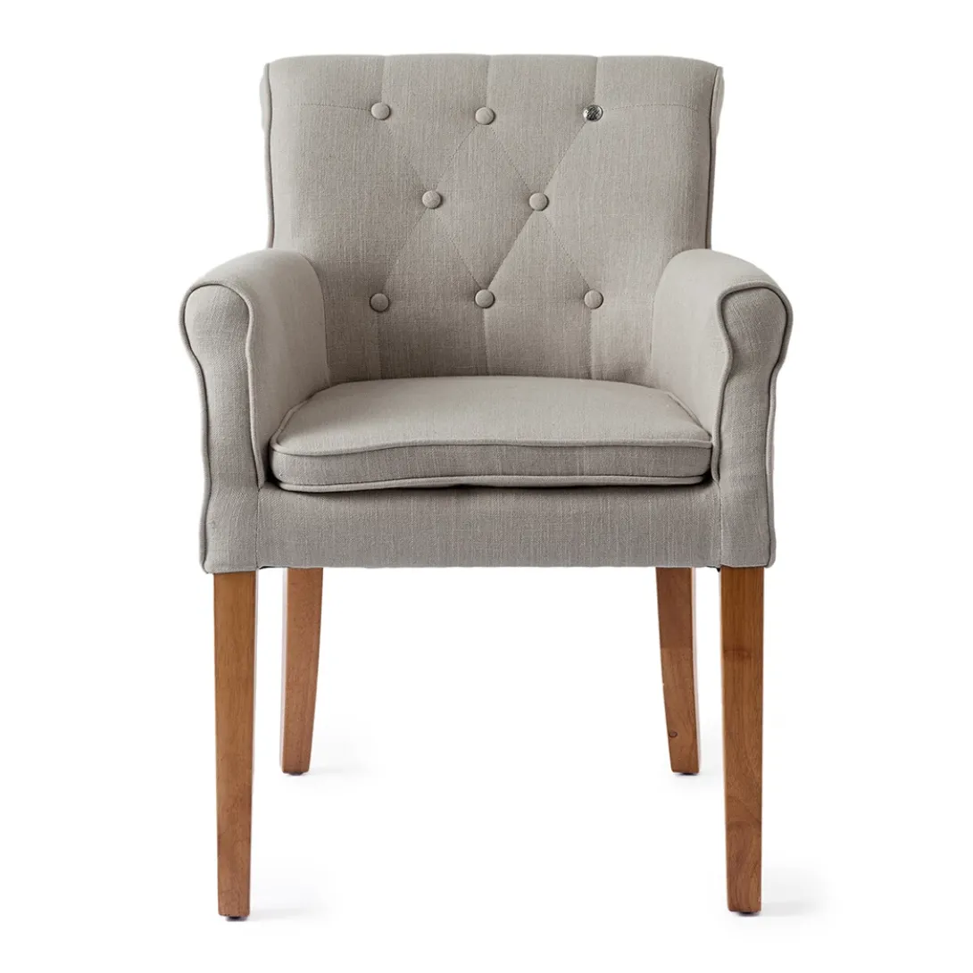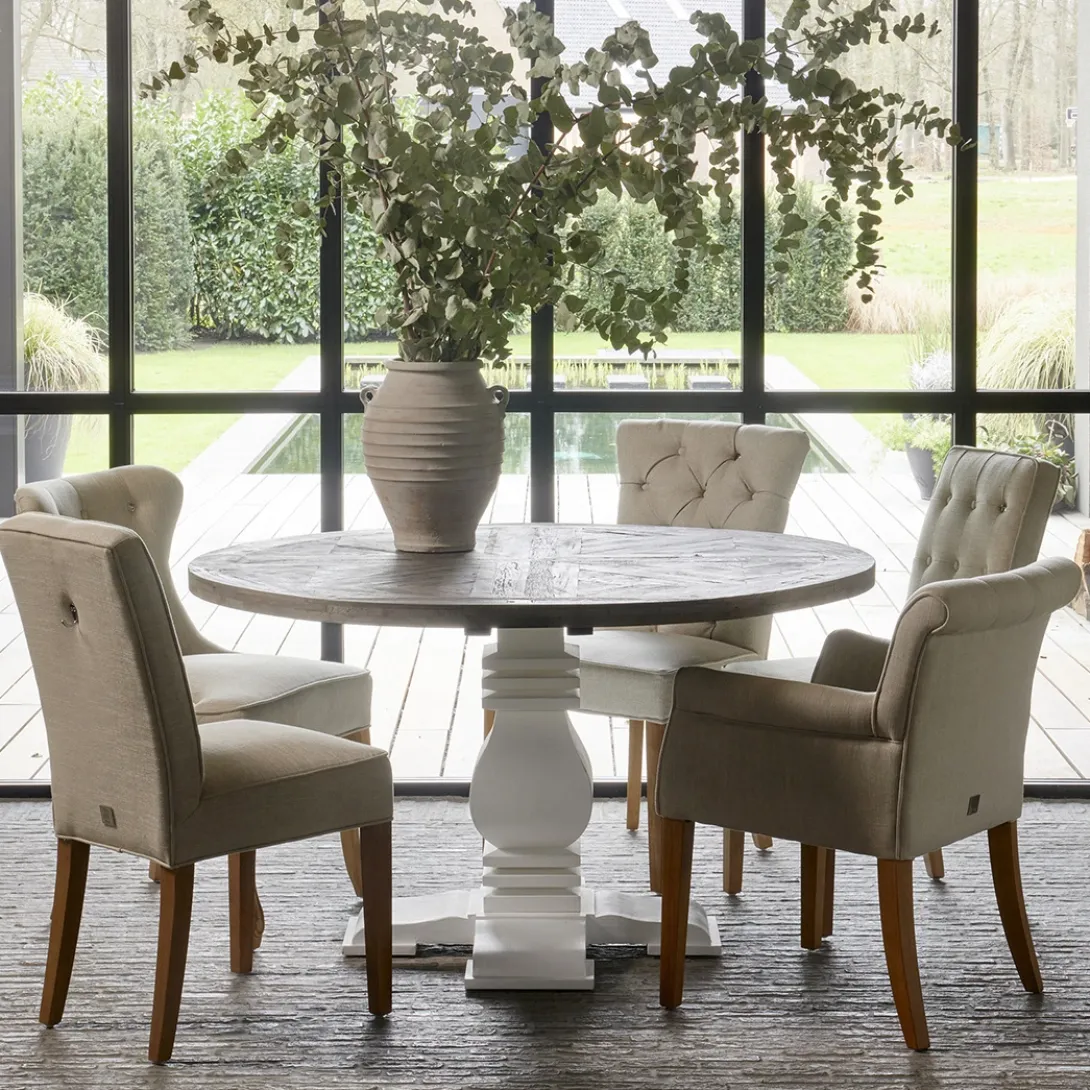 De La Scala Dining Armchair is vernoemd naar een van de mooiste en beroemdste operagebouwen ter wereld: Teatro alla Scala in Milaan. De stoel is klassiek vormgegeven en heeft een gecapitonneerde rugleuning met daarin het Rivièra Maison trademark, de zilveren RM-knoop verwerkt. Verkrijgbaar in linnen en pellini.