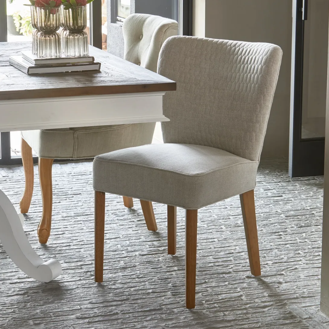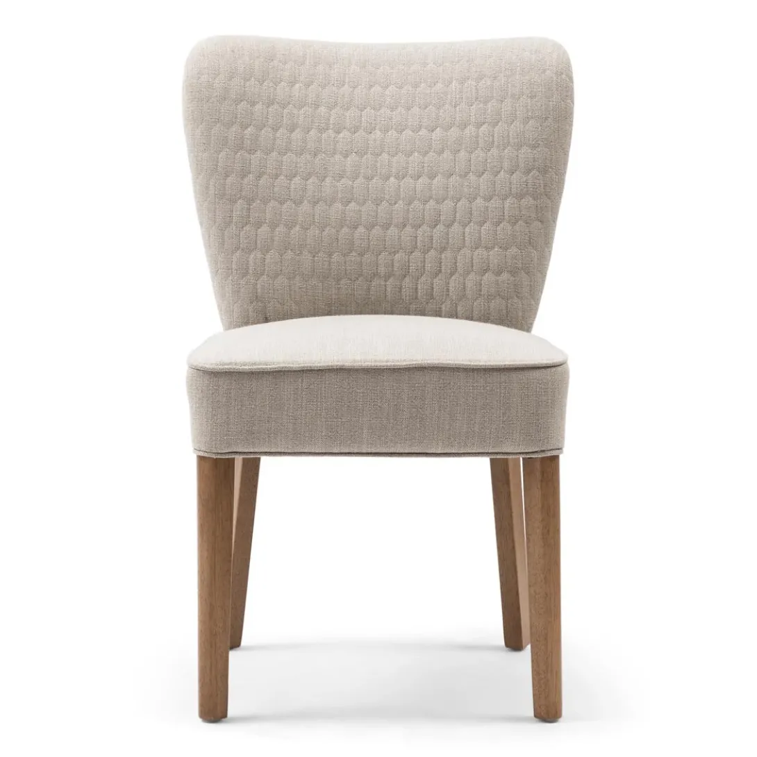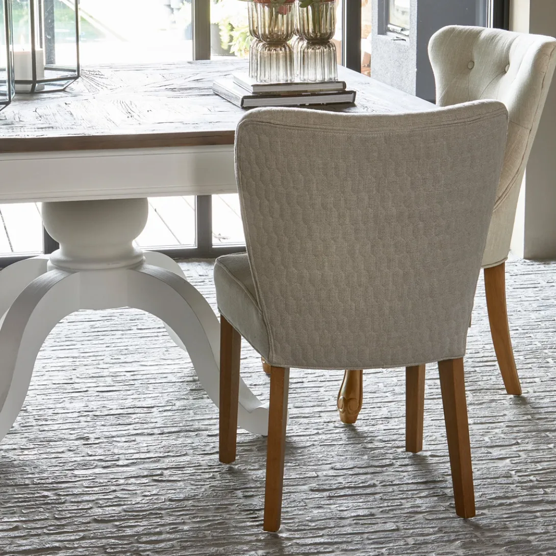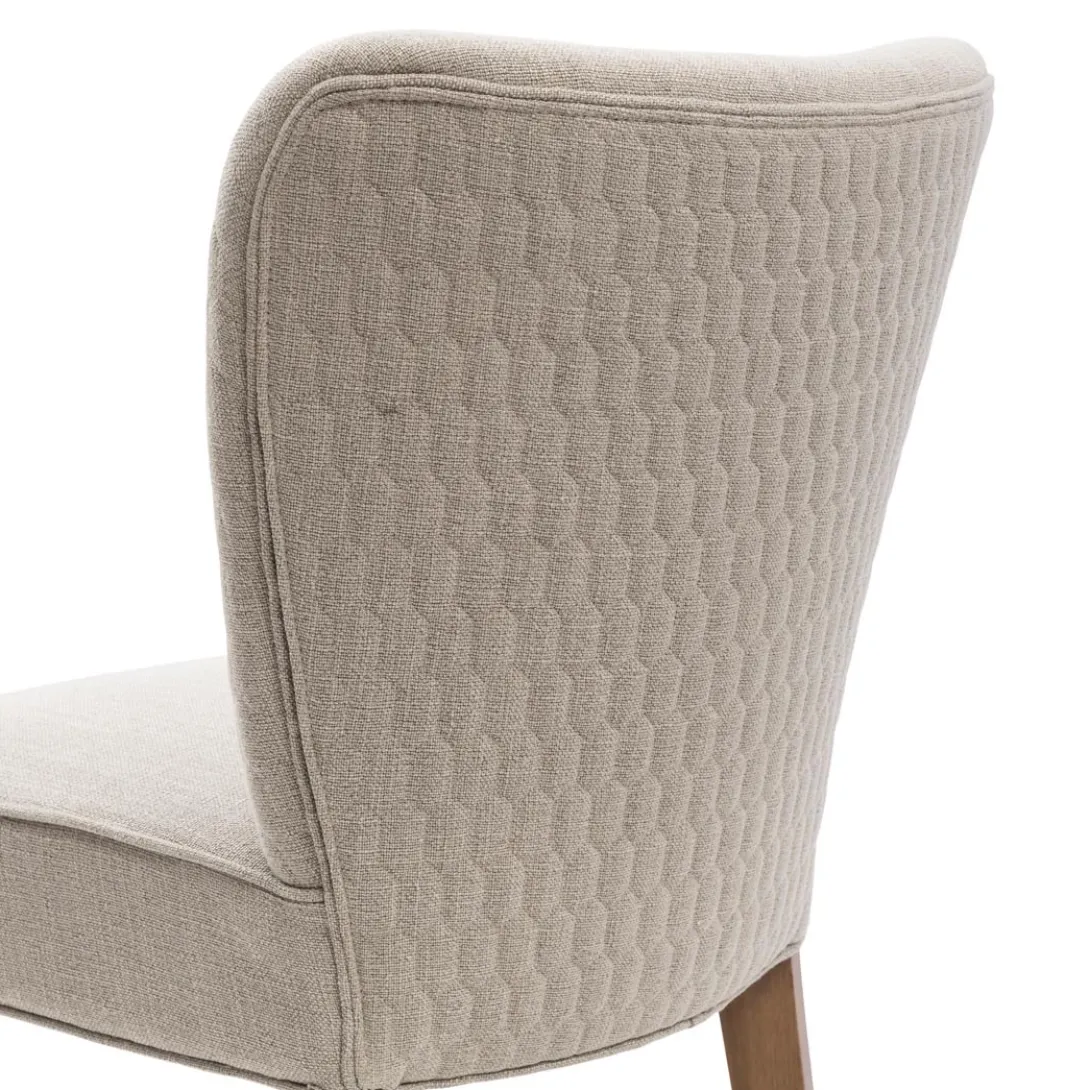 Aan de voor- en achterkant heeft de rugleuning van de Louise Dining Chair een hexagon patroon. Het zitgedeelte is vlak en comfortabel. De eetkamerstoel is onder andere verkrijgbaar in de tint ‘Fabulous Flax’ uit de New Jersey Collection Mouliné Linen-bekleding. Deze stof is gemaakt van linnen en viscose. De grijsbruine poten zijn gemaakt van rubberhout.