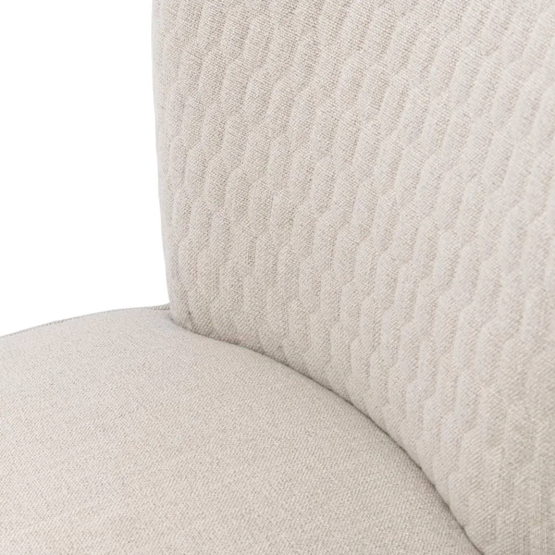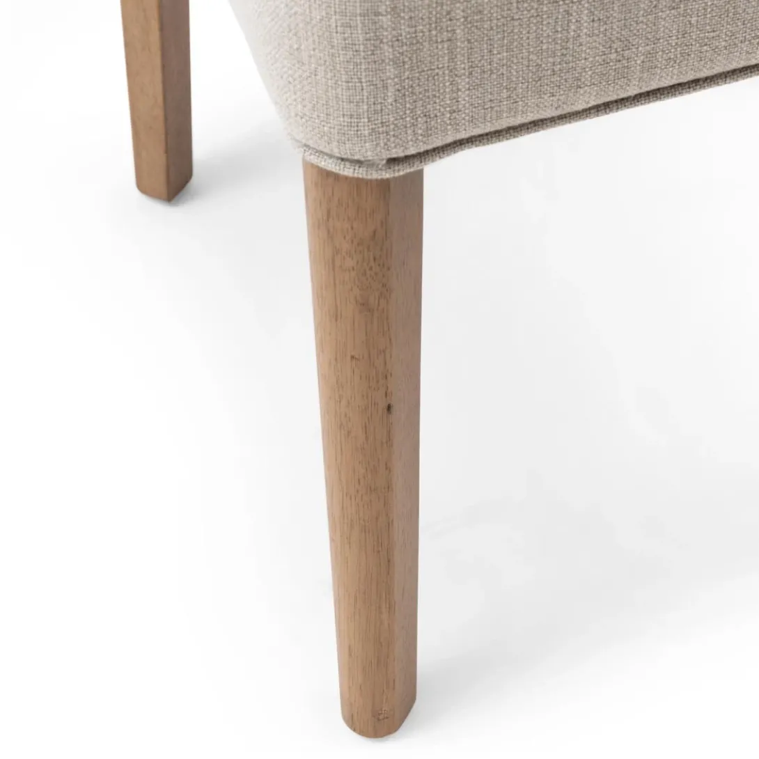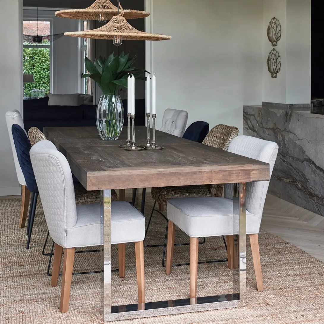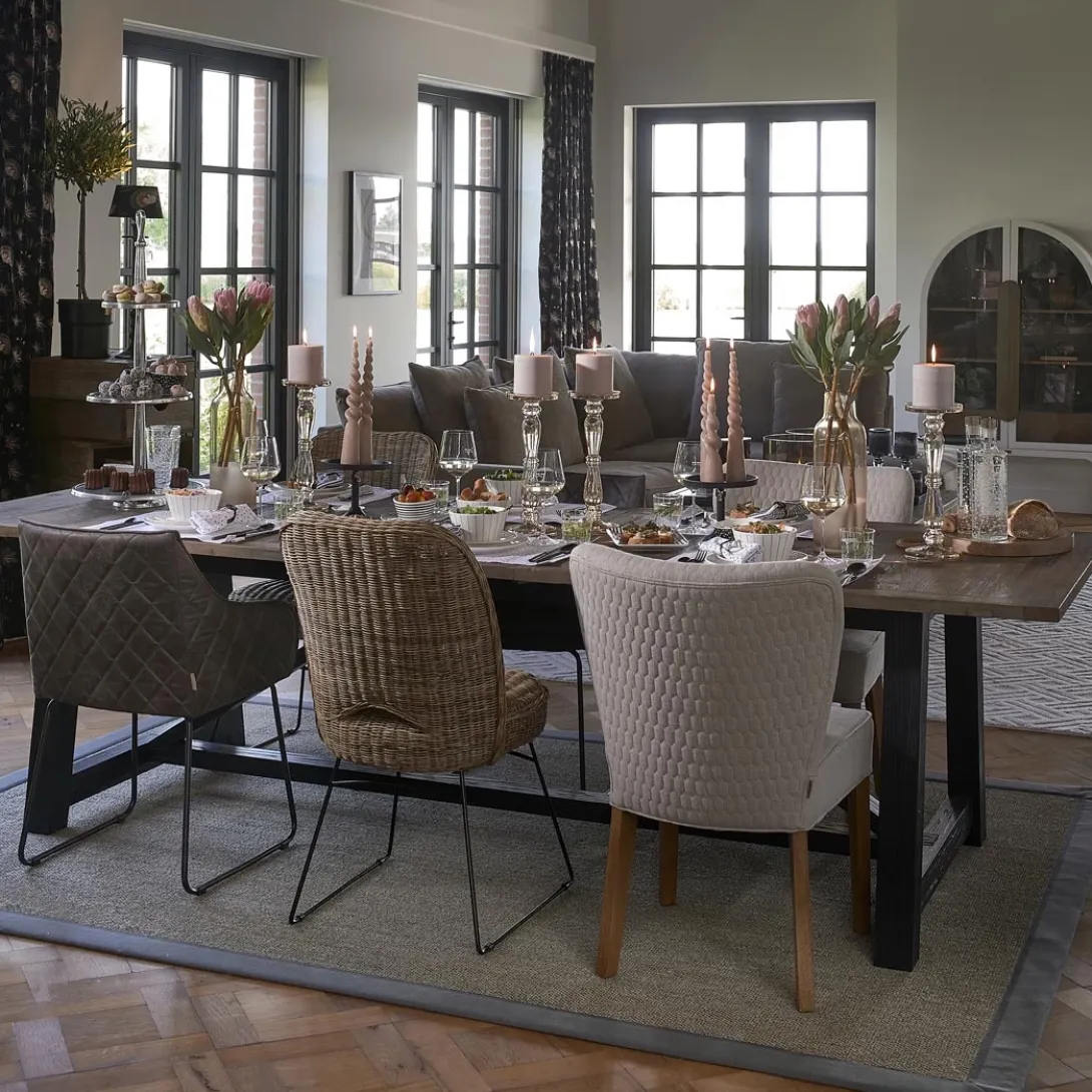 Aan de voor- en achterkant heeft de rugleuning van de Louise Dining Chair een hexagon patroon. Het zitgedeelte is vlak en comfortabel. De eetkamerstoel is onder andere verkrijgbaar in de tint ‘Fabulous Flax’ uit de New Jersey Collection Mouliné Linen-bekleding. Deze stof is gemaakt van linnen en viscose. De grijsbruine poten zijn gemaakt van rubberhout.