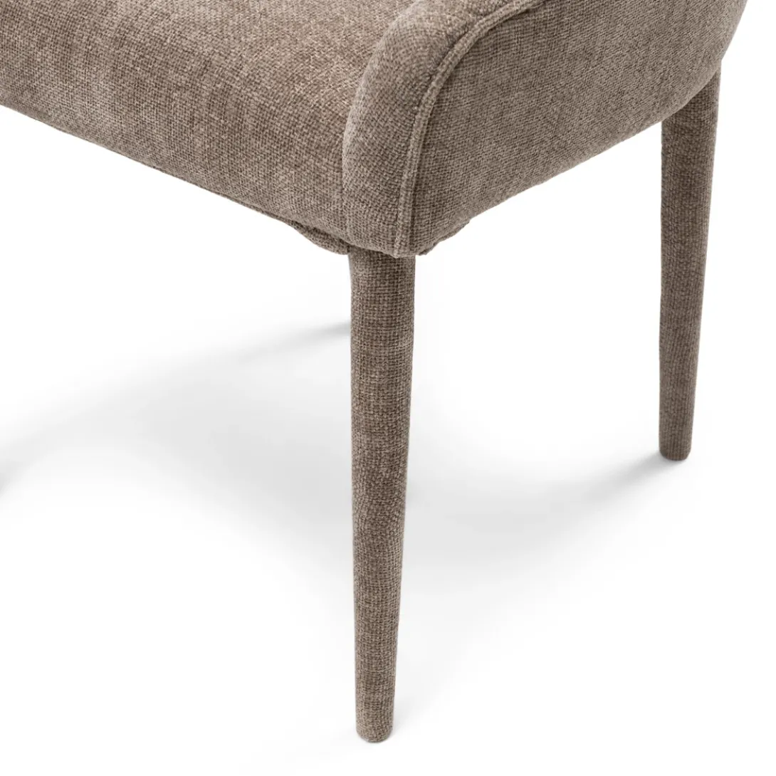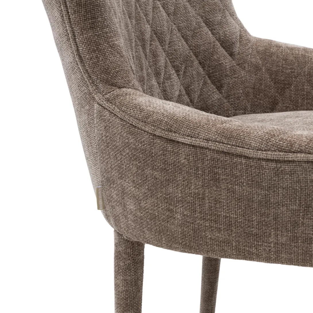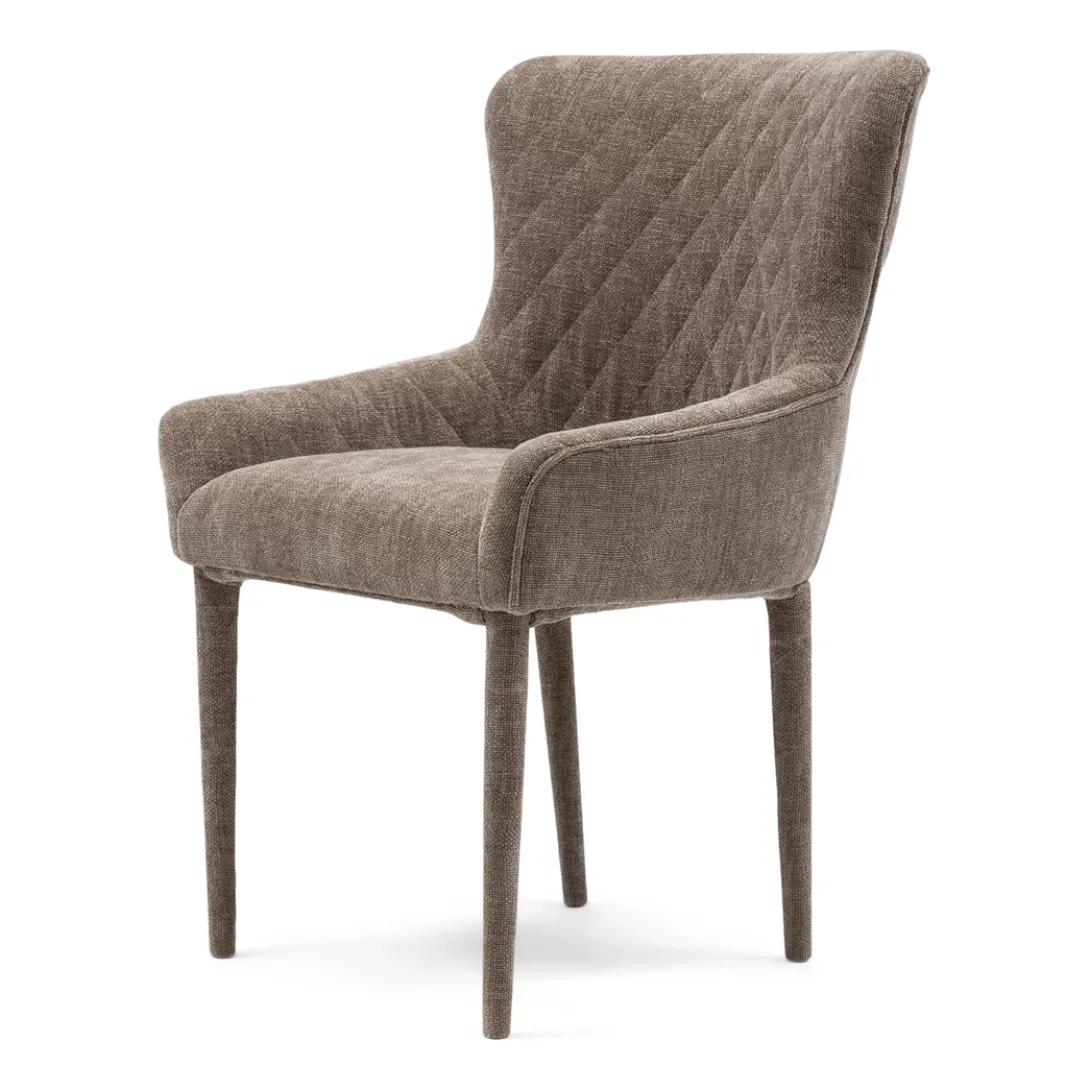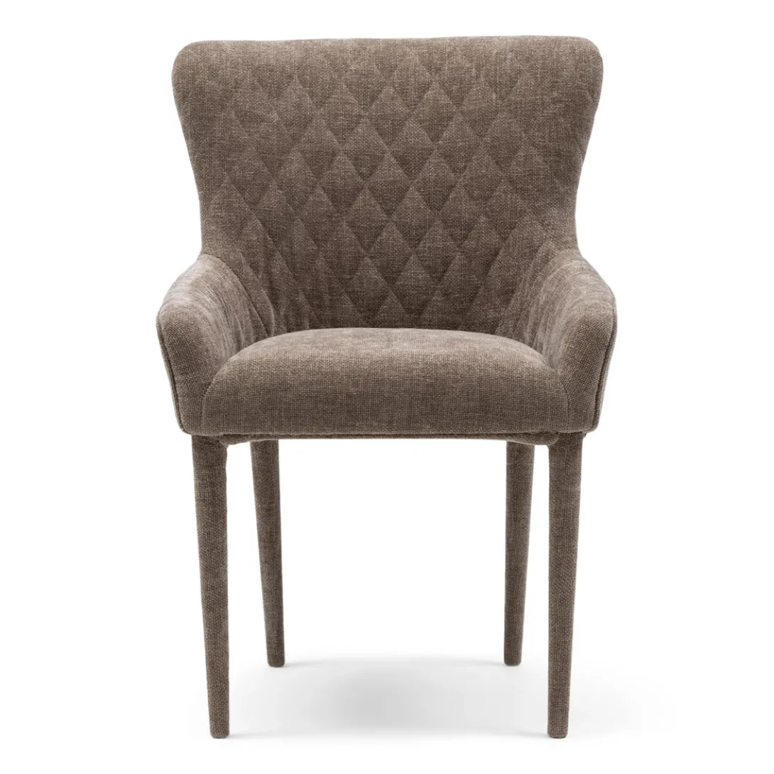 - Deze eetkamerstoel met armleuningen biedt ultiem comfort en stijl. Bekleed met een gemêleerde stof, die ook de poten omhult, is de stoel tot in de kleinste details verzorgd. De diepe zit en hoge rug zorgen voor een aangename zitervaring, terwijl het geruite stiksel een modern effect toevoegt. Het eigentijdse ontwerp past perfect in diverse interieurstijlen, waardoor deze stoel een elegante en comfortabele aanvulling is voor elke eetruimte.