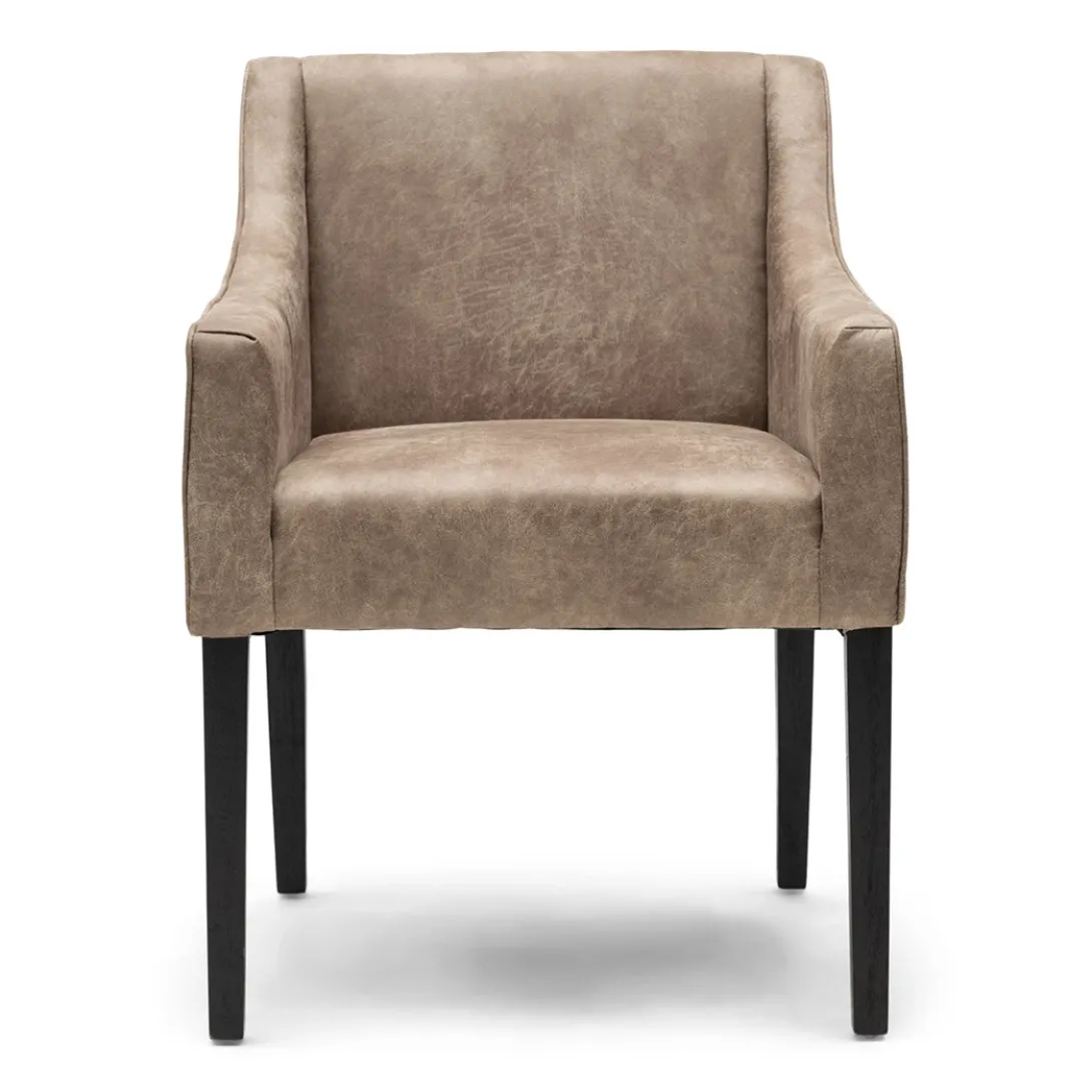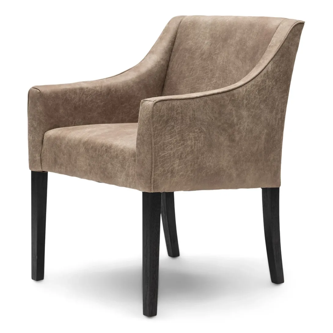 Eetkamerstoel Savile Row in de Pellini stof, in de kleur Camel is de stoel die je zoekt! Een tijdloos design, met comfortabele armleuningen in combinatie met de strakke zwarte rubberhouten poten straalt deze stoel moderne elegantie uit. Met een comfortabele afmeting van 61x56x86 cm, past deze stoel goed in elk interieur.
