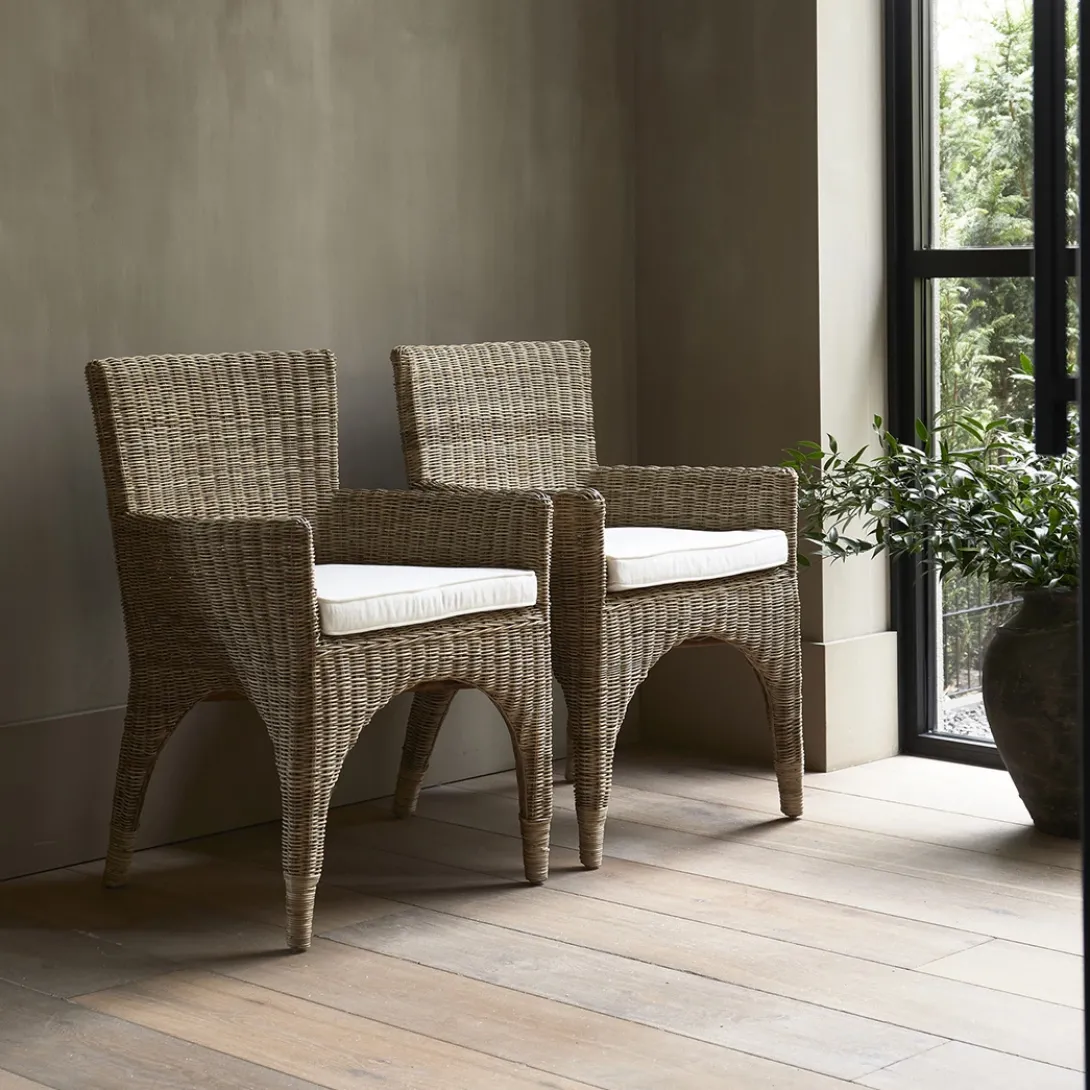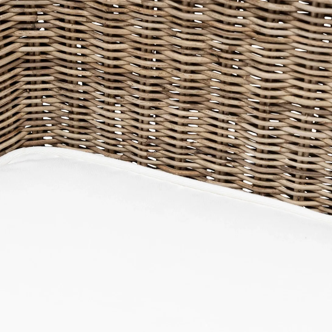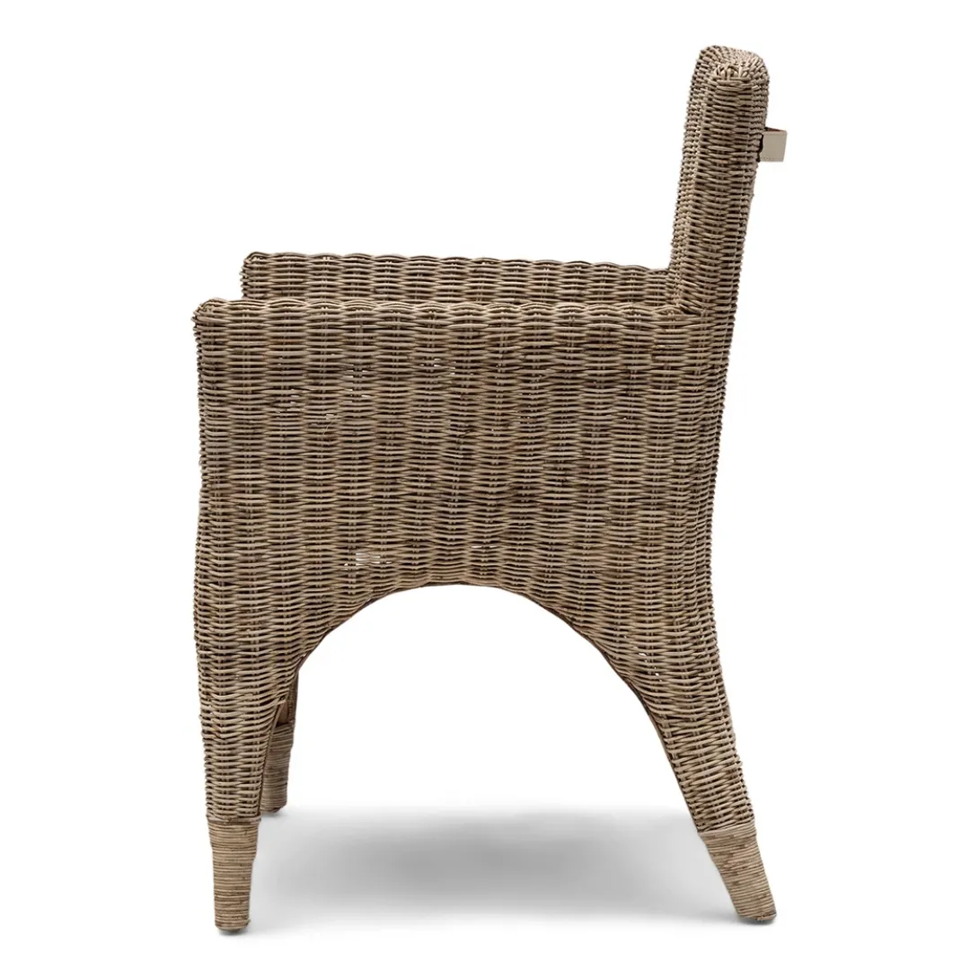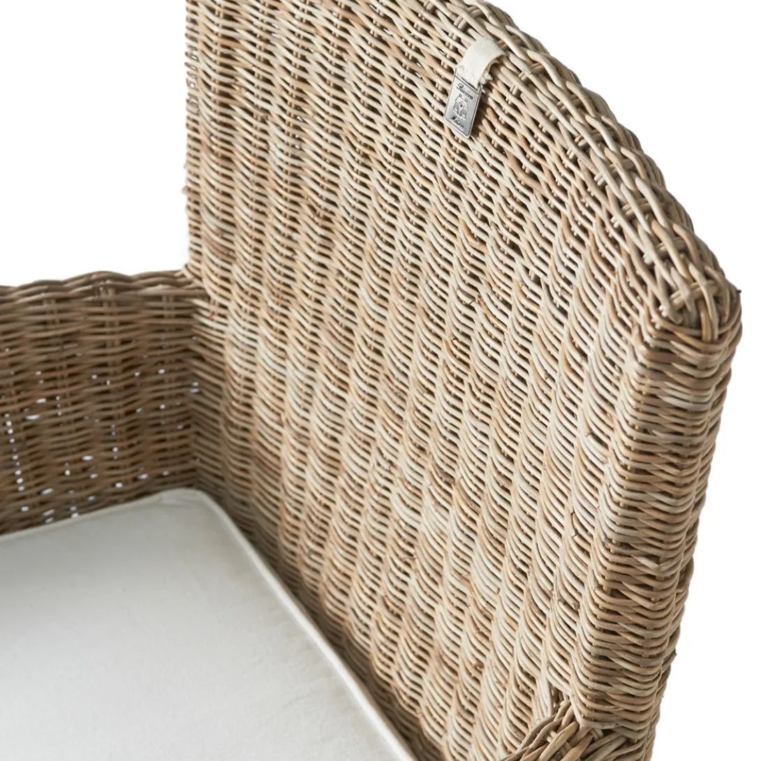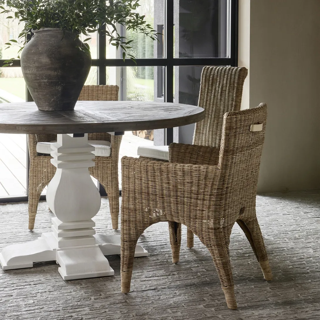 Eetkamerstoel, gemaakt van Rustic Rattan. Aan de achterkant van de stoelleuning is een off white leren handvat bevestigd. Rustic Rattan is een natuurproduct dat door een natuurlijk procedé wordt gekleurd. Ieder product is hierdoor uniek. Ook verkrijgbaar in wit.