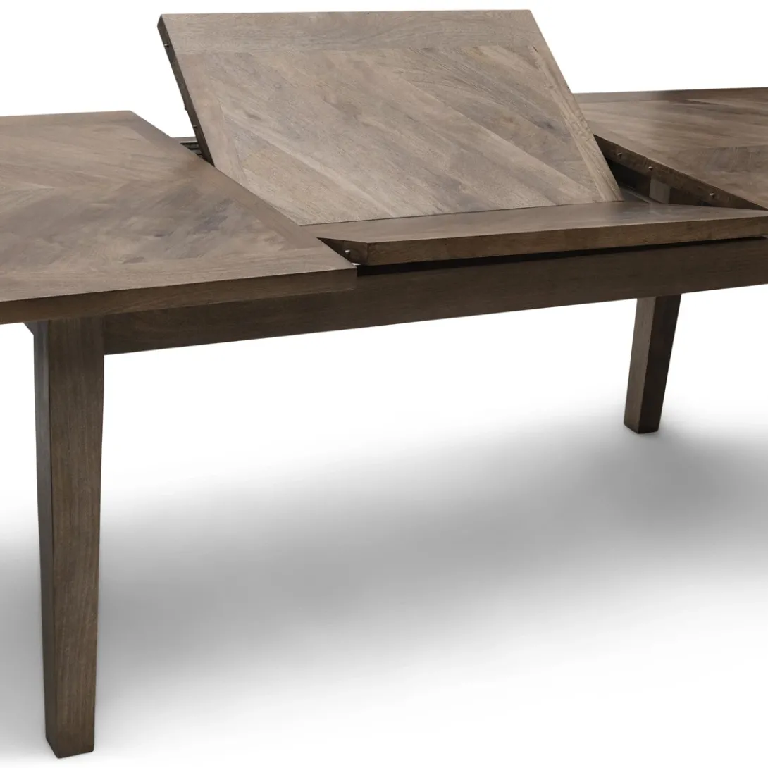 Dit is de verlengde, uitschuifbare Bodie Hill Eettafel, wat betekent dat er in het midden één deel is waarmee je de tafel kunt uitbreiden. Met dit middendeel ertussen is de tafel 260 cm lang. Ideaal voor groot diner met familie en vrienden. De tafel heeft een blad van mangohout en vier poten die op de grond samenkomen tot een stevig, smaakvol frame.
