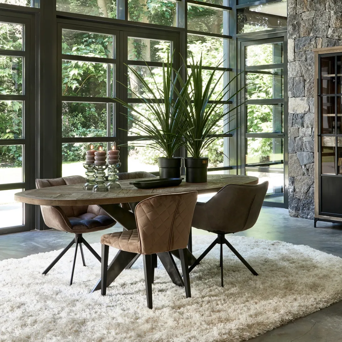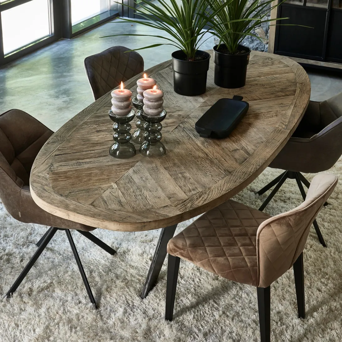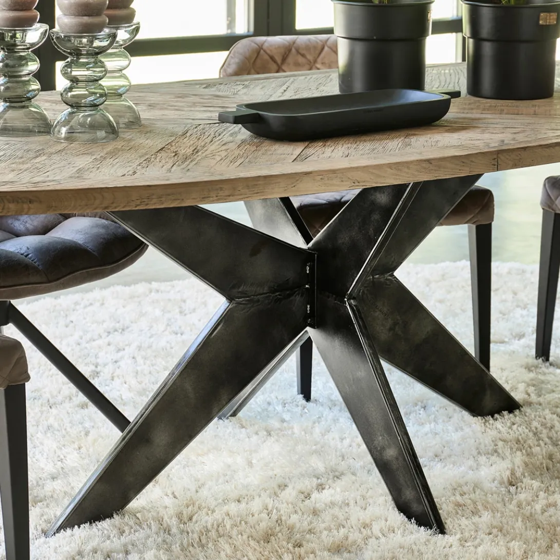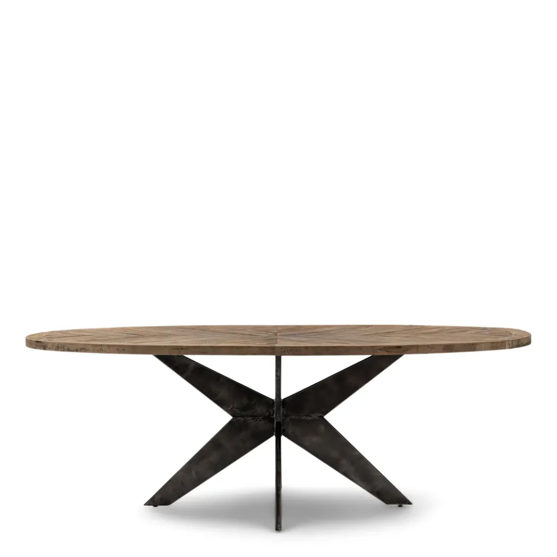 Een eettafel die stoer en klassiek combineert? Dan heb je het over de Falcon Crest-serie. Deze eettafels hebben namelijk een blad van stoer, ingelegd oud eikenhout, met een gekruist patroon Het onderstel is van matzwart metaal, waarin de kruisvorm terugkomt. De vorm van het tafelblad is ovaal.