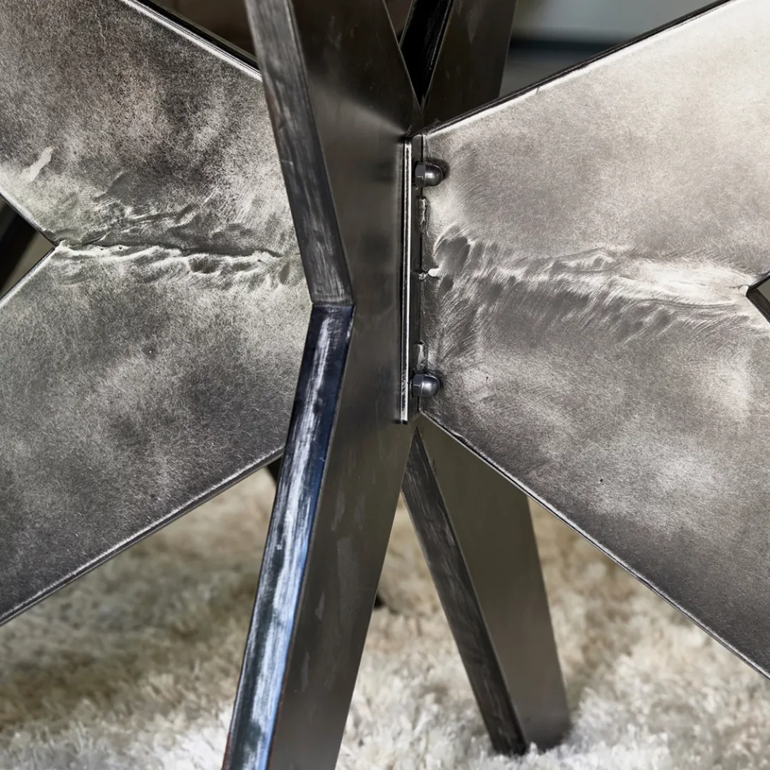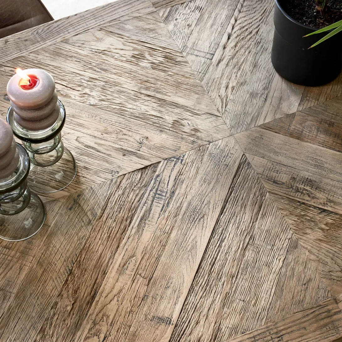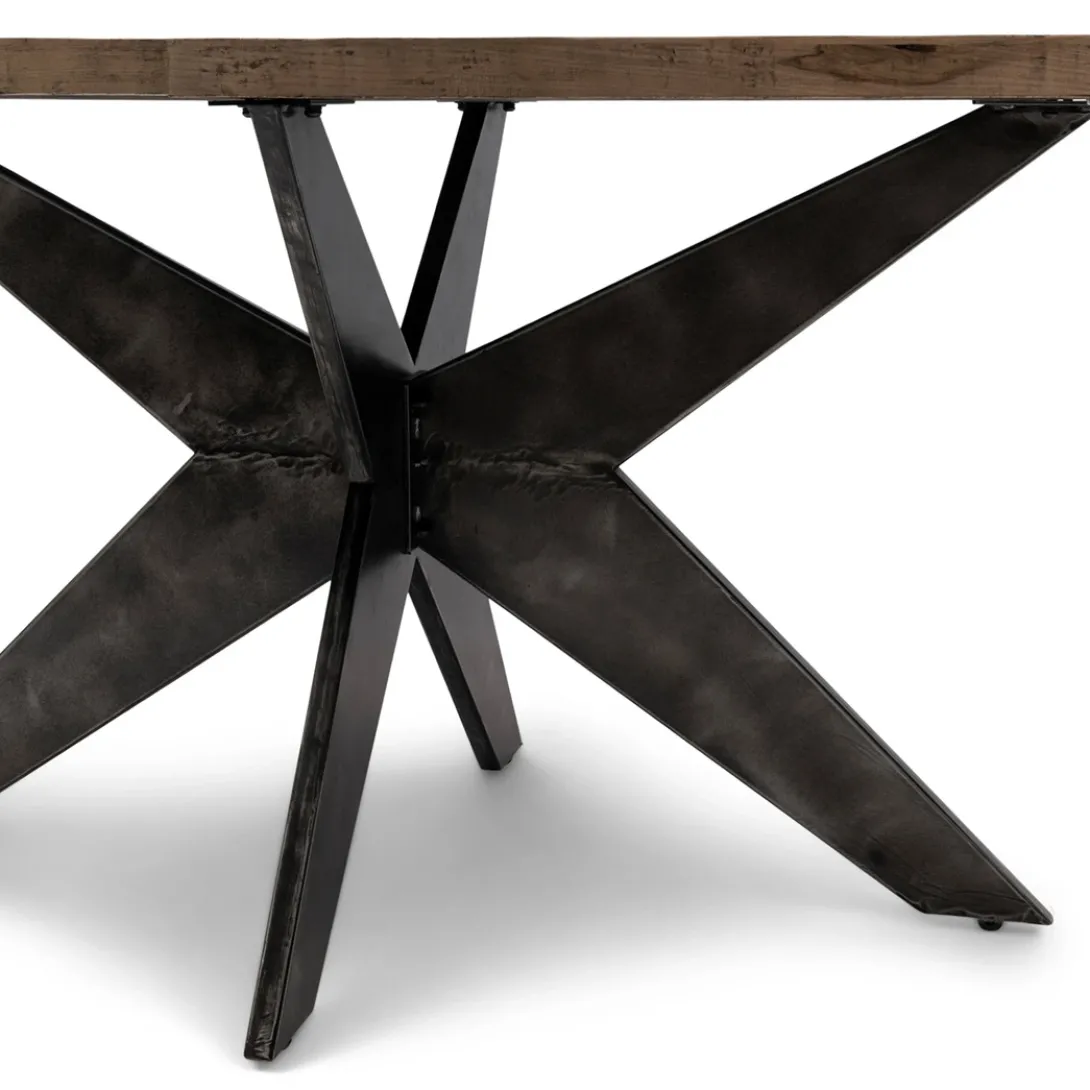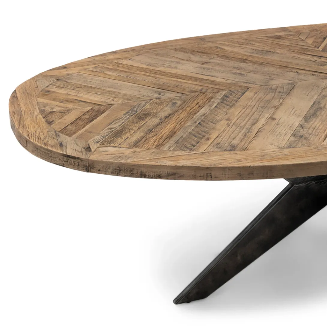 Een eettafel die stoer en klassiek combineert? Dan heb je het over de Falcon Crest-serie. Deze eettafels hebben namelijk een blad van stoer, ingelegd oud eikenhout, met een gekruist patroon Het onderstel is van matzwart metaal, waarin de kruisvorm terugkomt. De vorm van het tafelblad is ovaal.