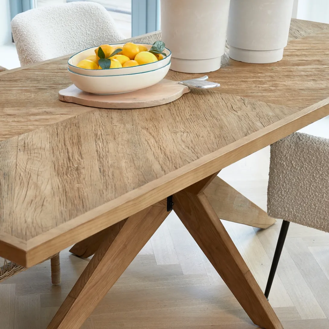 De Portland eetkamertafel is een rechthoekige, houten eettafel. Het tafelblad bestaat uit ingelegd, herbruikt eikenhout in een Hongaarse punt. Het hout is zeer divers qua kleurtonen en structuur. De gekruiste voet van deze eettafel is ook van massief eiken. De eettafel is ook verkrijgbaar in een ronde uitvoering.
