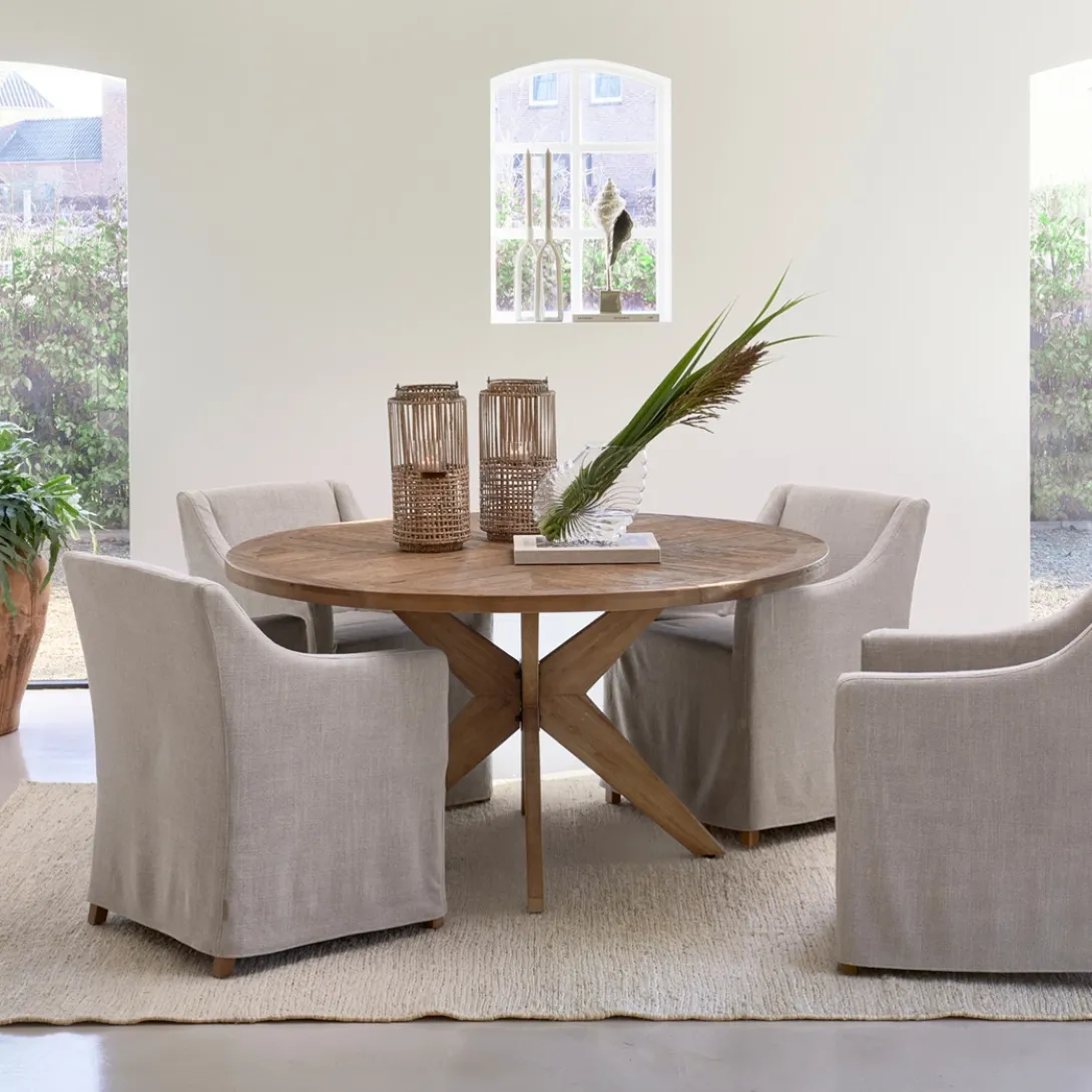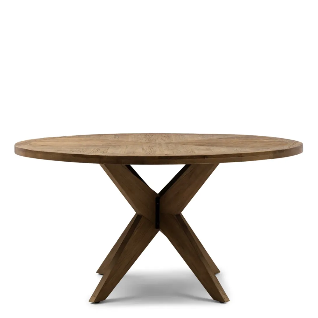 De Portland eetkamertafel is een robuuste, ronde eettafel. Het tafelblad bestaat uit hergebruikt, ingelegd eikenhout in een Hongaarse punt. Het hout is zeer divers qua structuur en kleurtonen. De gekruiste voet van deze eettafel is ook van massief eiken. De eettafel is ook verkrijgbaar in een rechthoekige uitvoering.