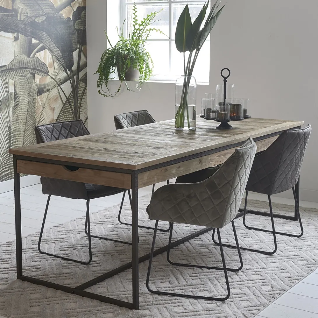 Een eigentijdse dinertafel met een robuust tafelblad van gerecycled iepenhout en sparrenhout. Het ijzeren frame geeft de tafel een industrieel karakter. De lades aan de zijkant bieden ruimte voor tafelaccessoires als placemats, onderzetters en eventueel tafellinnen. Een mooie aanvulling op de Shelter Island serie. Verkrijgbar in 200×90 en 180×90 cm.