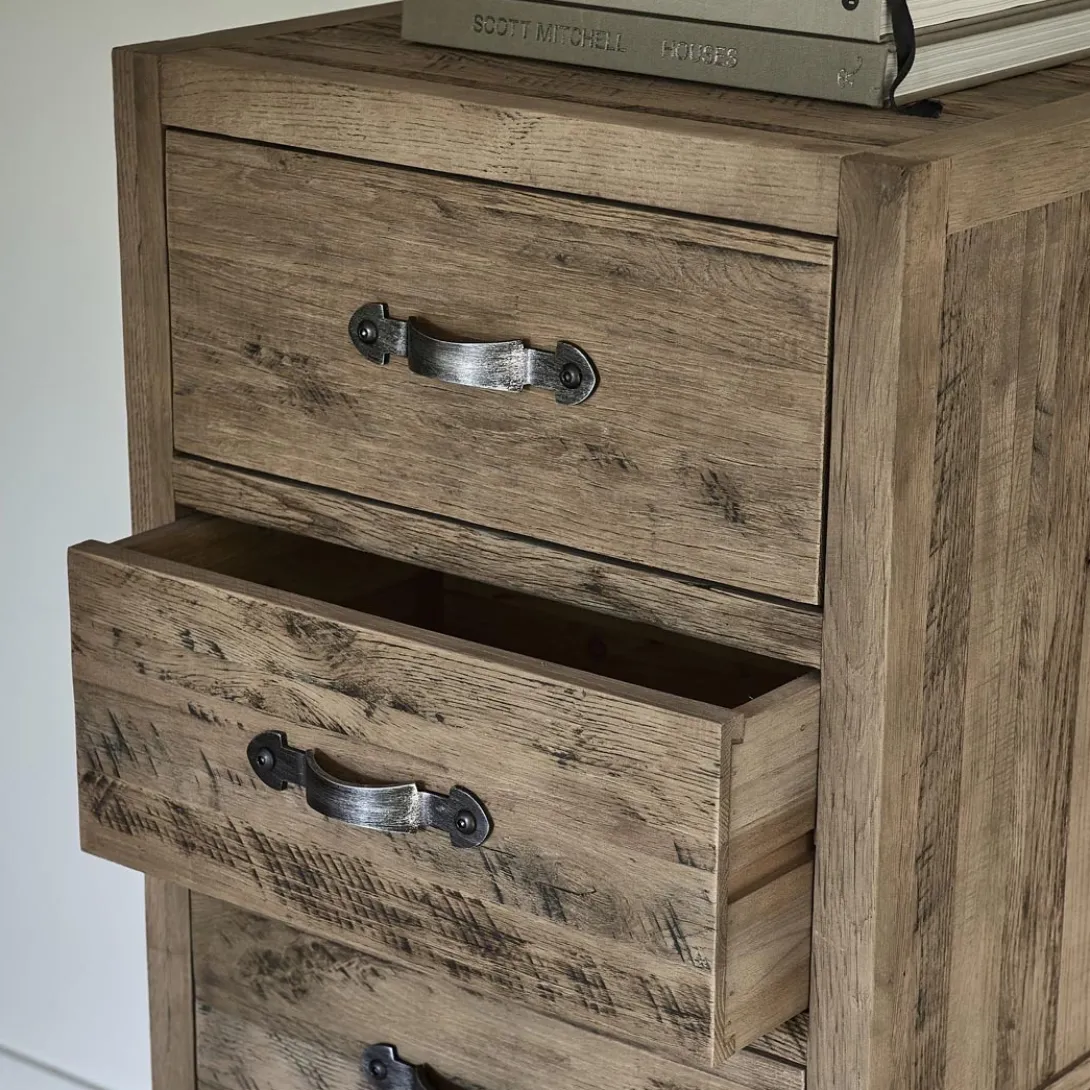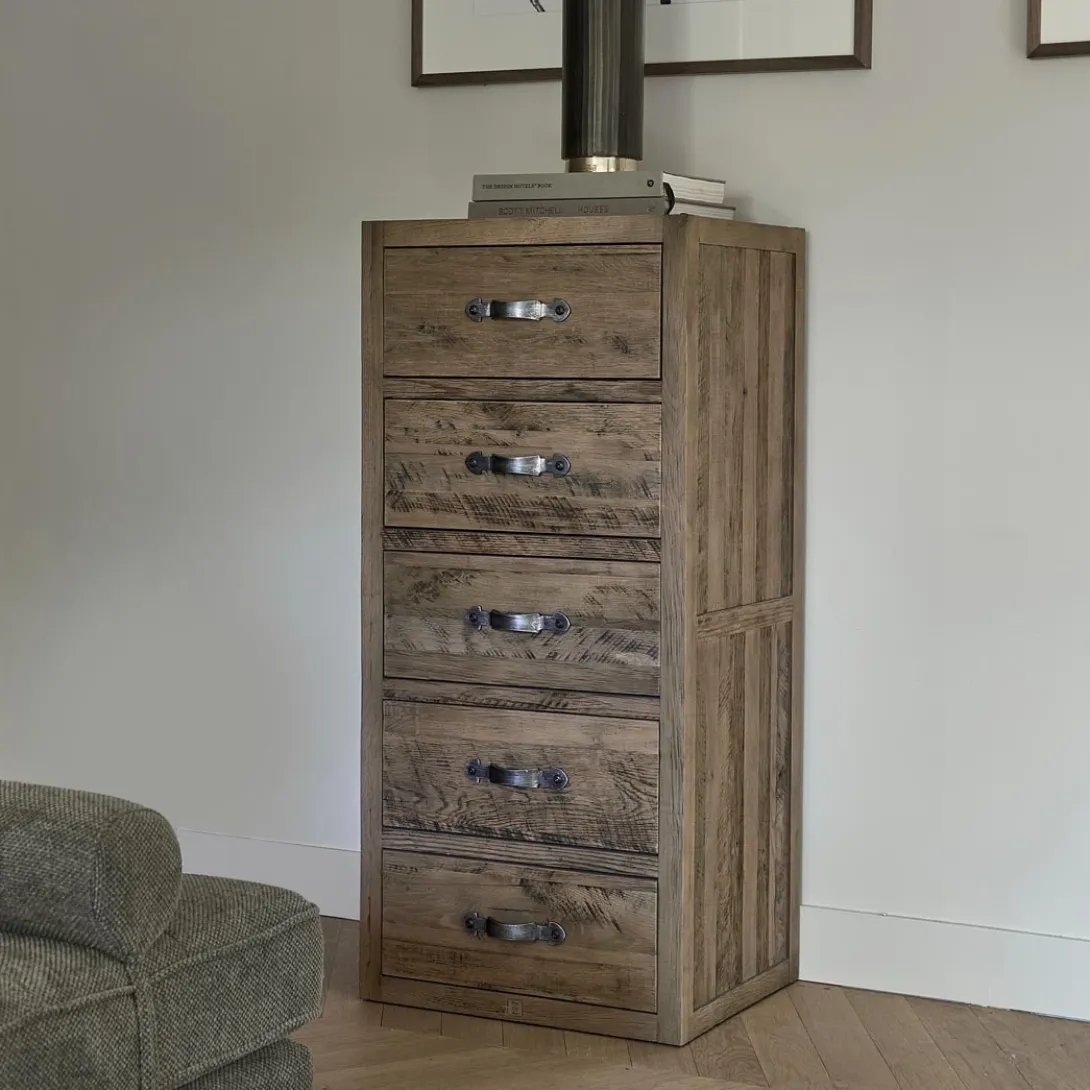 Deze hoge ladekast met maar liefst vijf grote lades is gemaakt van prachtig doorleefd eikenhout. Dat geeft de kast een stoere, natuurlijke uitstraling. De handgrepen hebben een klassieke gebogen vorm, maar zijn gemaakt van geborsteld rvs. Verkrijgbaar in verschillende formaten.