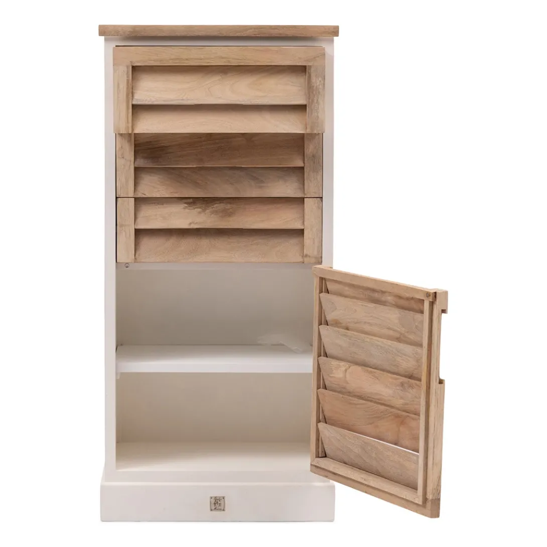 Dit is een ladekast met drie lades en een deur, zo is het een handig meubel in de slaapkamer voor bijvoorbeeld kledingstukken. Deze ladekast behoort tot de Pacifica-serie. Een opvallende lijn met meubels met ‘shutter-look’ van naturel en wit mangohout, met onzichtbare handgreep en softclose-mechanisme. In deze serie zijn verschillende meubels verkrijgbaar.