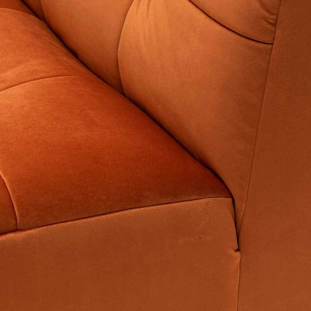 Spelen met maten en vormen, dat kan met modulaire bank The Jones. Dit is de linkerhoek met armleuning van deze smaakvolle elementenbank. De bank heeft een wat lagere zit en valt op door de bekleding, die gecapitonneerd lijkt, maar daarbij niet de kenmerkende knoop heeft.