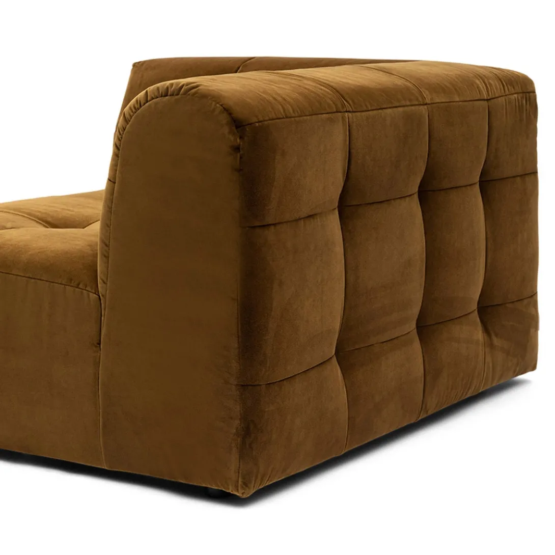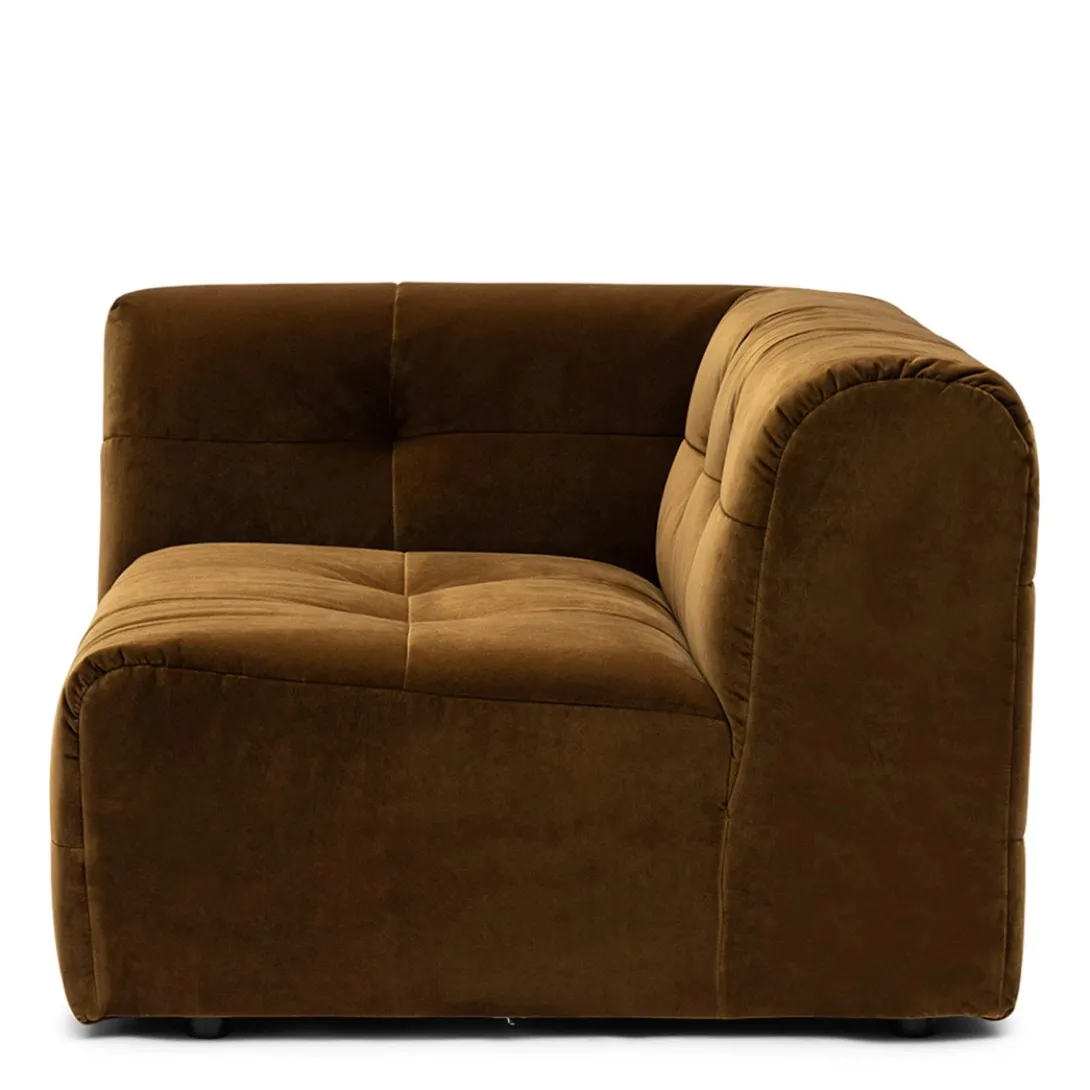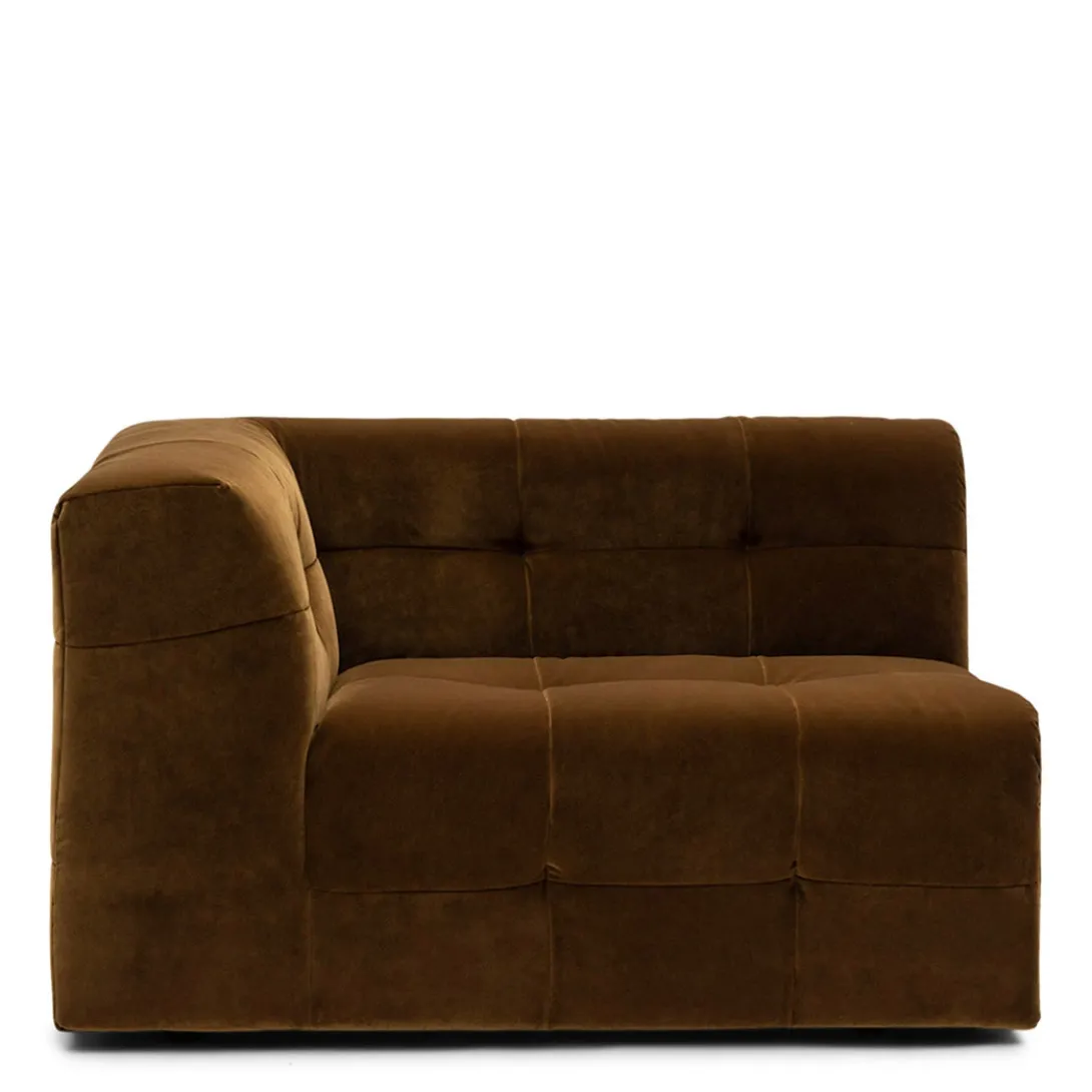 Spelen met maten en vormen, dat kan met modulaire bank The Jones. Dit is de linkerhoek met armleuning van deze smaakvolle elementenbank. De bank heeft een wat lagere zit en valt op door de bekleding, die gecapitonneerd lijkt, maar daarbij niet de kenmerkende knoop heeft.
