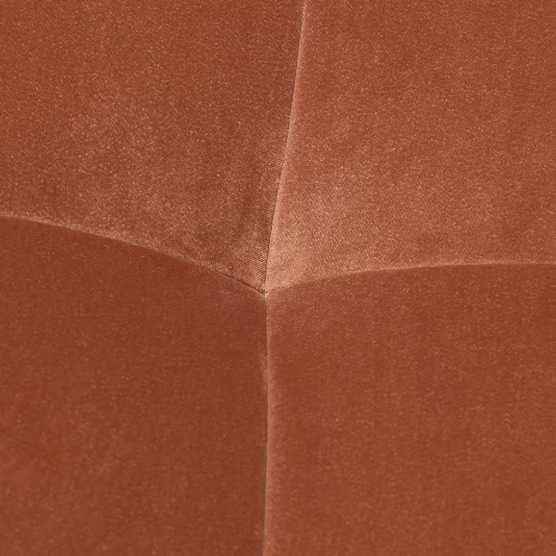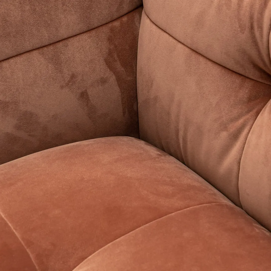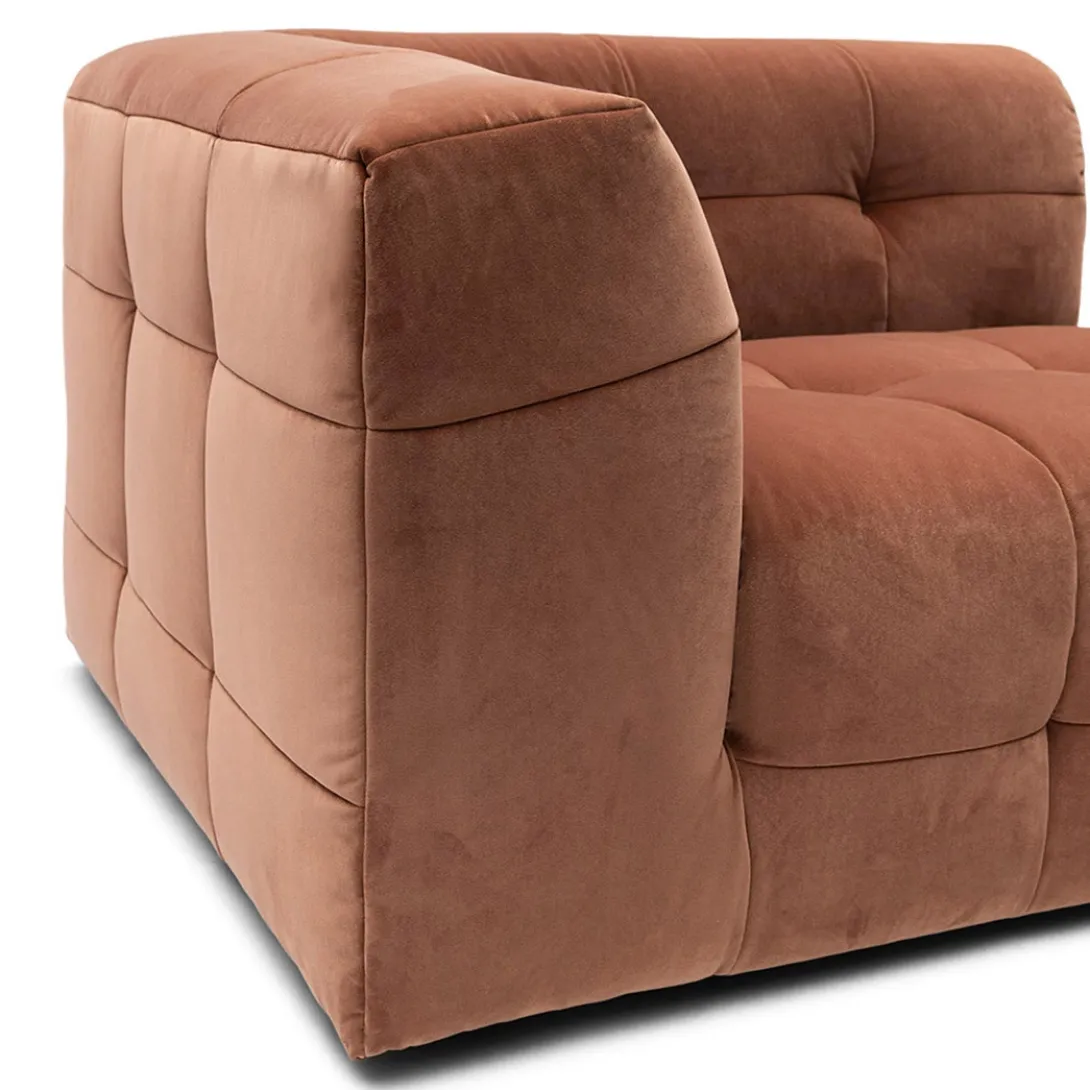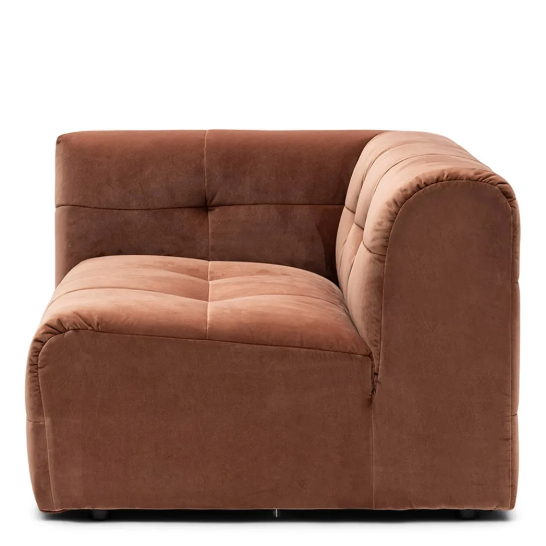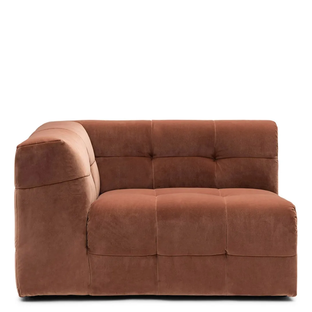 Spelen met maten en vormen, dat kan met modulaire bank The Jones. Dit is de linkerhoek met armleuning van deze smaakvolle elementenbank. De bank heeft een wat lagere zit en valt op door de bekleding, die gecapitonneerd lijkt, maar daarbij niet de kenmerkende knoop heeft.